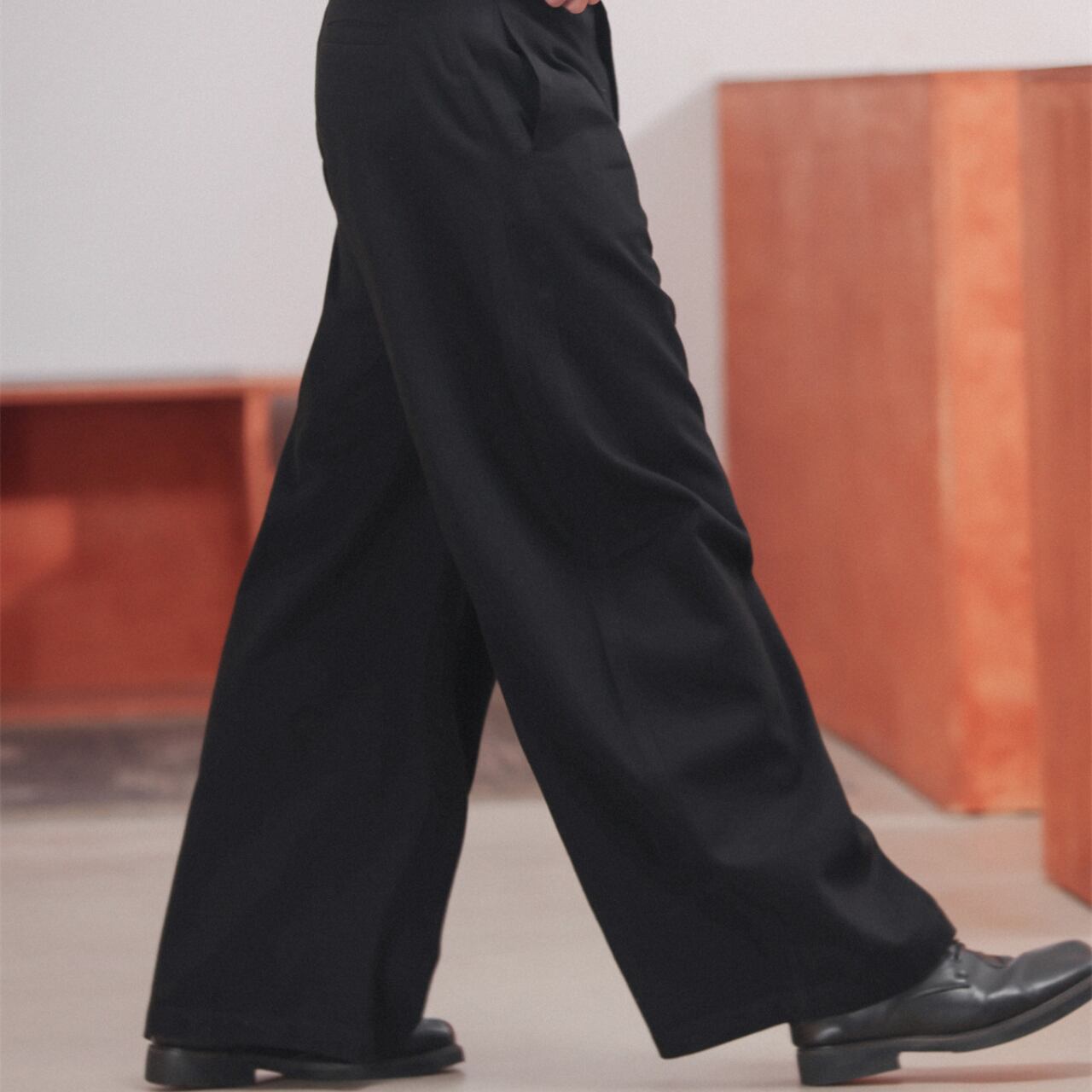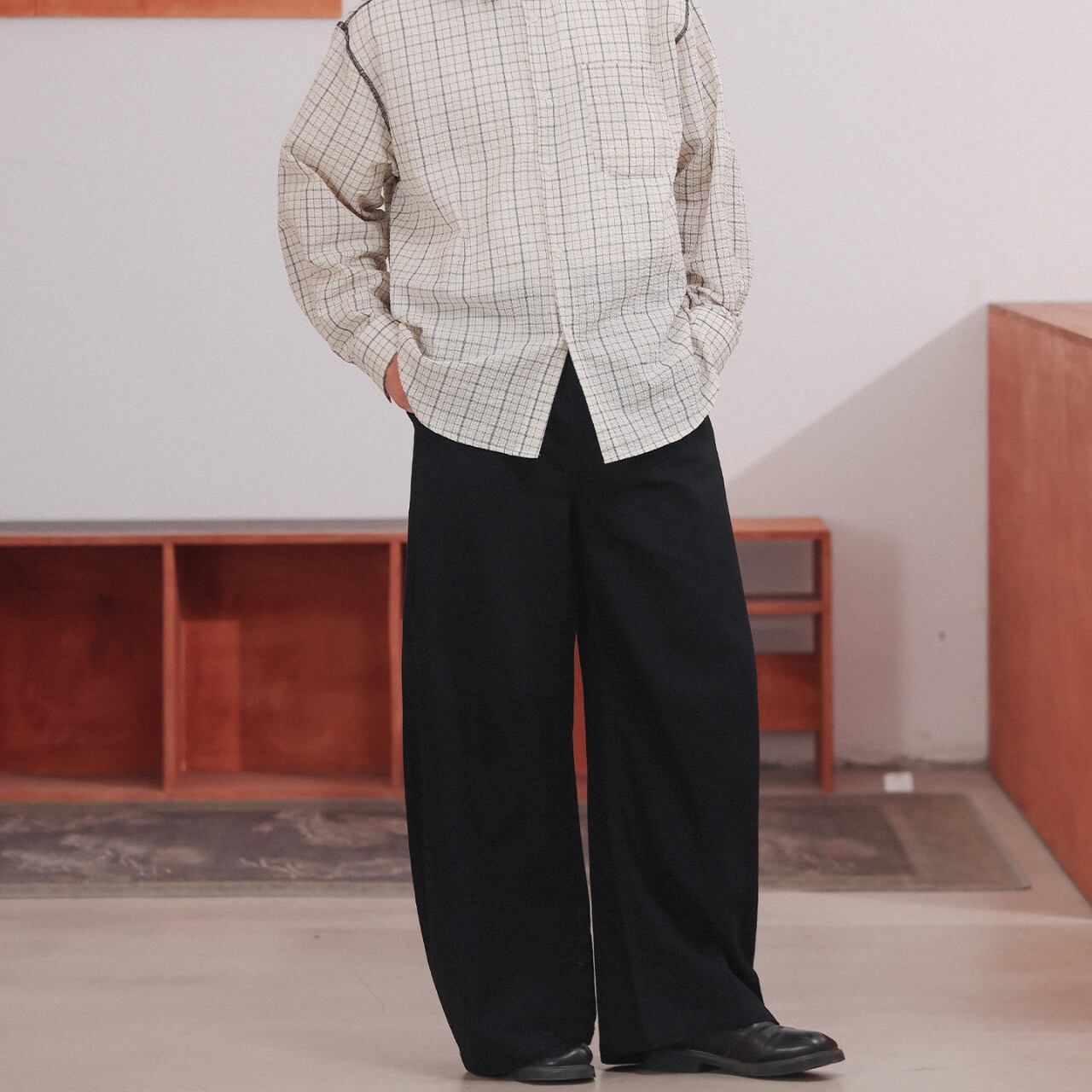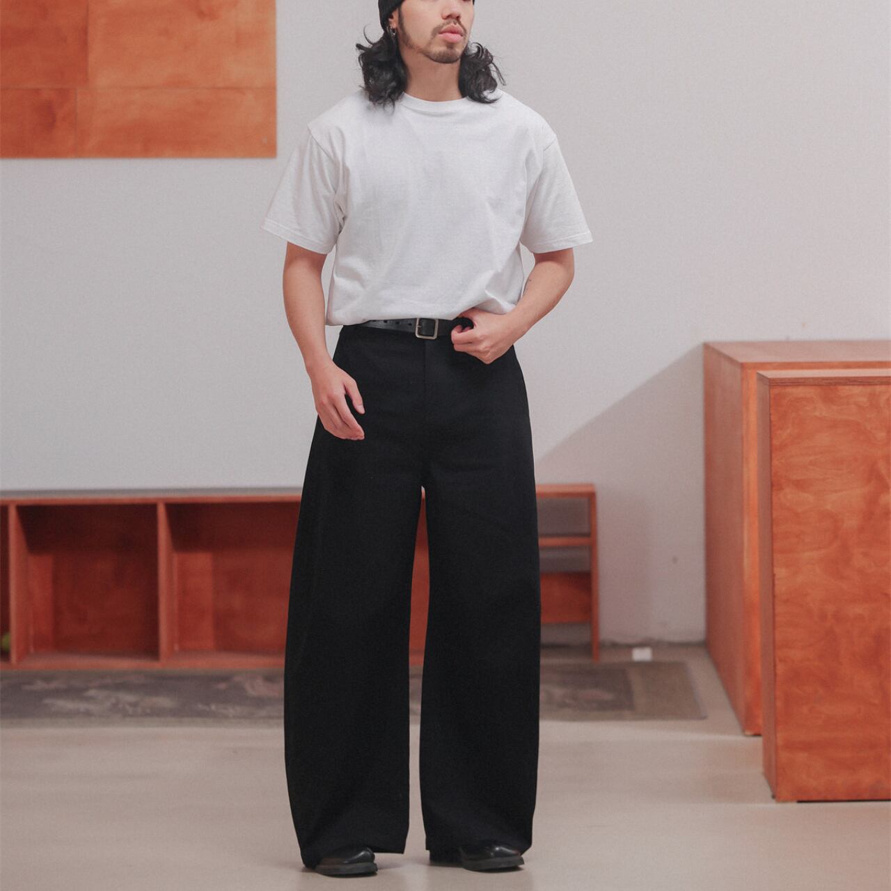 ミニマルなブラックカラーと、計算されたワイドシルエットが印象的なカーブドパンツ。腰回りは程よくフィットし、太ももから裾にかけて自然な弧を描くカーブラインが、脚のラインを美しく見せてくれます。Tシャツやシャツをタックインするだけで、都会的で洗練されたスタイリングが完成。通年で活躍する一本です。