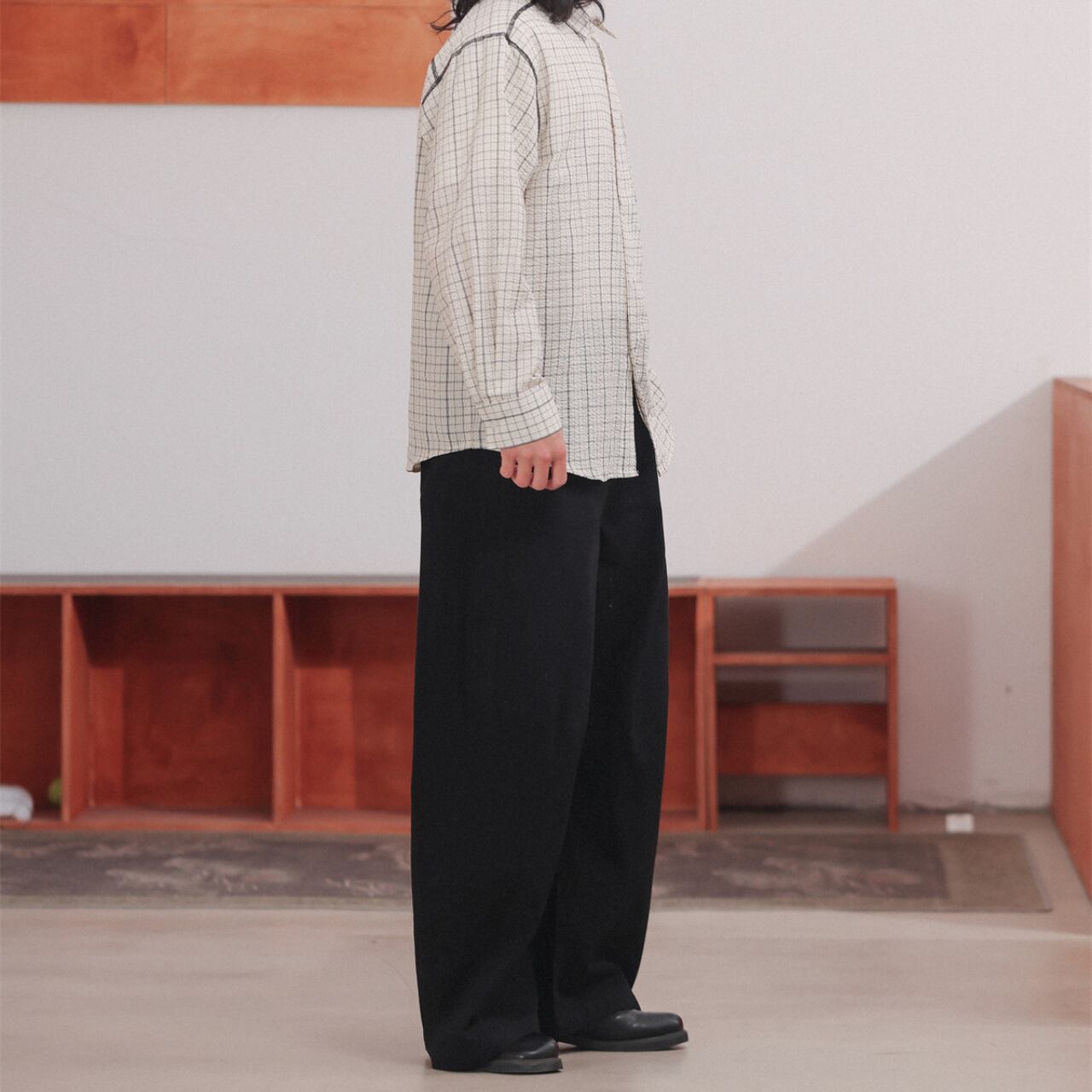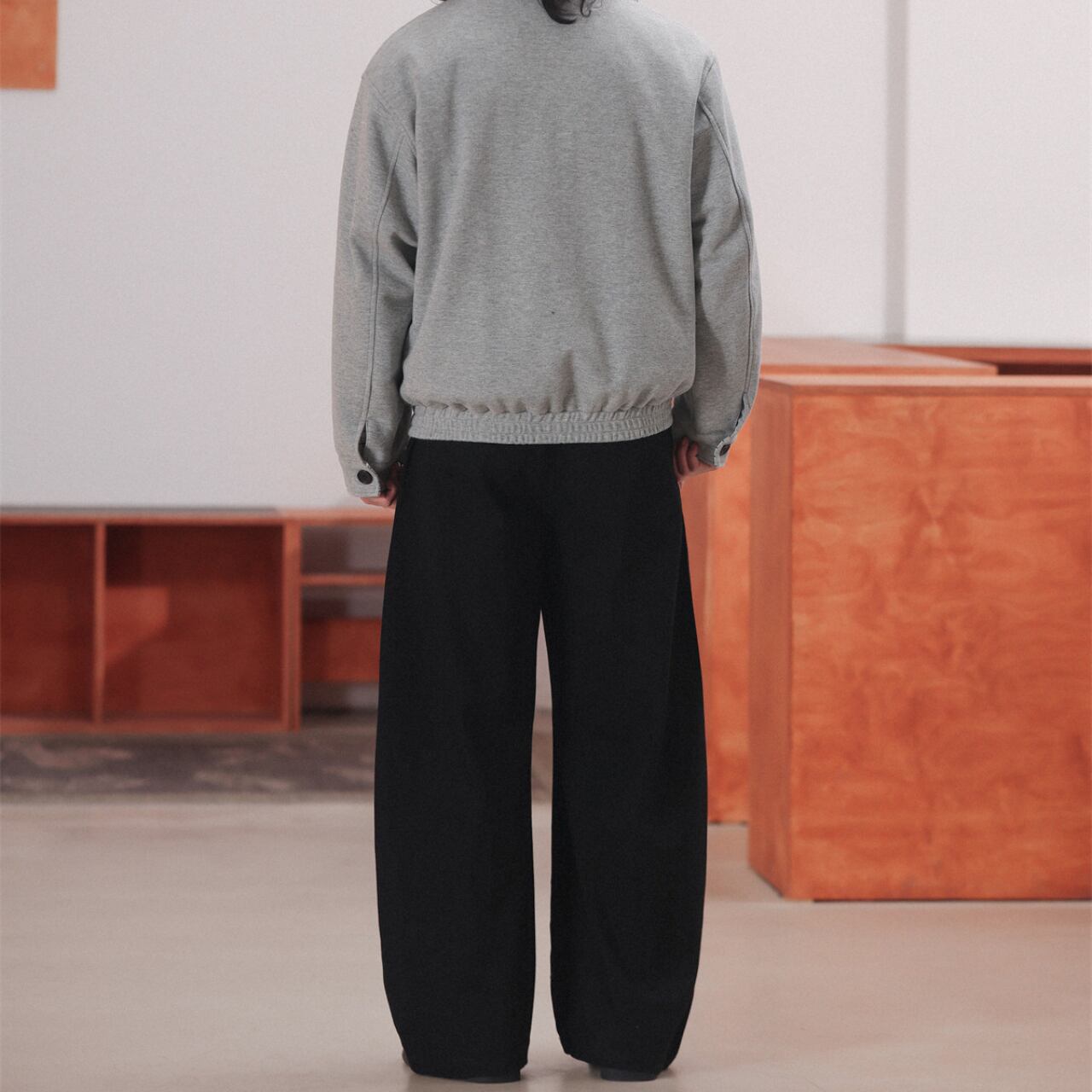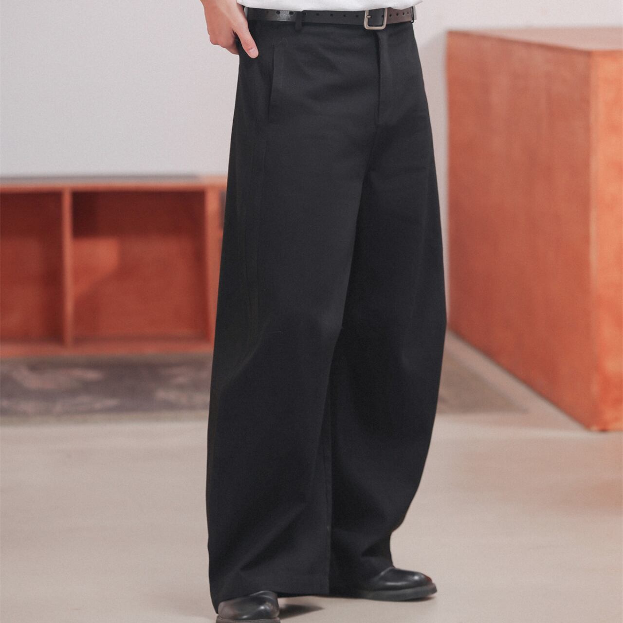 ミニマルなブラックカラーと、計算されたワイドシルエットが印象的なカーブドパンツ。腰回りは程よくフィットし、太ももから裾にかけて自然な弧を描くカーブラインが、脚のラインを美しく見せてくれます。Tシャツやシャツをタックインするだけで、都会的で洗練されたスタイリングが完成。通年で活躍する一本です。