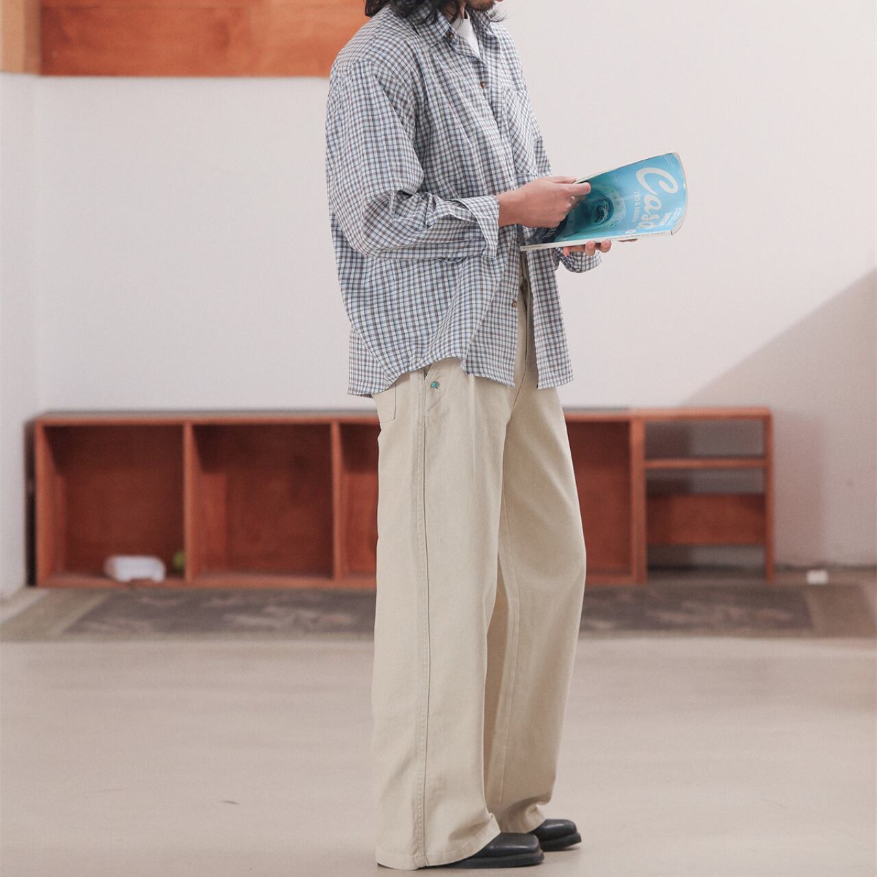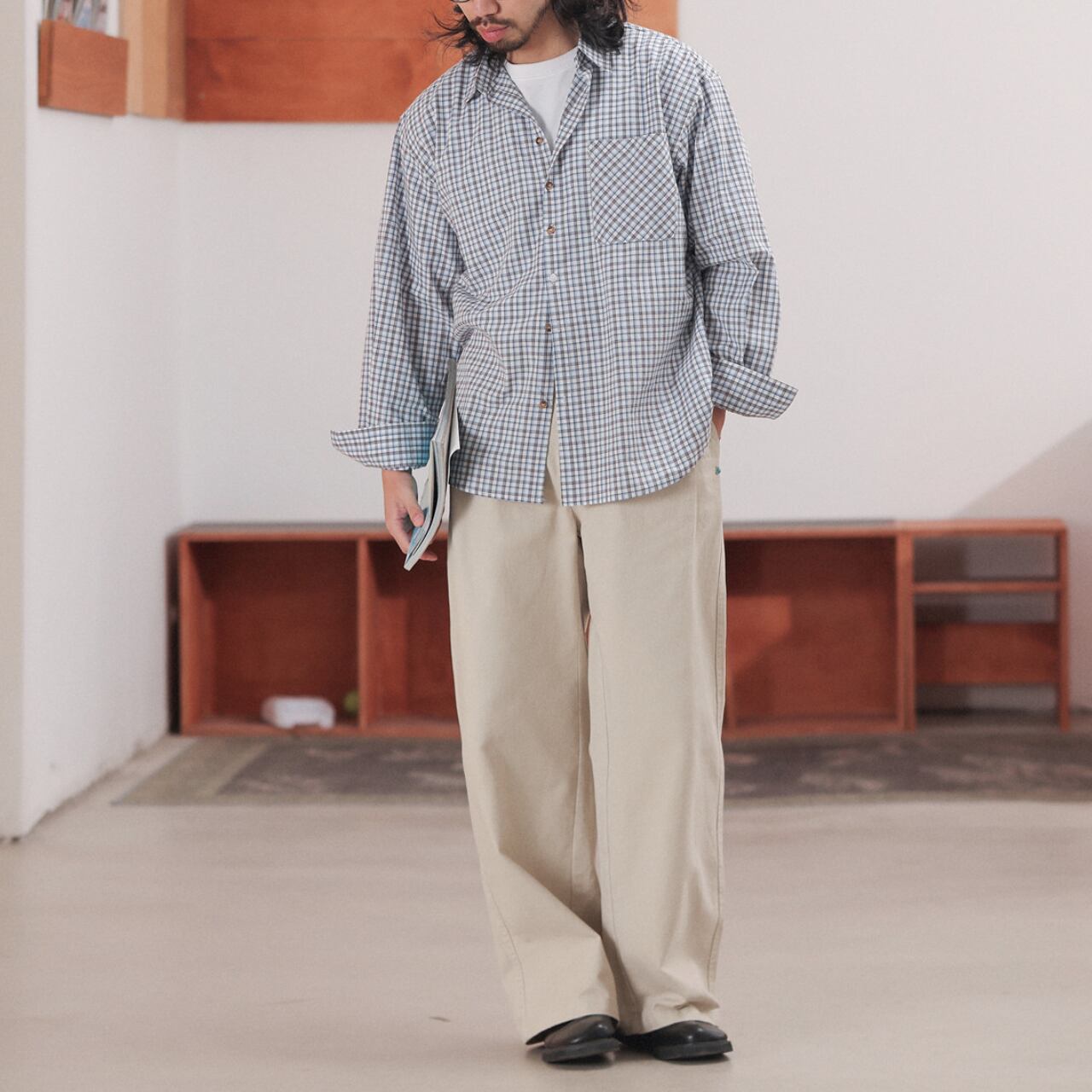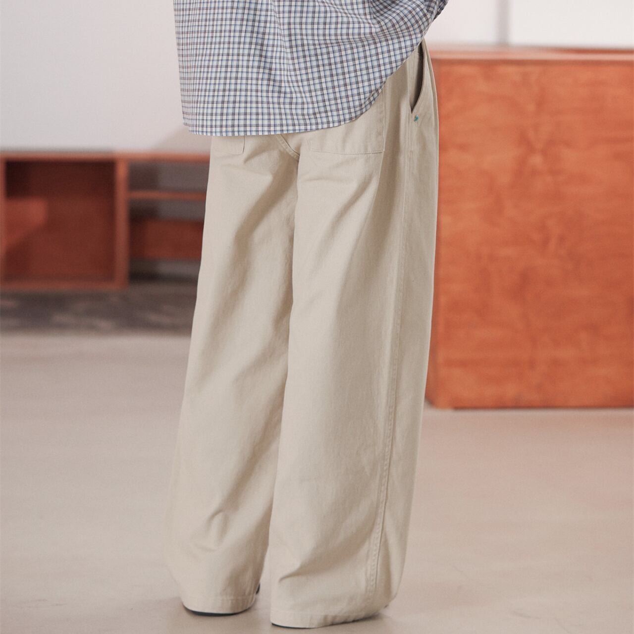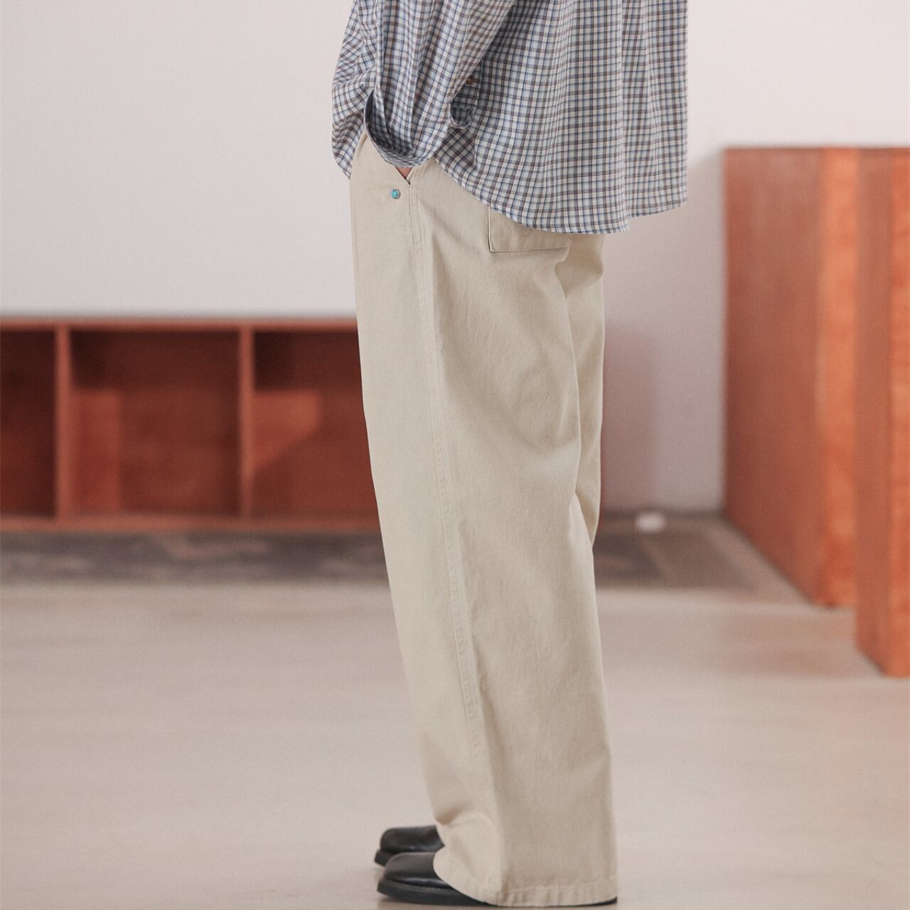 程よく力の抜けたストレートシルエットが魅力のコットンパンツ。腰まわりから裾まで自然に落ちるラインで、ワイドながらも野暮ったさのないバランスに仕上げています。柔らかなコットン100%素材を使用し、穿き心地は軽やか。チェックシャツやスウェット、ブルゾンなど、合わせるトップスを選ばず、日常のスタイリングにすっと馴染みます。シンプルだからこそ長く使える、ベーシックボトムです。