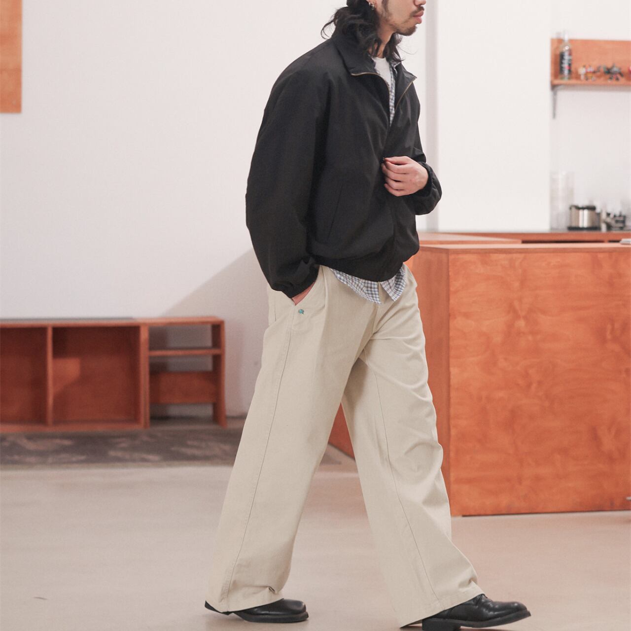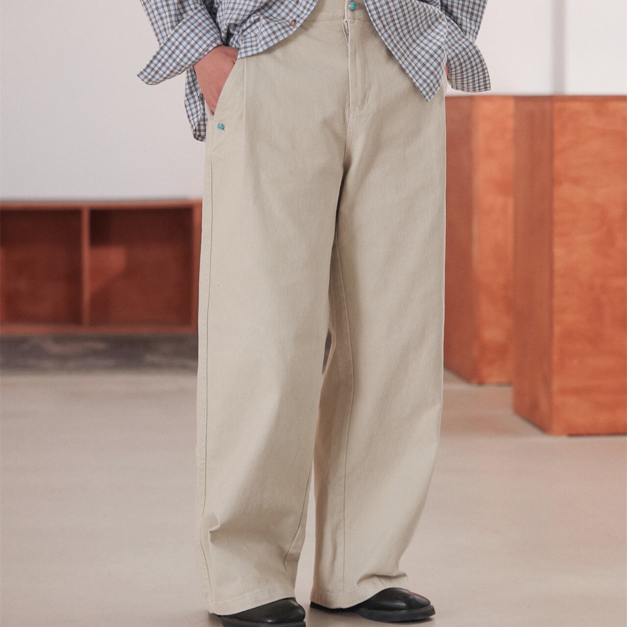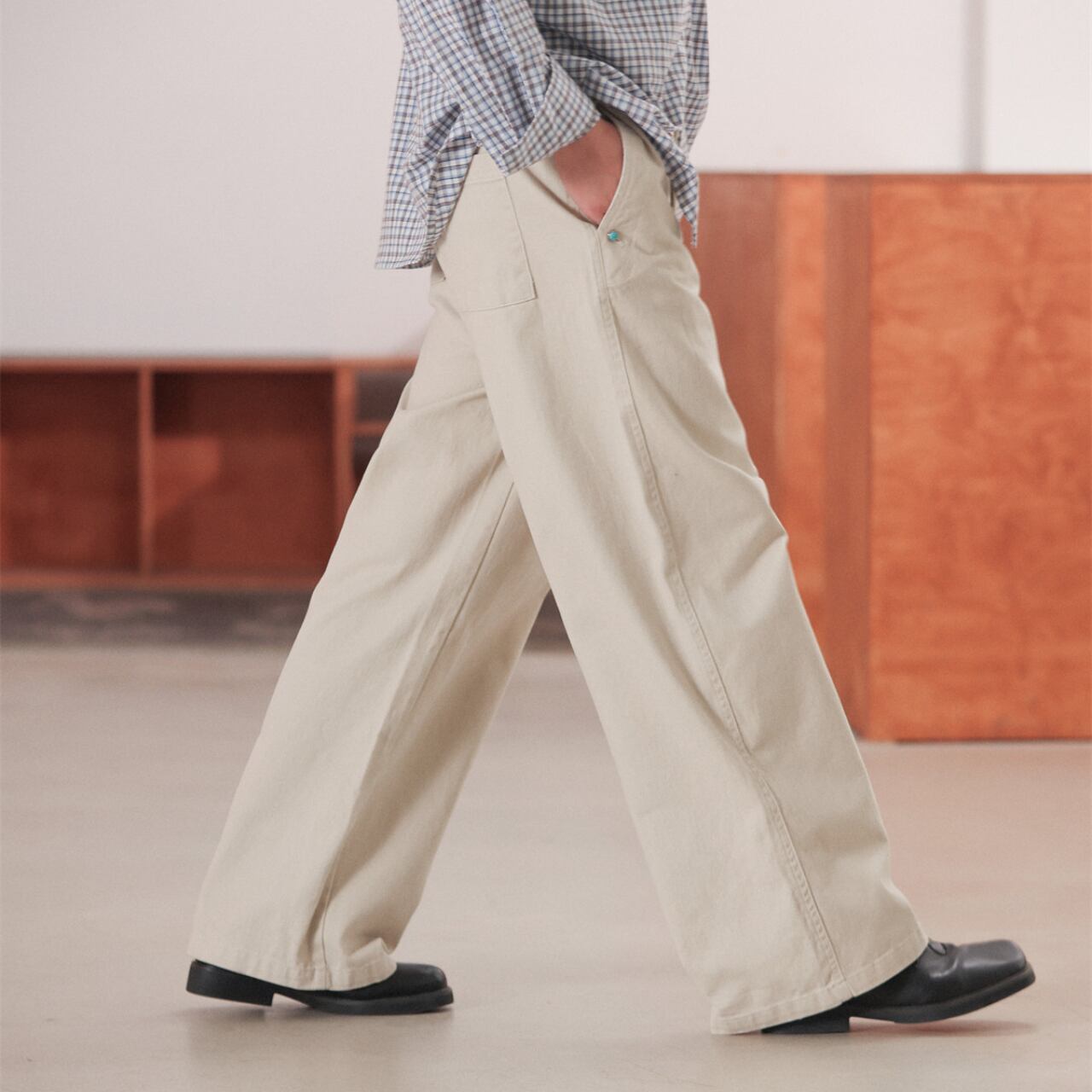 程よく力の抜けたストレートシルエットが魅力のコットンパンツ。腰まわりから裾まで自然に落ちるラインで、ワイドながらも野暮ったさのないバランスに仕上げています。柔らかなコットン100%素材を使用し、穿き心地は軽やか。チェックシャツやスウェット、ブルゾンなど、合わせるトップスを選ばず、日常のスタイリングにすっと馴染みます。シンプルだからこそ長く使える、ベーシックボトムです。