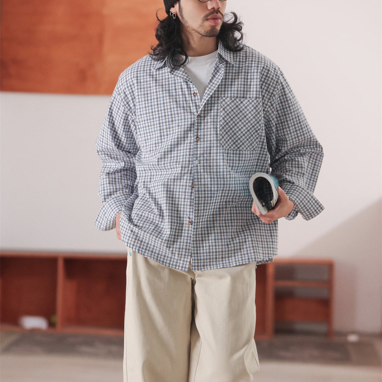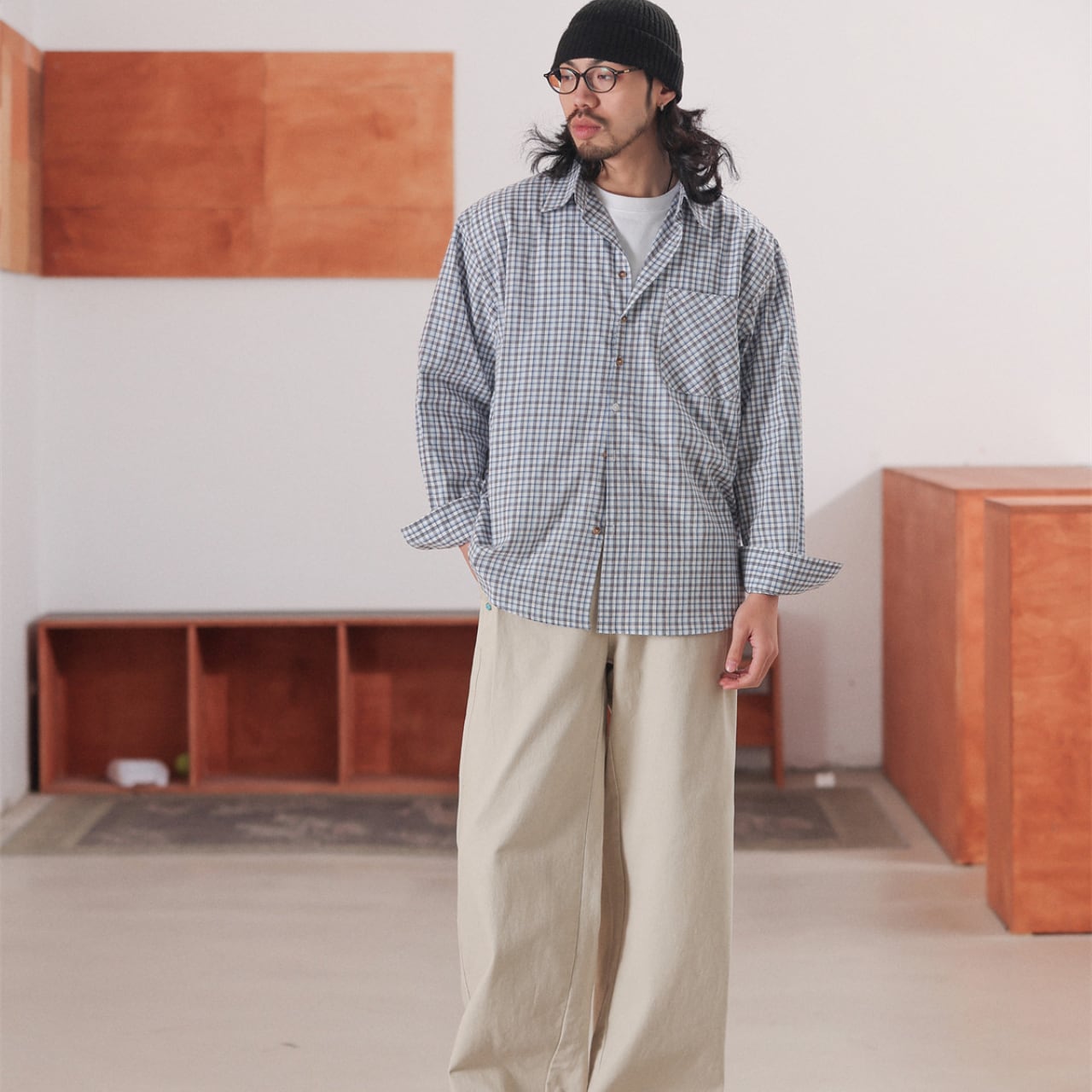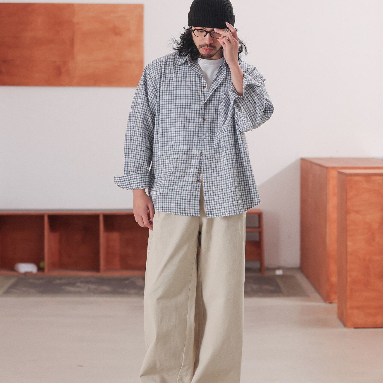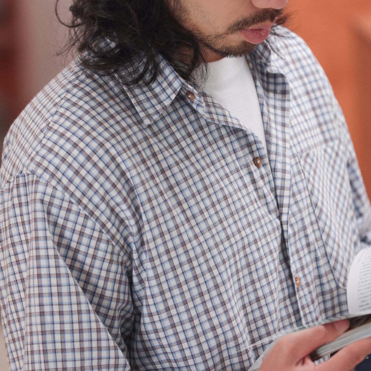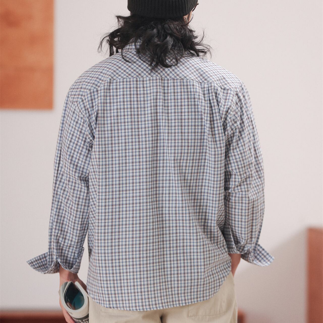 ややワイドなシルエットが印象的な、コットン100%のチェックシャツ。肩の力を抜いた自然な落ち感と、細かなチェック柄が程よいアクセントになり、1枚でもレイヤードでも使いやすい仕上がりです。Tシャツの上に羽織っても、ボタンを留めてクリーンに着ても雰囲気が出る万能さが魅力。ワイドパンツやデニムと合わせた、リラックスしたシティスタイルにおすすめです。