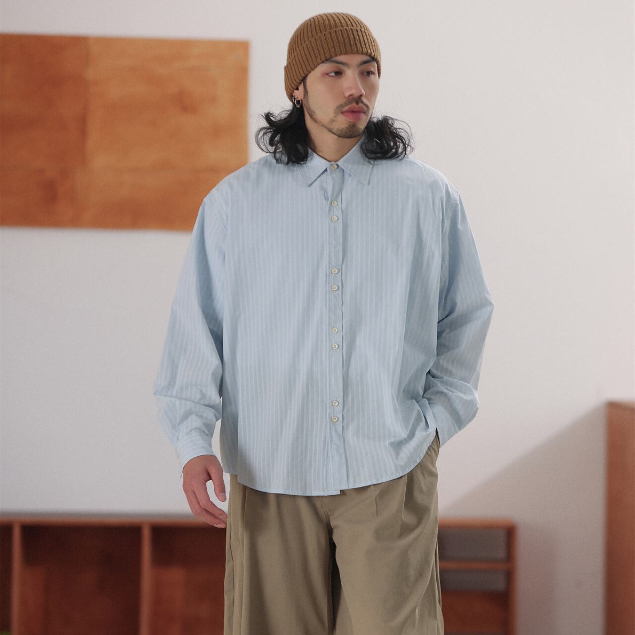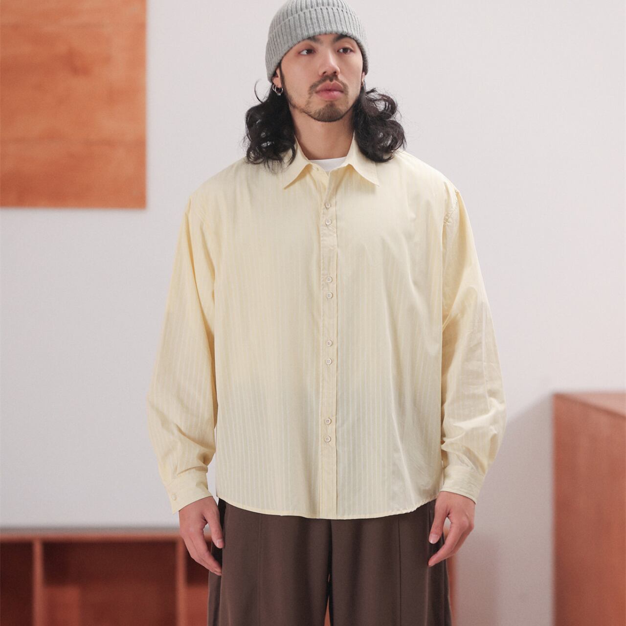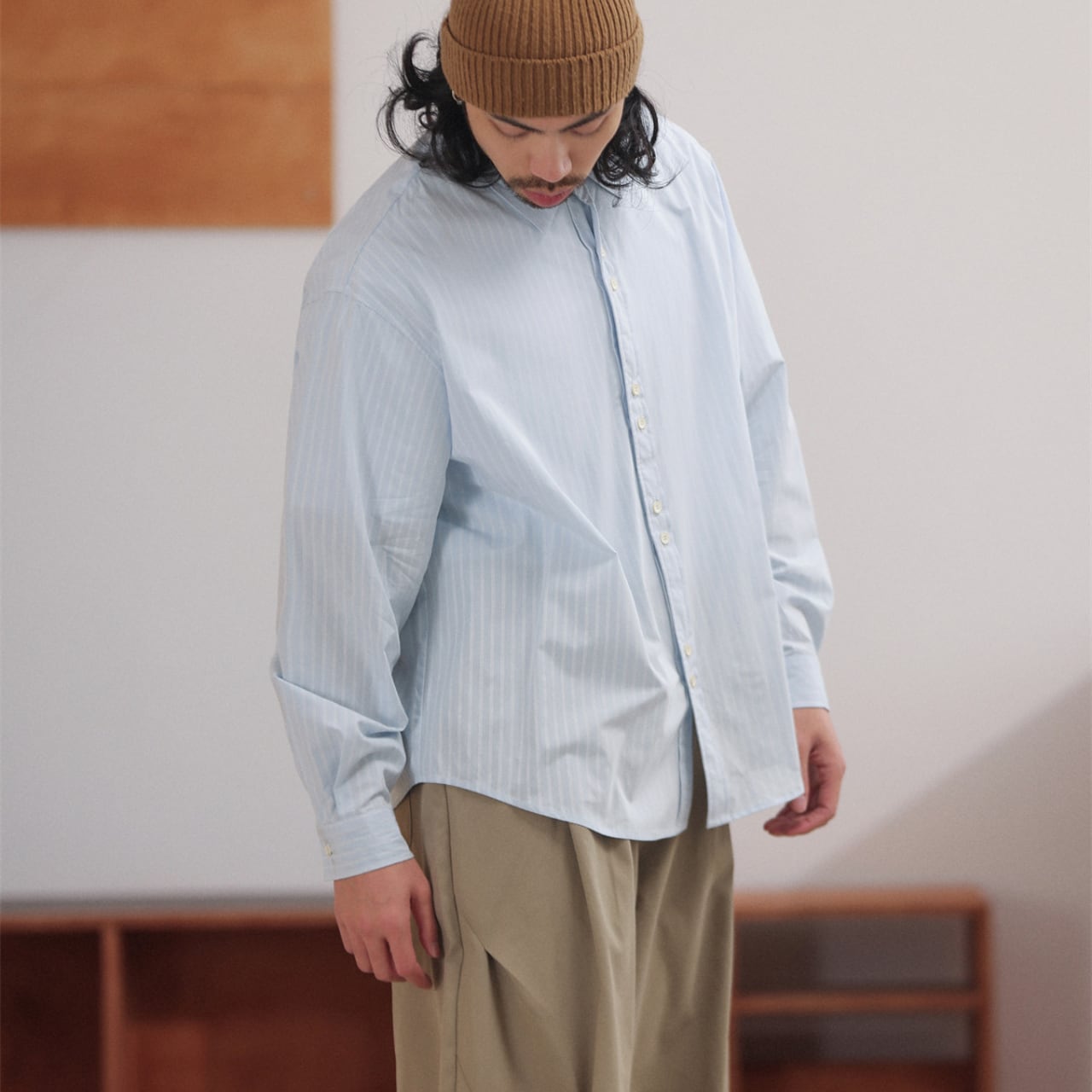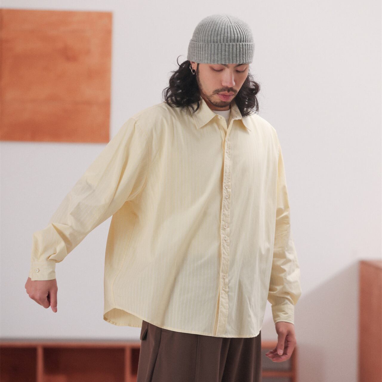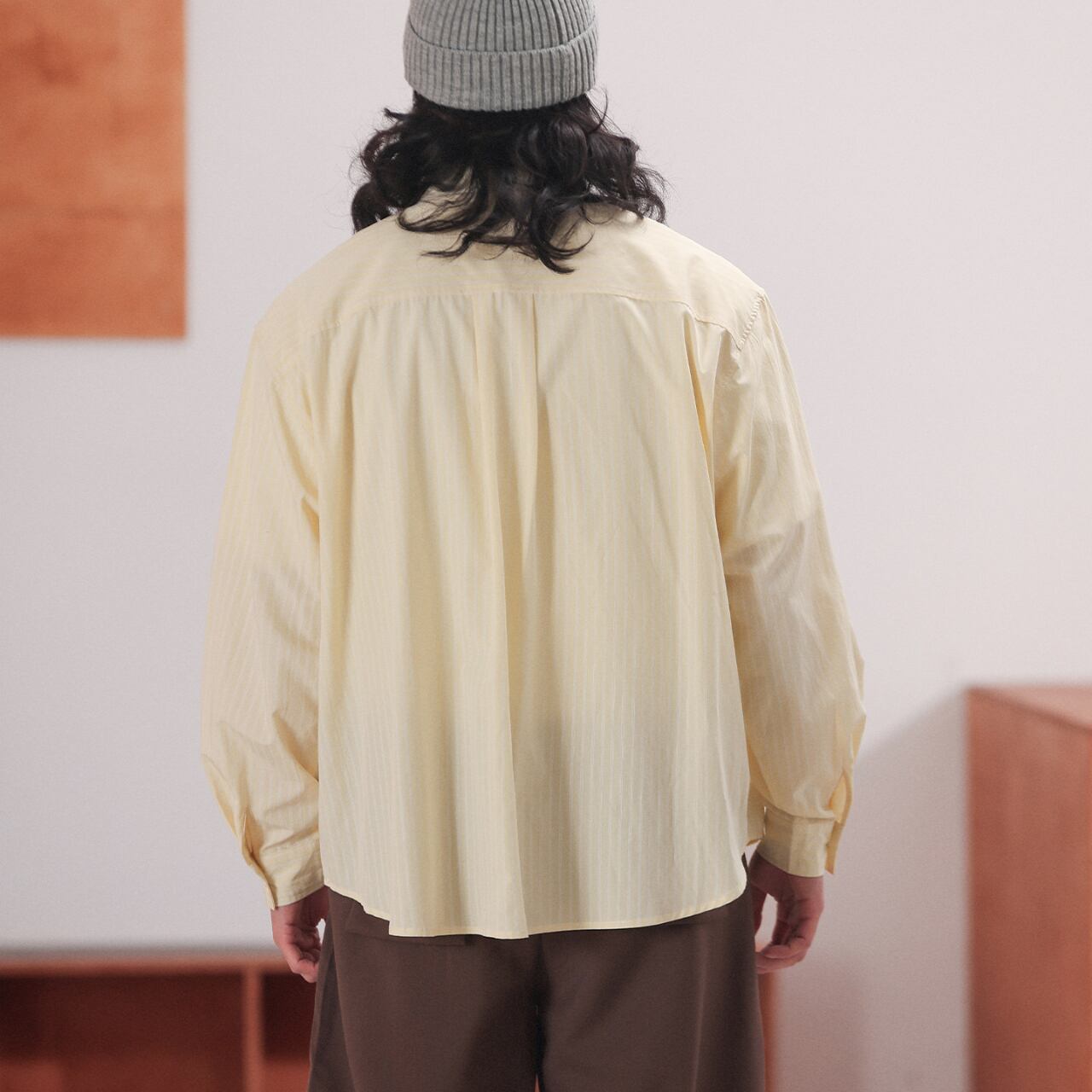 空気を含んだような軽やかな素材感が魅力のストライプシャツ。コットンとリヨセルをブレンドした生地は、なめらかな肌触りと自然な落ち感が特徴です。身幅にゆとりを持たせたルーズフィットで、一枚で着ても雰囲気が出る仕上がり。淡いカラーと繊細なストライプ柄が、スタイリングに柔らかさをプラスし、ワイドパンツやスラックスと合わせたリラックススタイルにおすすめです。