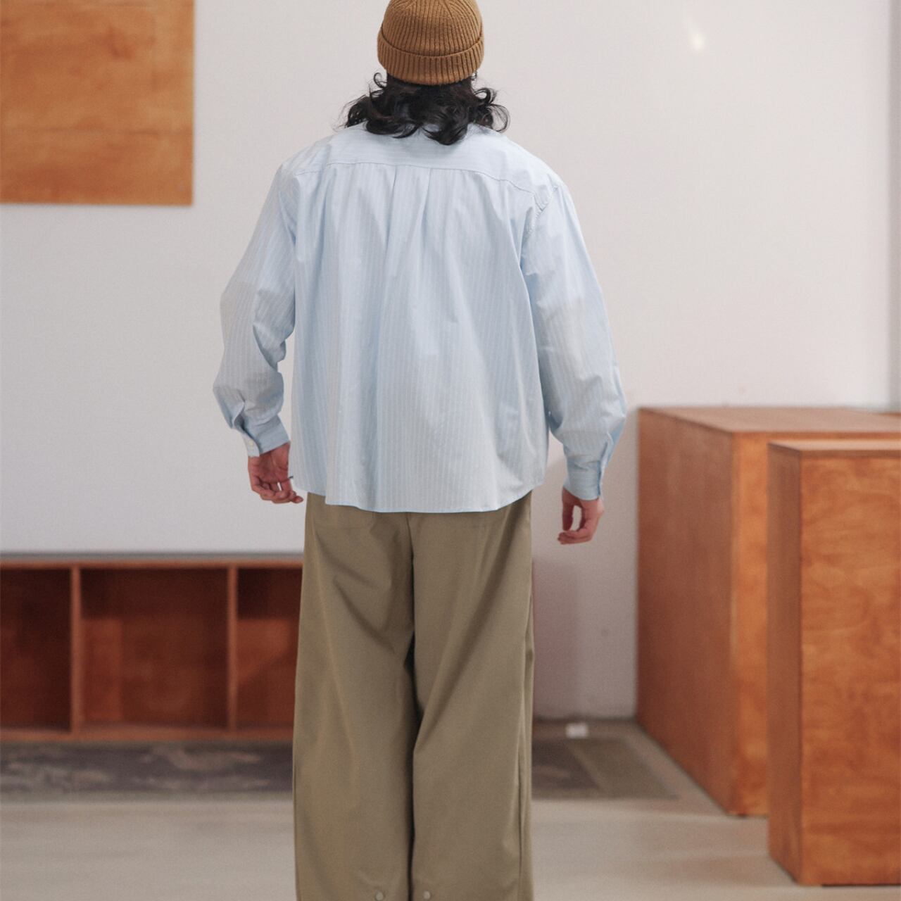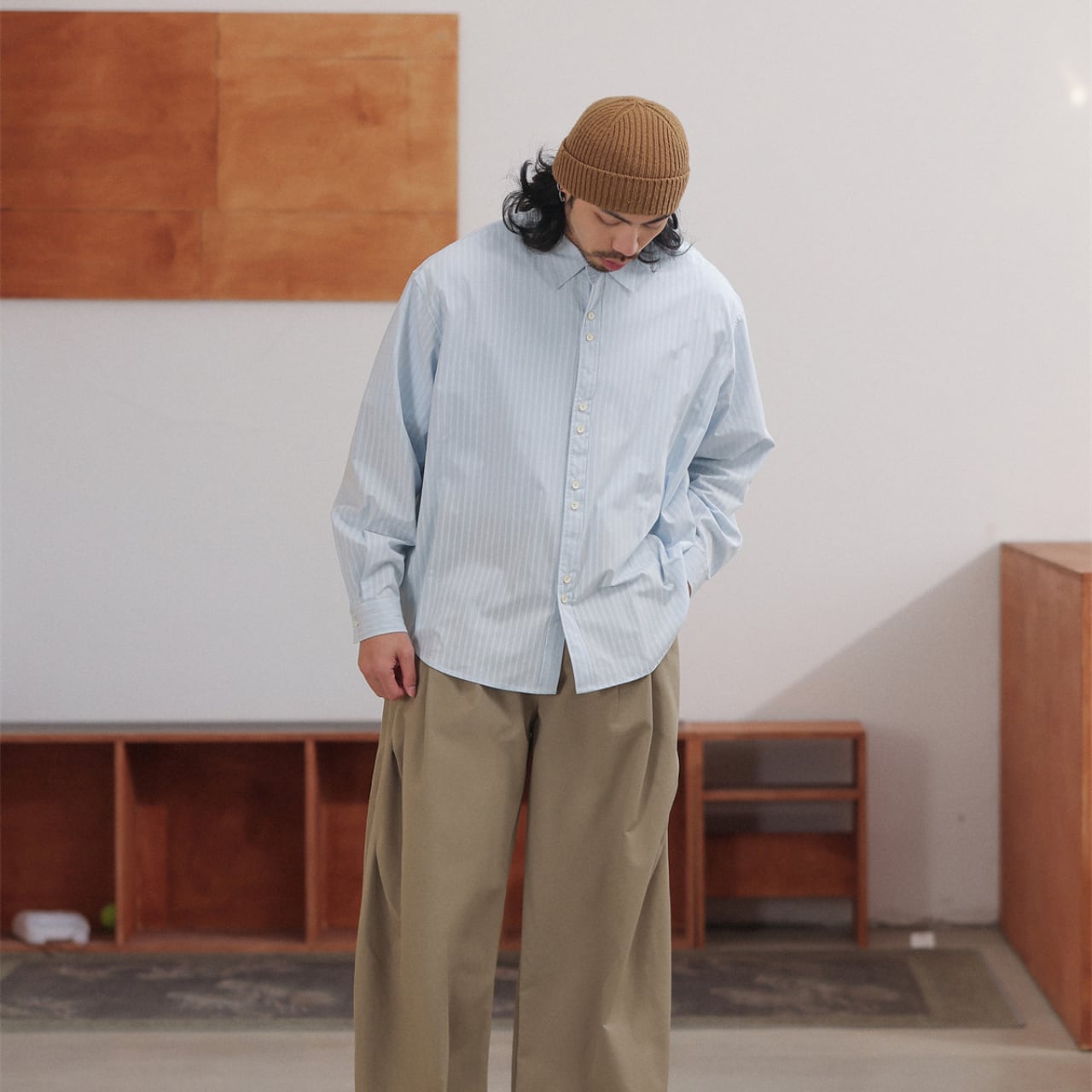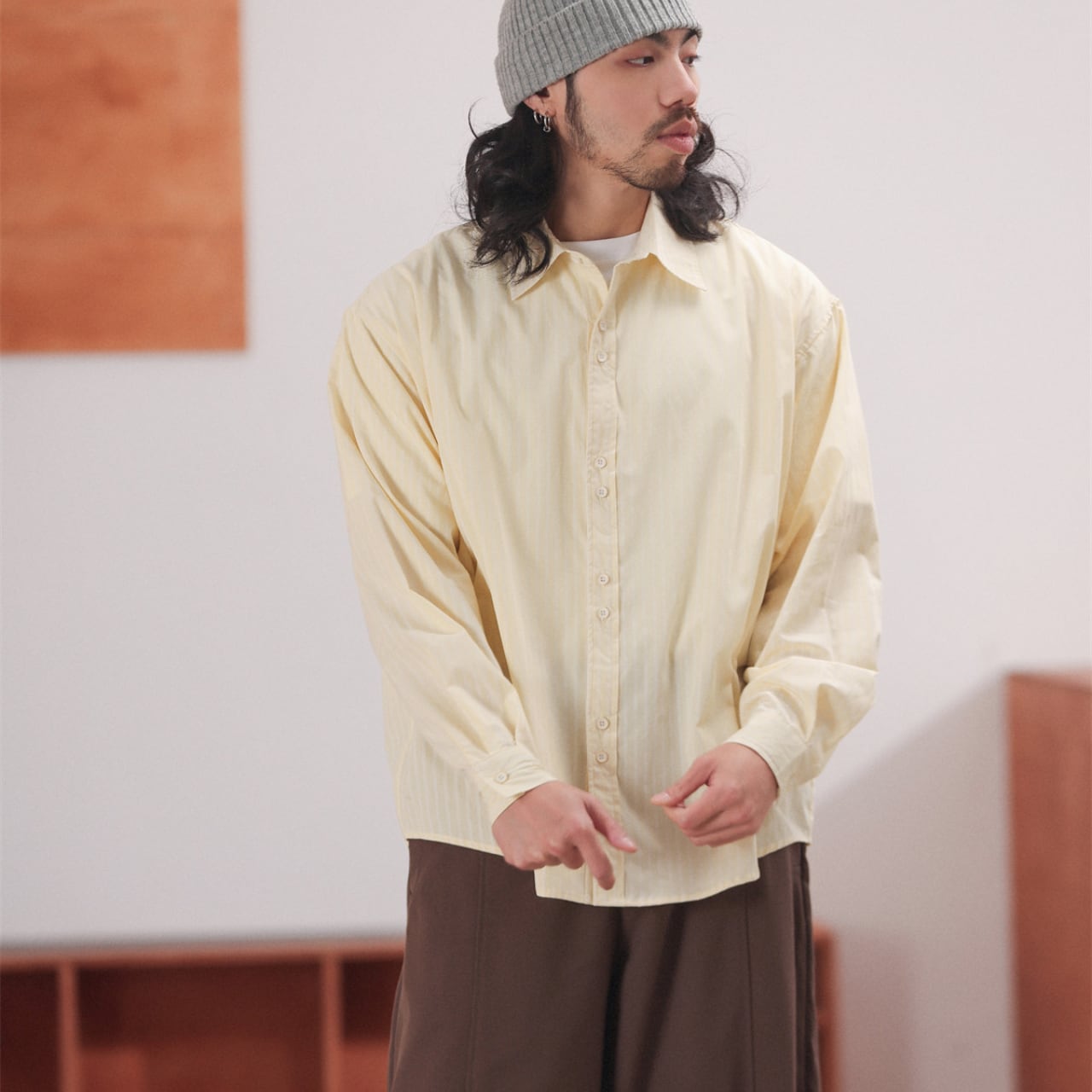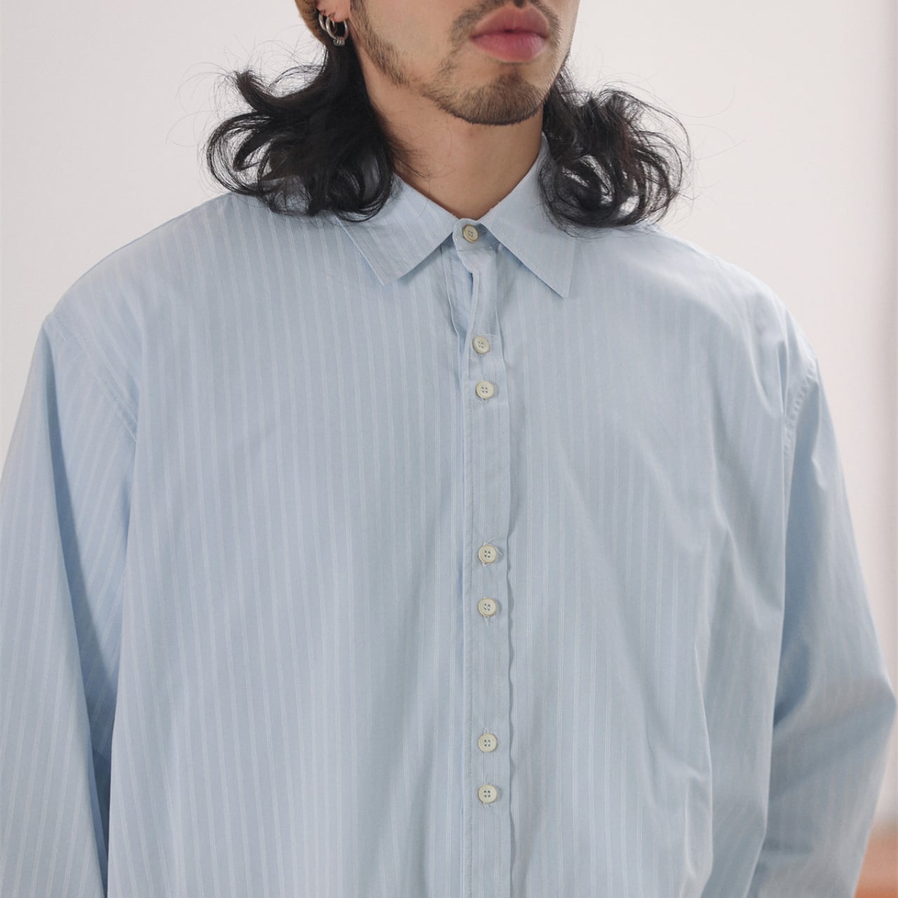 空気を含んだような軽やかな素材感が魅力のストライプシャツ。コットンとリヨセルをブレンドした生地は、なめらかな肌触りと自然な落ち感が特徴です。身幅にゆとりを持たせたルーズフィットで、一枚で着ても雰囲気が出る仕上がり。淡いカラーと繊細なストライプ柄が、スタイリングに柔らかさをプラスし、ワイドパンツやスラックスと合わせたリラックススタイルにおすすめです。