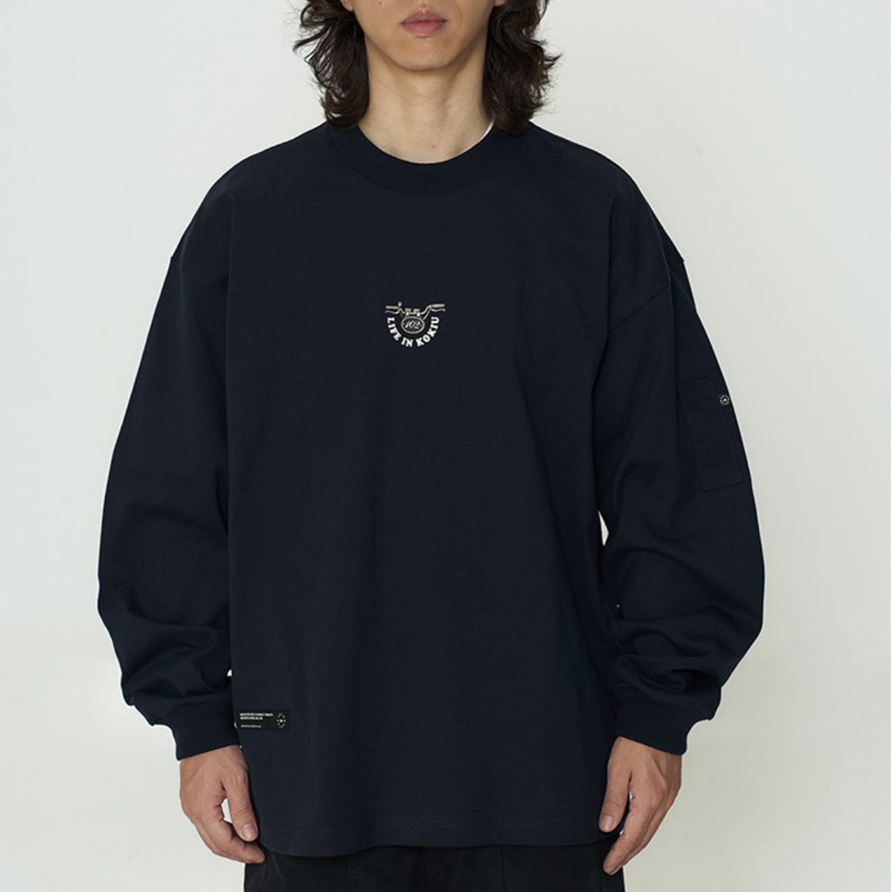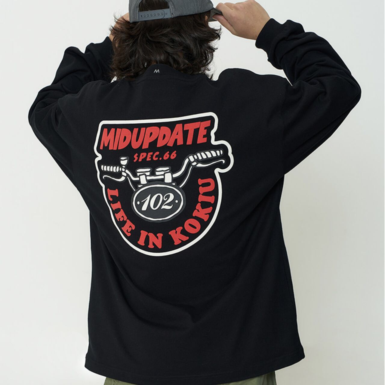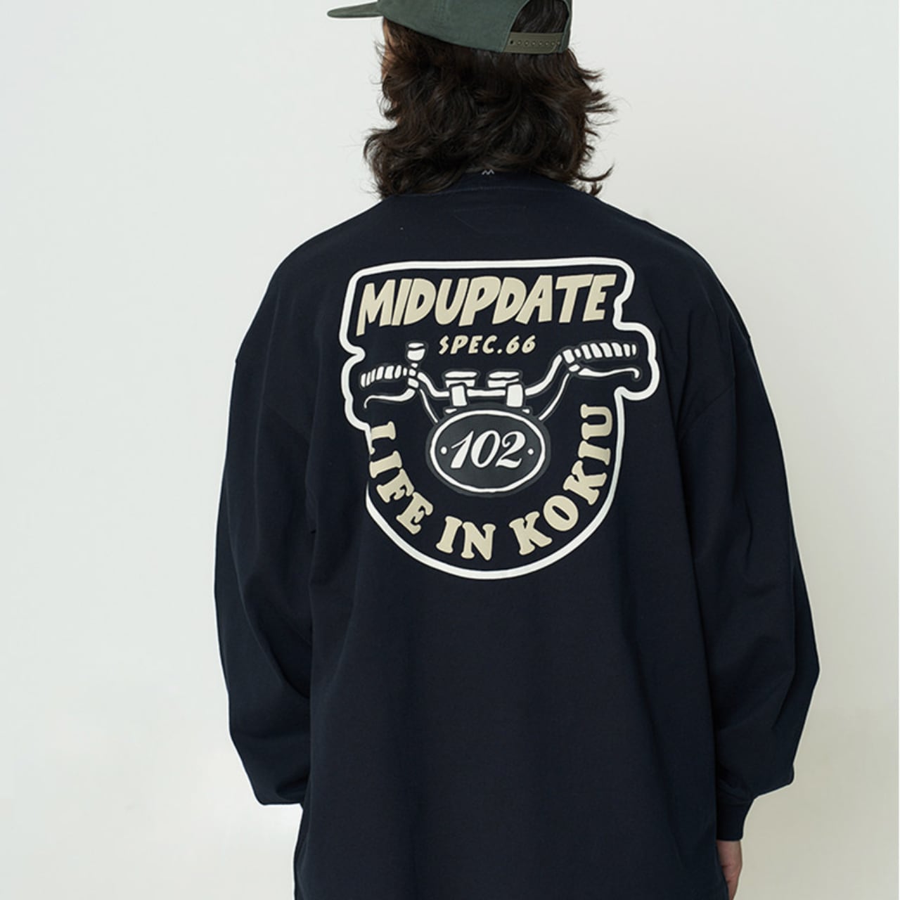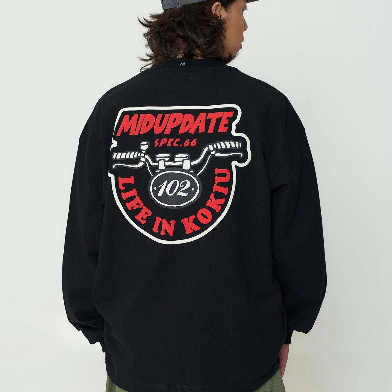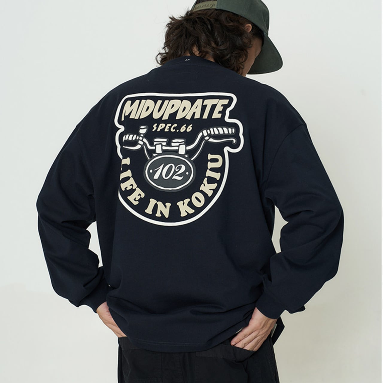 しっかりとした厚手コットン生地に、インパクト抜群のバックロゴプリントが映える一着。フロントは刺繍ワッペンのみでミニマルに、背面にはバイクのハンドルをモチーフにした大胆なグラフィックが存在感を放ちます。ゆったりとしたドロップショルダーと身幅で、ワイドパンツとの相性も抜群。袖ポケットのディテールや裾のドローコードも機能性とデザインを両立。ストリートとミリタリーを横断するグラフィックスウェットです。
