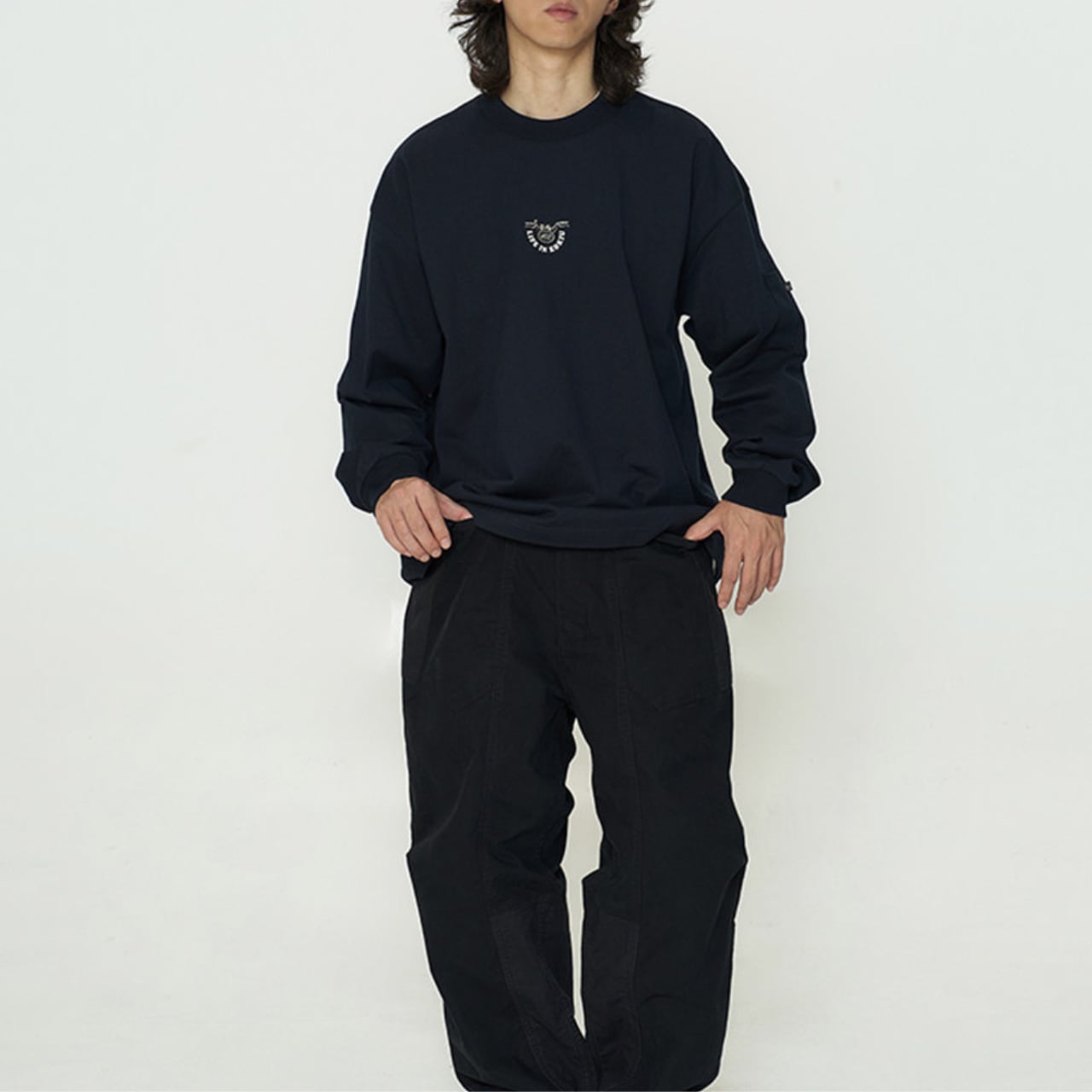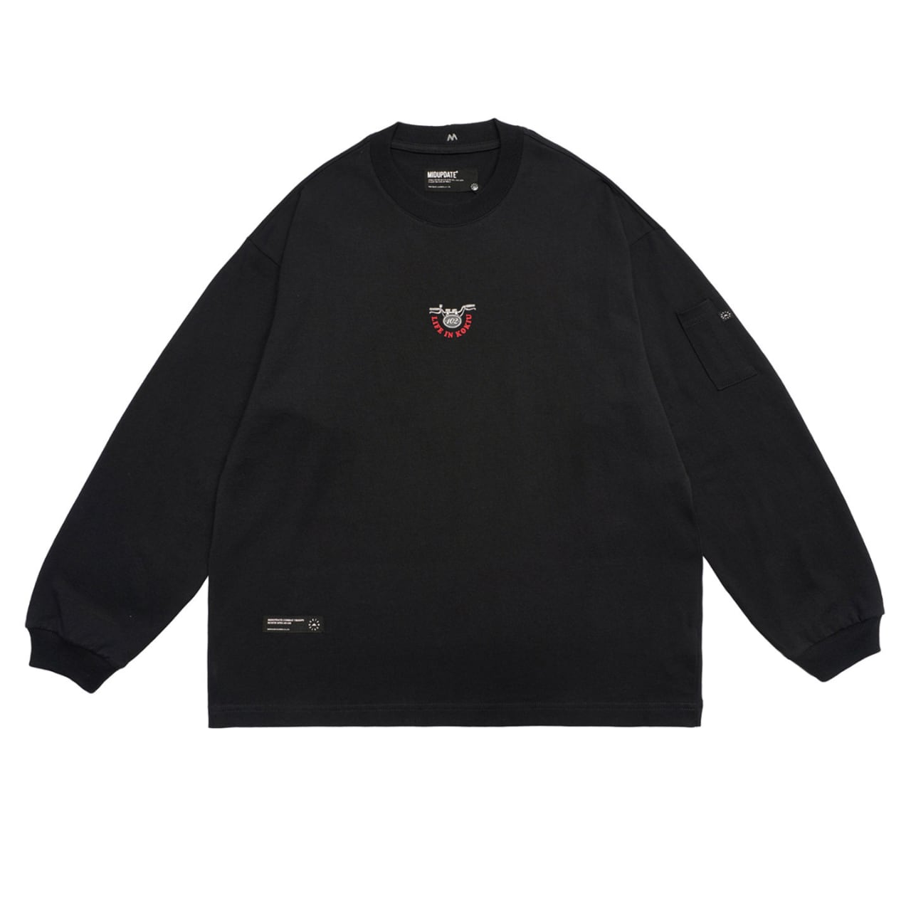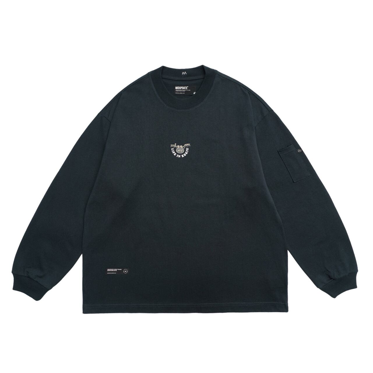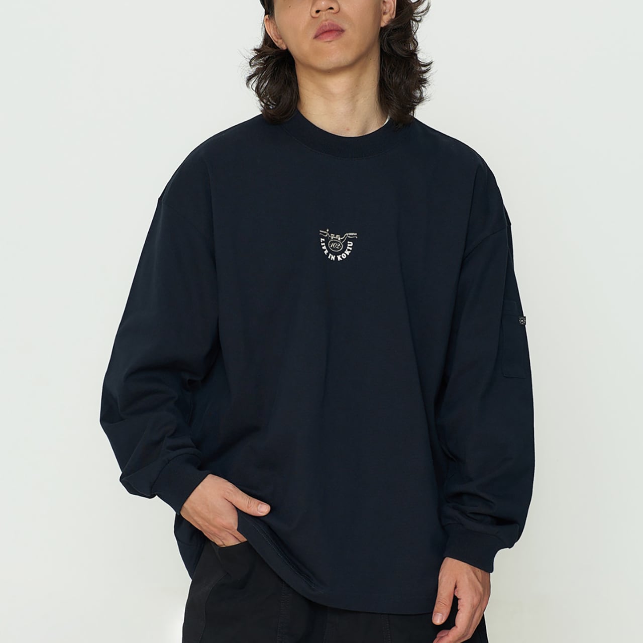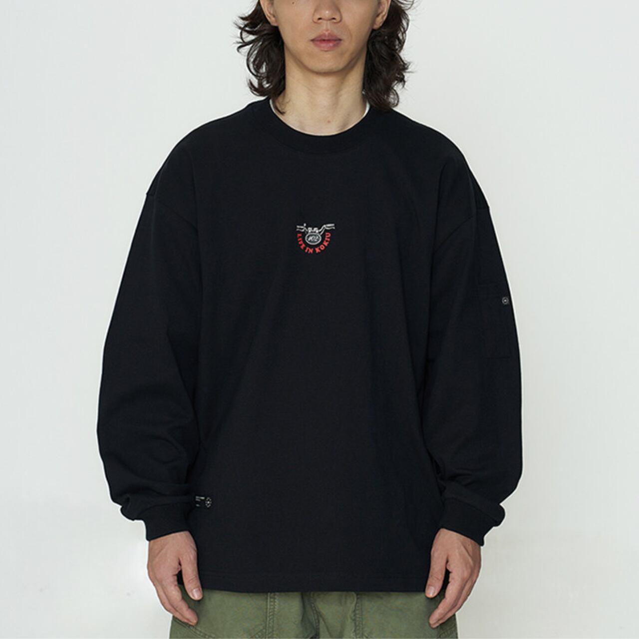しっかりとした厚手コットン生地に、インパクト抜群のバックロゴプリントが映える一着。フロントは刺繍ワッペンのみでミニマルに、背面にはバイクのハンドルをモチーフにした大胆なグラフィックが存在感を放ちます。ゆったりとしたドロップショルダーと身幅で、ワイドパンツとの相性も抜群。袖ポケットのディテールや裾のドローコードも機能性とデザインを両立。ストリートとミリタリーを横断するグラフィックスウェットです。