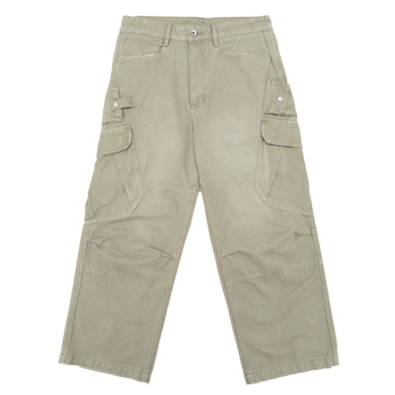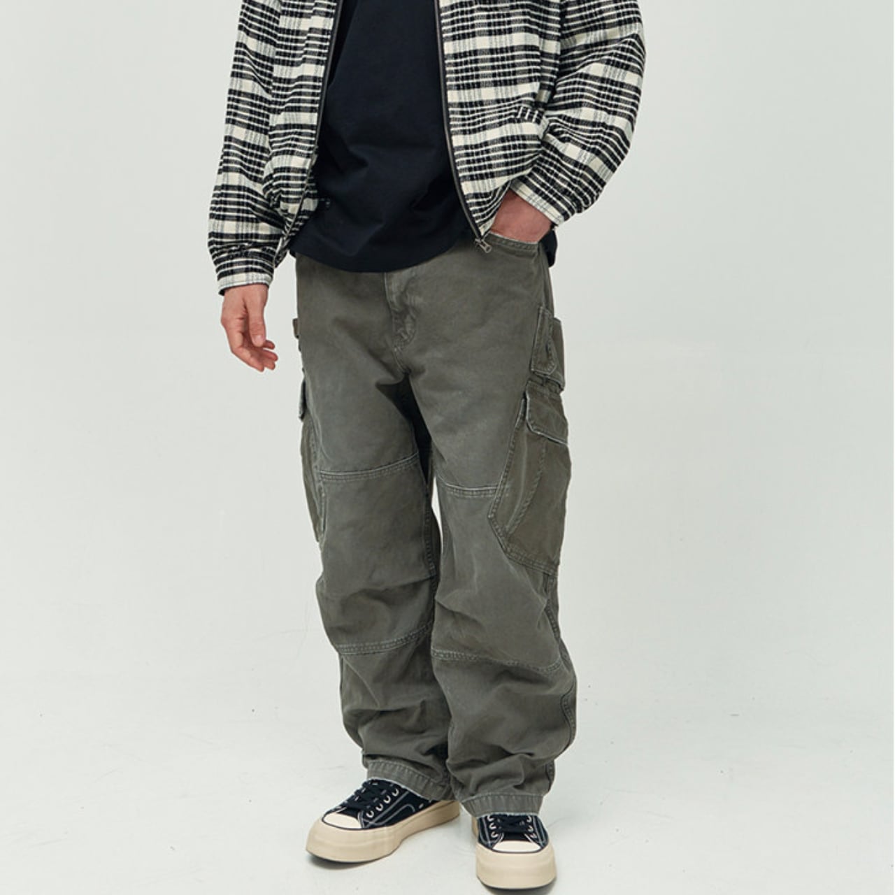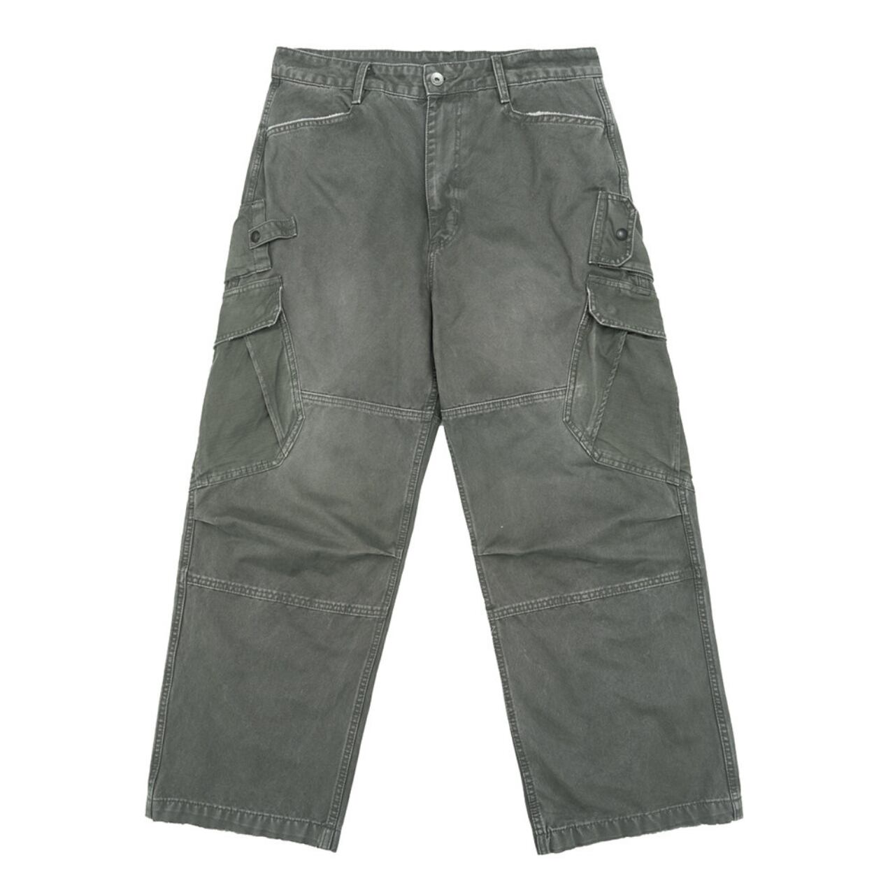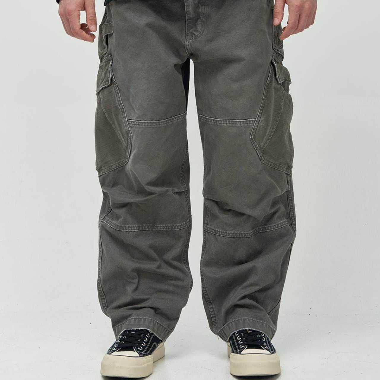 無骨な素材感とワイドなシルエットが魅力の、多機能カーゴパンツ。厚手コットンキャンバスとツイル素材をパネル切り替えで組み合わせ、タフな見た目と実用性を両立。ヒップや太もも周りの切り替え、豊富なポケットデザイン、YKK製カスタムパーツなど、細部にもこだわった設計。軽度のウォッシュ加工を施した自然なフェード感で、ストリートにもアウトドアにもハマる一本。