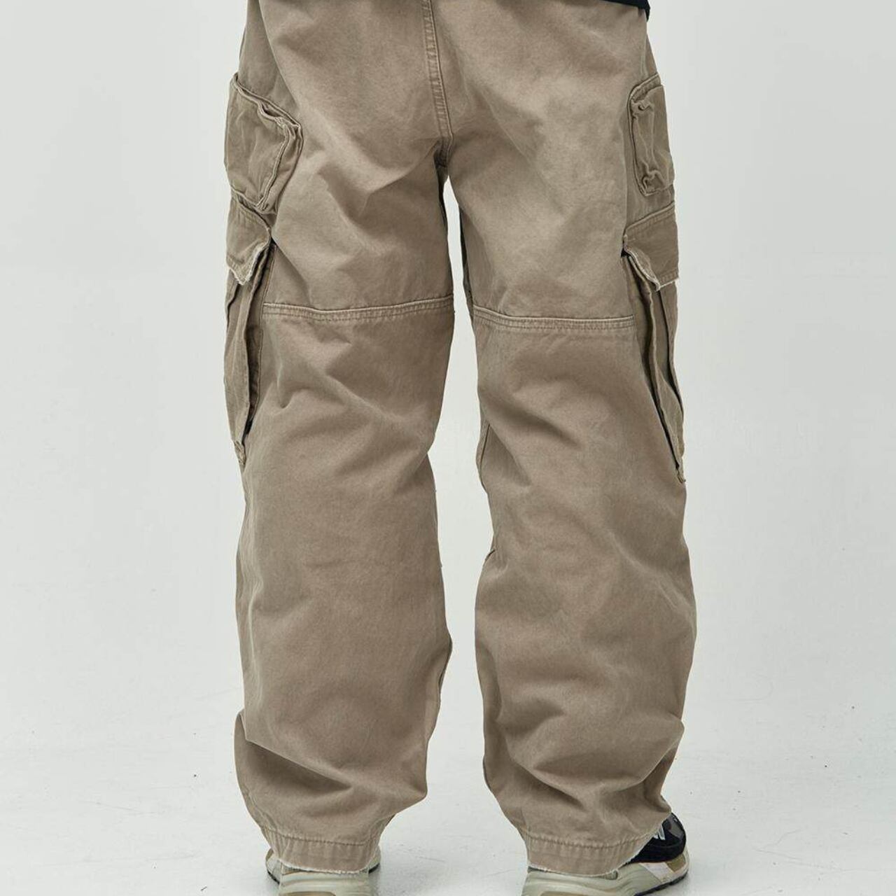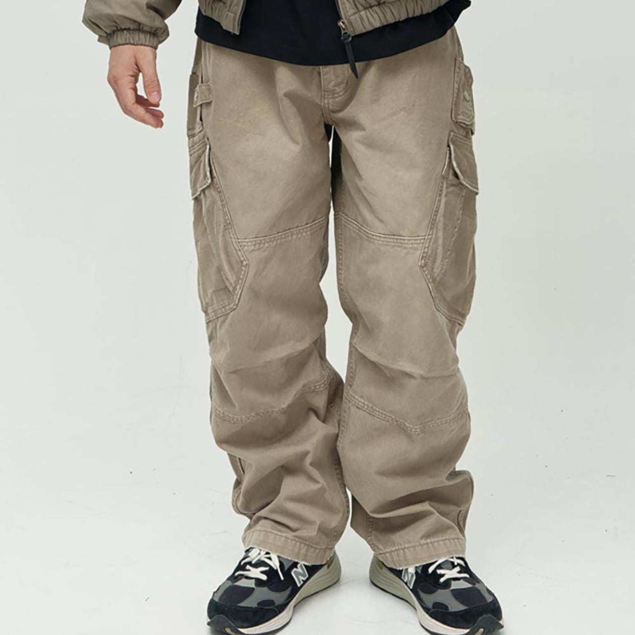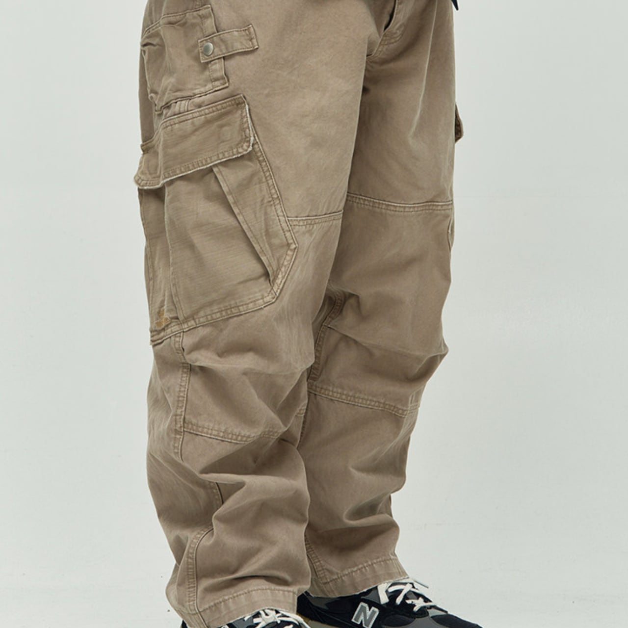 無骨な素材感とワイドなシルエットが魅力の、多機能カーゴパンツ。厚手コットンキャンバスとツイル素材をパネル切り替えで組み合わせ、タフな見た目と実用性を両立。ヒップや太もも周りの切り替え、豊富なポケットデザイン、YKK製カスタムパーツなど、細部にもこだわった設計。軽度のウォッシュ加工を施した自然なフェード感で、ストリートにもアウトドアにもハマる一本。