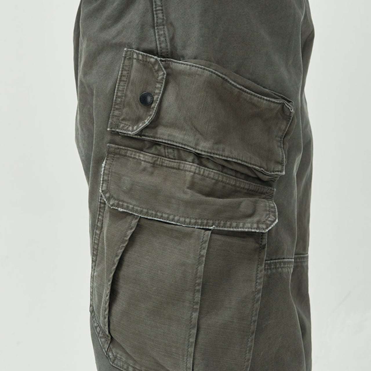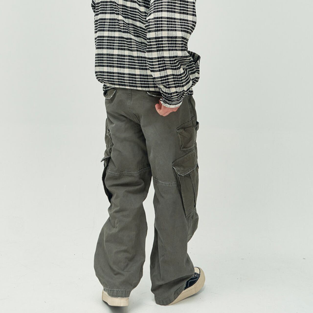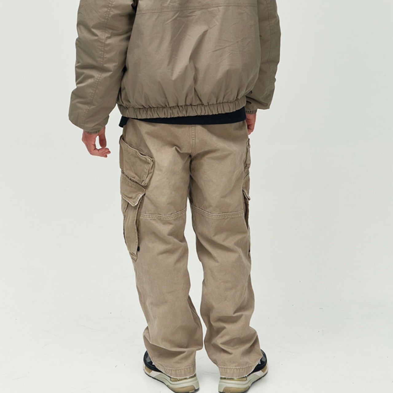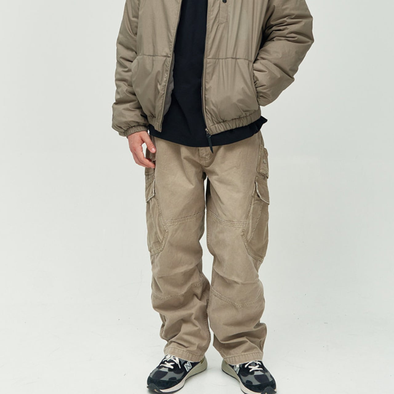 無骨な素材感とワイドなシルエットが魅力の、多機能カーゴパンツ。厚手コットンキャンバスとツイル素材をパネル切り替えで組み合わせ、タフな見た目と実用性を両立。ヒップや太もも周りの切り替え、豊富なポケットデザイン、YKK製カスタムパーツなど、細部にもこだわった設計。軽度のウォッシュ加工を施した自然なフェード感で、ストリートにもアウトドアにもハマる一本。