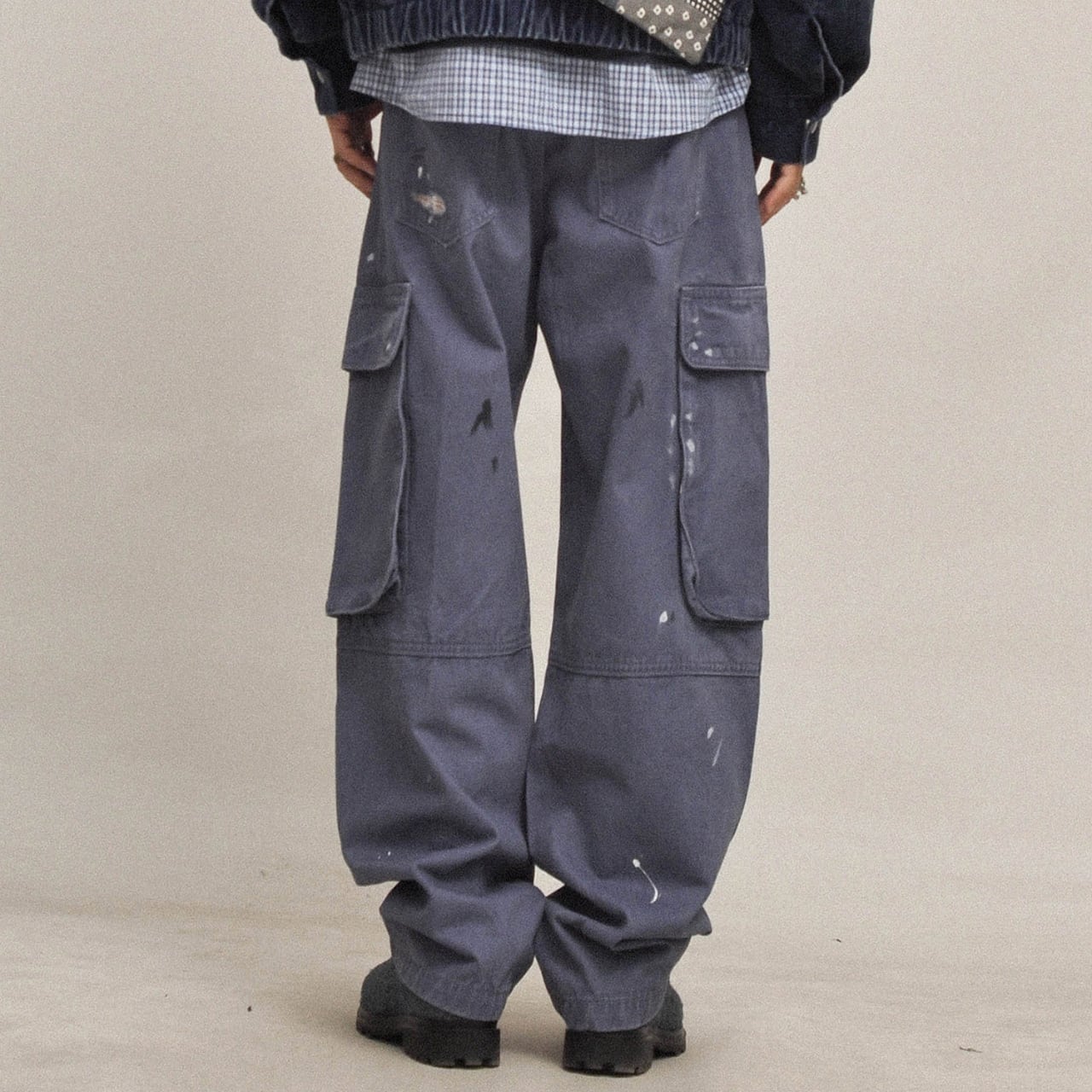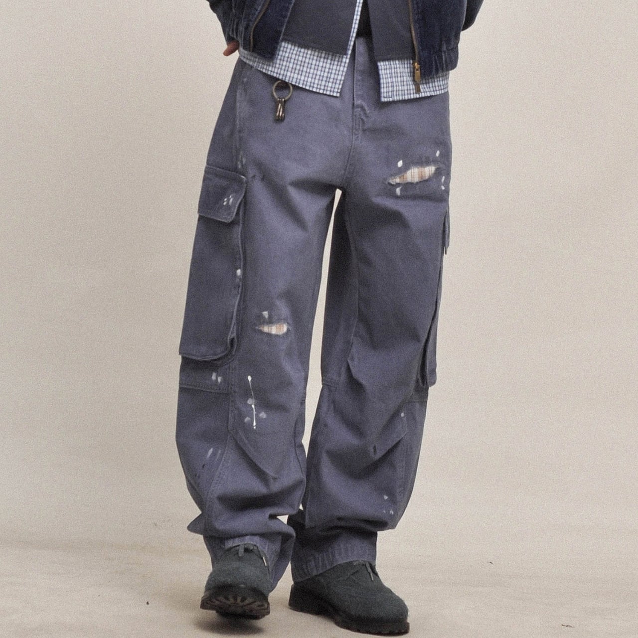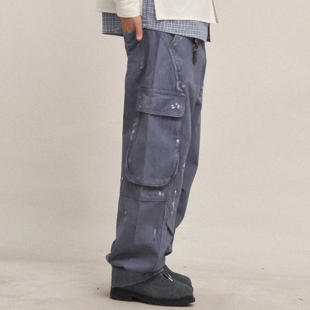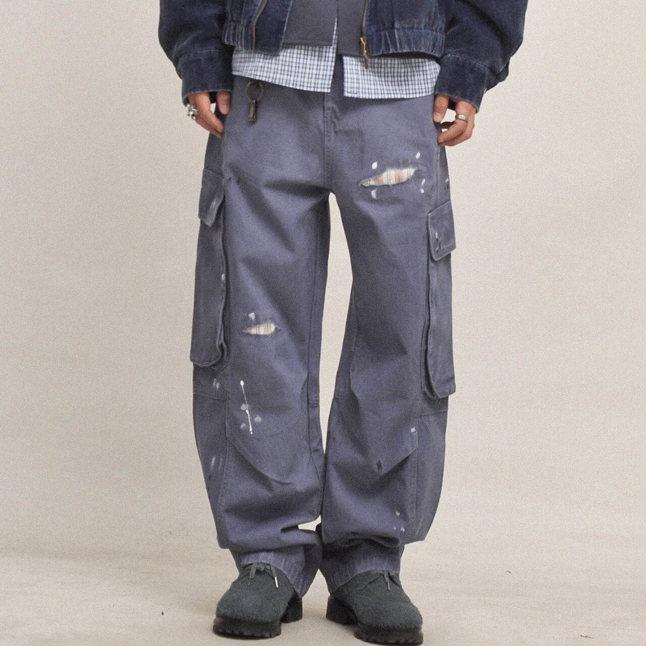 ハードなユーズド加工とペイントステインが目を引く、ヴィンテージテイストのワイドカーゴパンツ。100%コットンの厚手生地を採用し、全体にわたってウォッシュと色落ち処理を施した、こなれ感のある一本。ペンキ飛びやダメージ風のアクセントが、古着のようなリアルな表情を演出します。ルーズなシルエットと大容量ポケットで、ストリートにもアウトドアにも対応。カレッジシャツやジャケットとのレイヤードで奥行きのあるスタイルに。