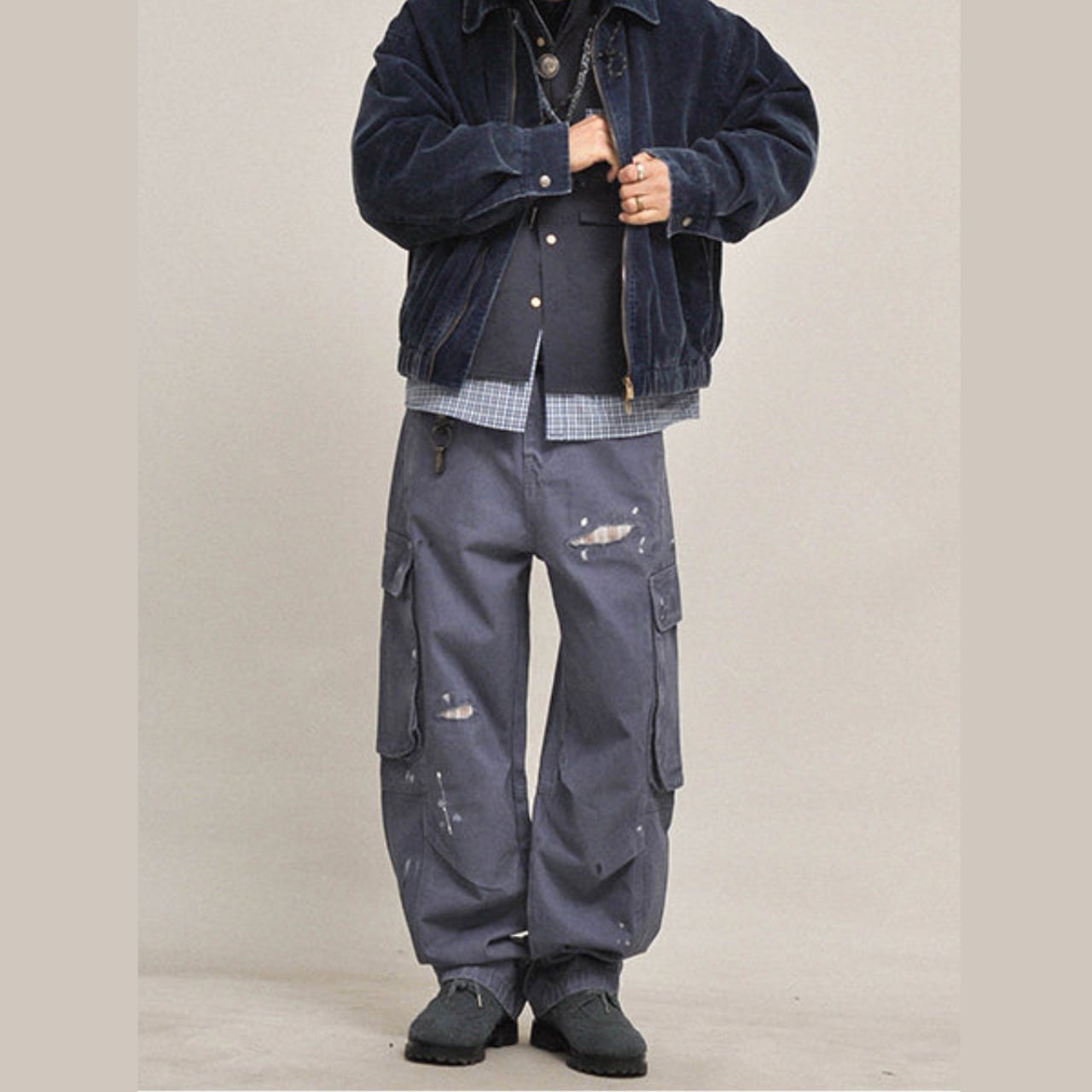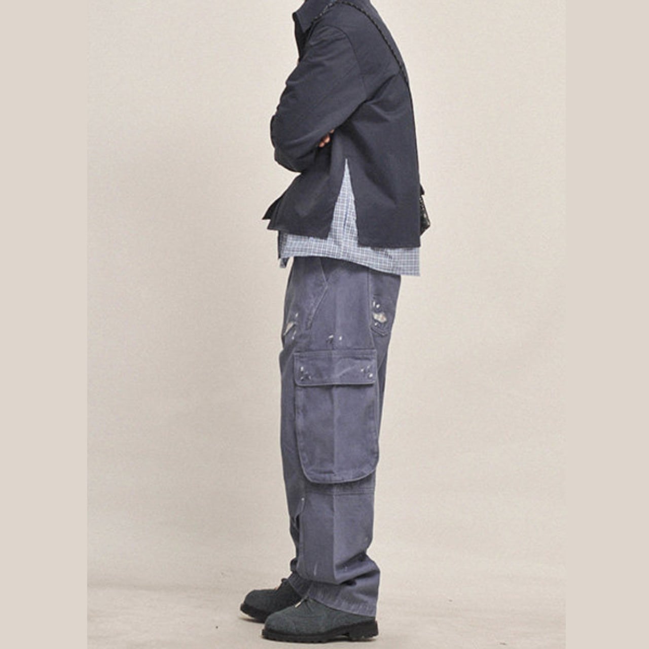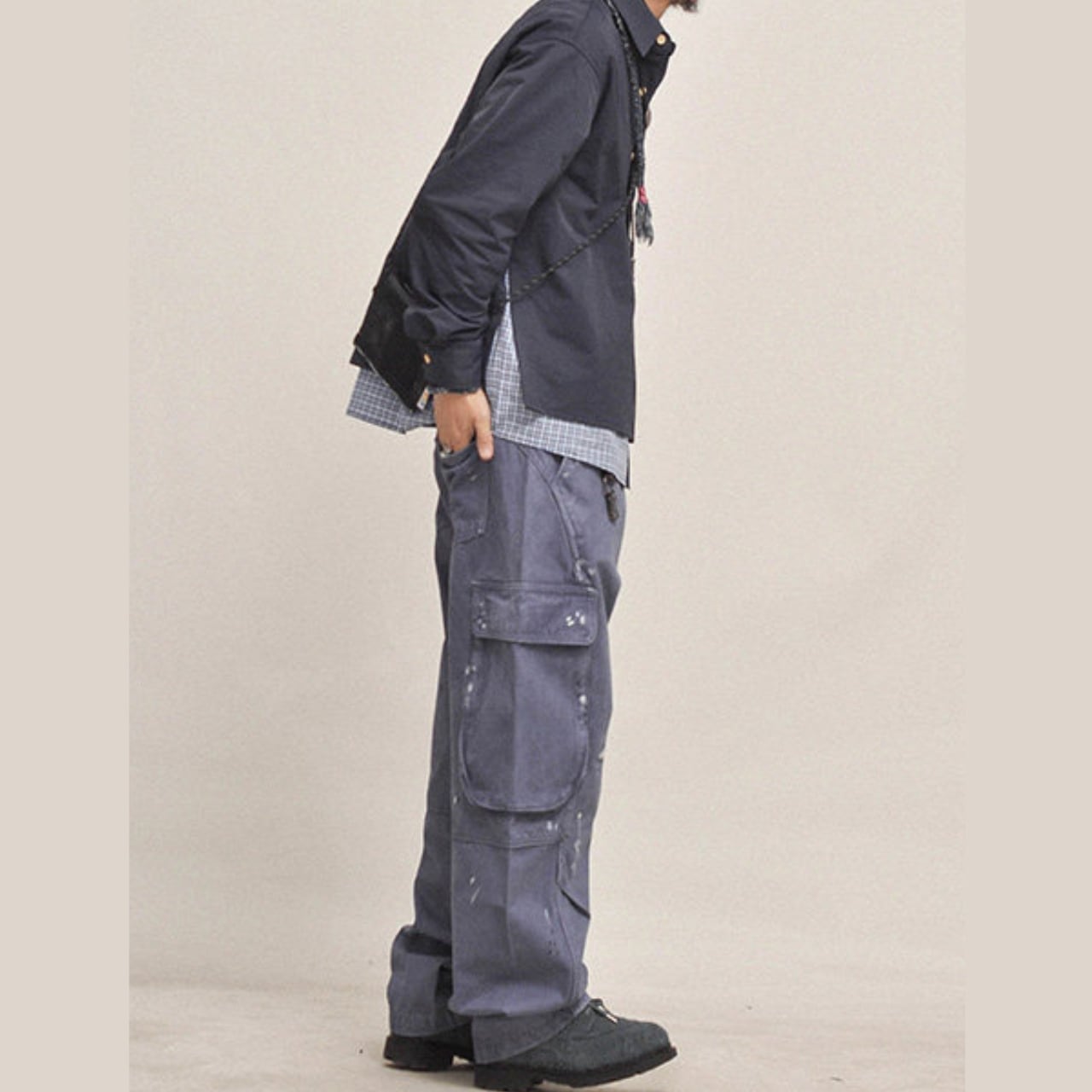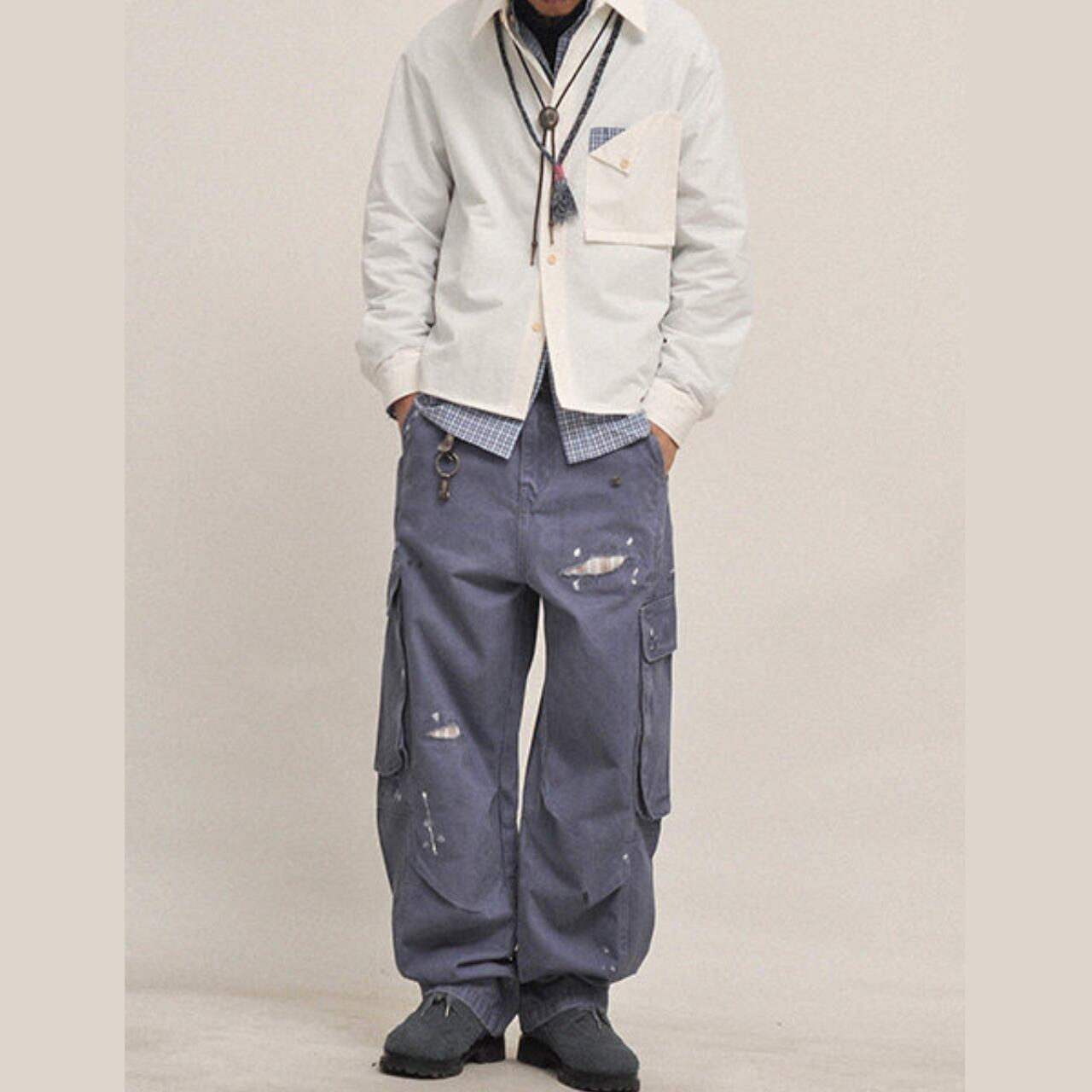 ハードなユーズド加工とペイントステインが目を引く、ヴィンテージテイストのワイドカーゴパンツ。100%コットンの厚手生地を採用し、全体にわたってウォッシュと色落ち処理を施した、こなれ感のある一本。ペンキ飛びやダメージ風のアクセントが、古着のようなリアルな表情を演出します。ルーズなシルエットと大容量ポケットで、ストリートにもアウトドアにも対応。カレッジシャツやジャケットとのレイヤードで奥行きのあるスタイルに。
