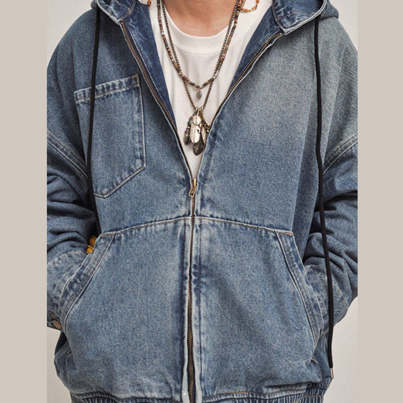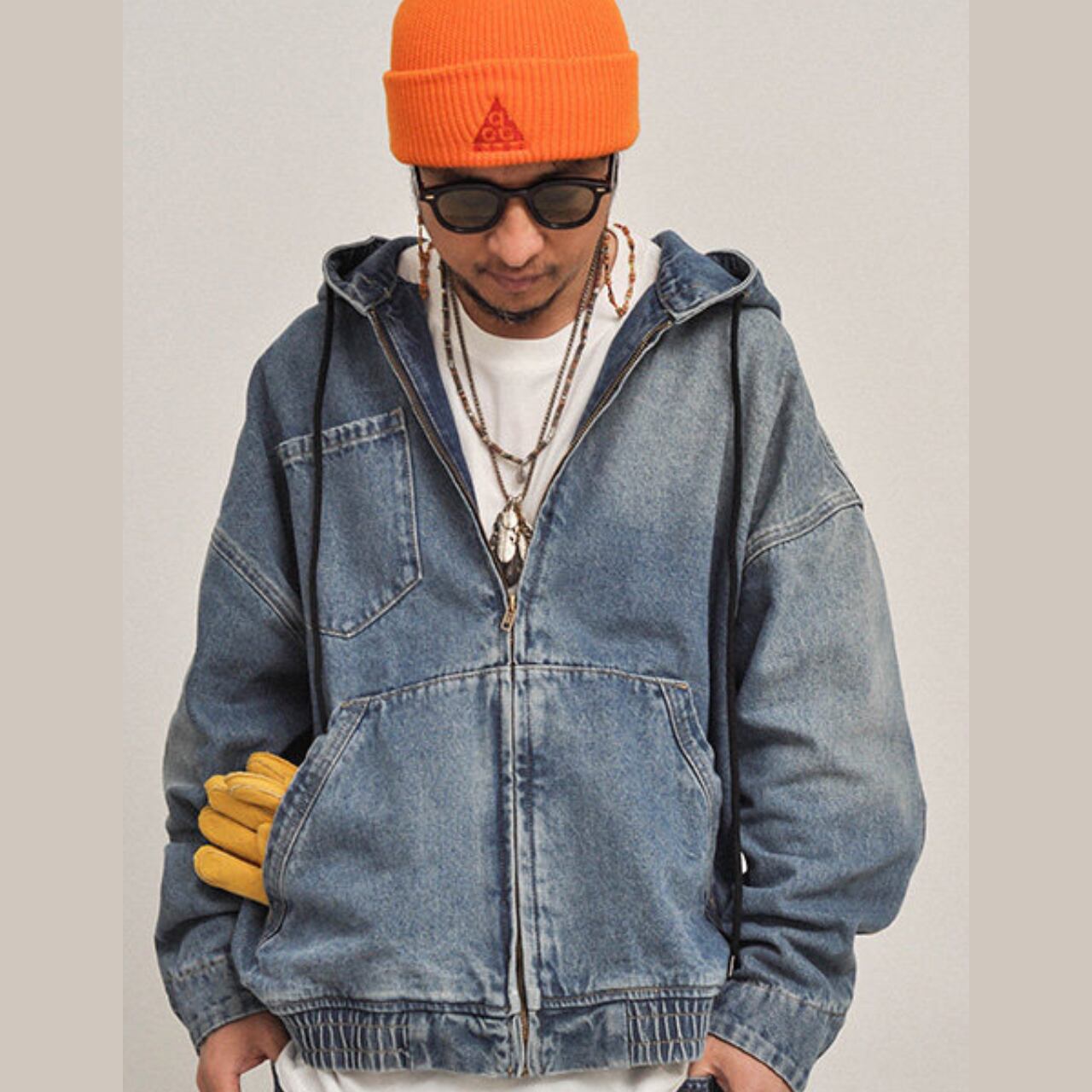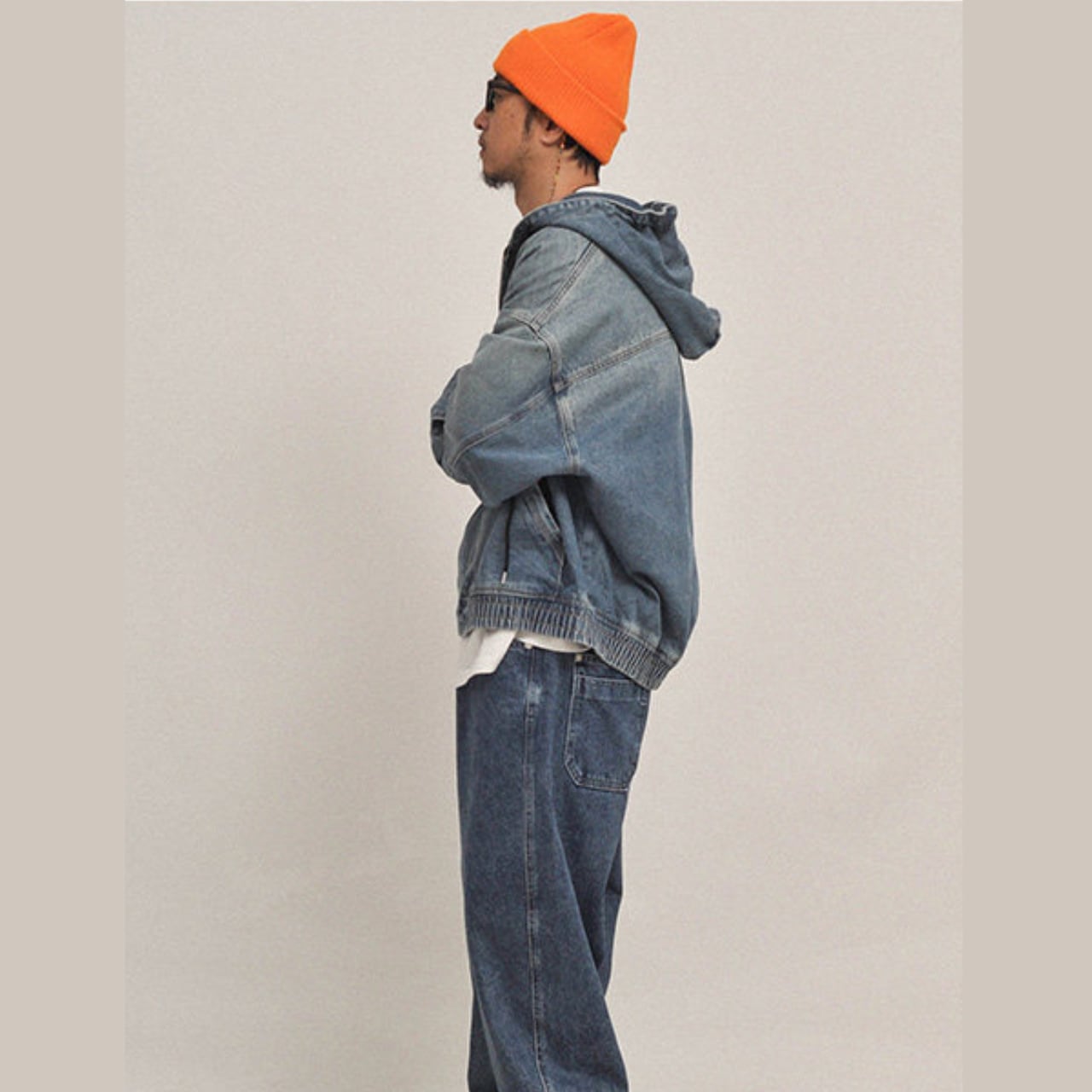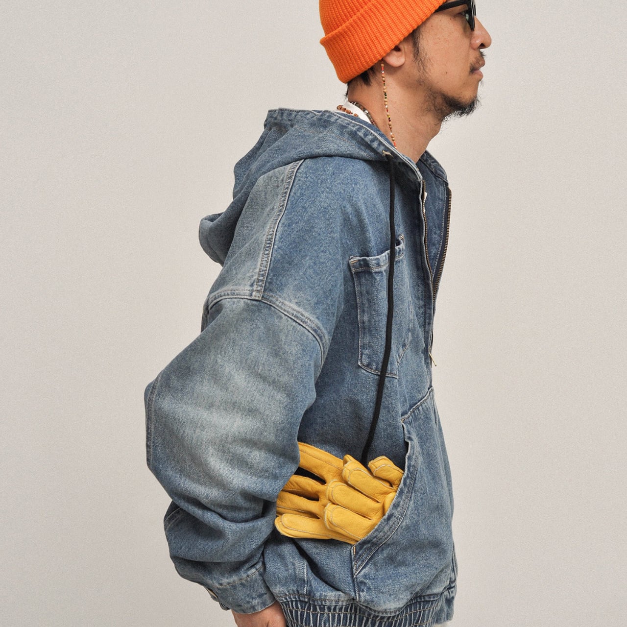 ゆったりとしたシルエットが特徴で、動きやすさと快適さを提供します。フロントジッパーと大きなフロントポケットがアクセントとなり、シンプルながらも目を引くデザインに。デニムのライトブルーは、どんなコーディネートにも合わせやすく、デイリーユースにぴったりです。カジュアルでありながら、独特のスタイルを演出する一着で、シティボーイにぴったりのアイテムです。
