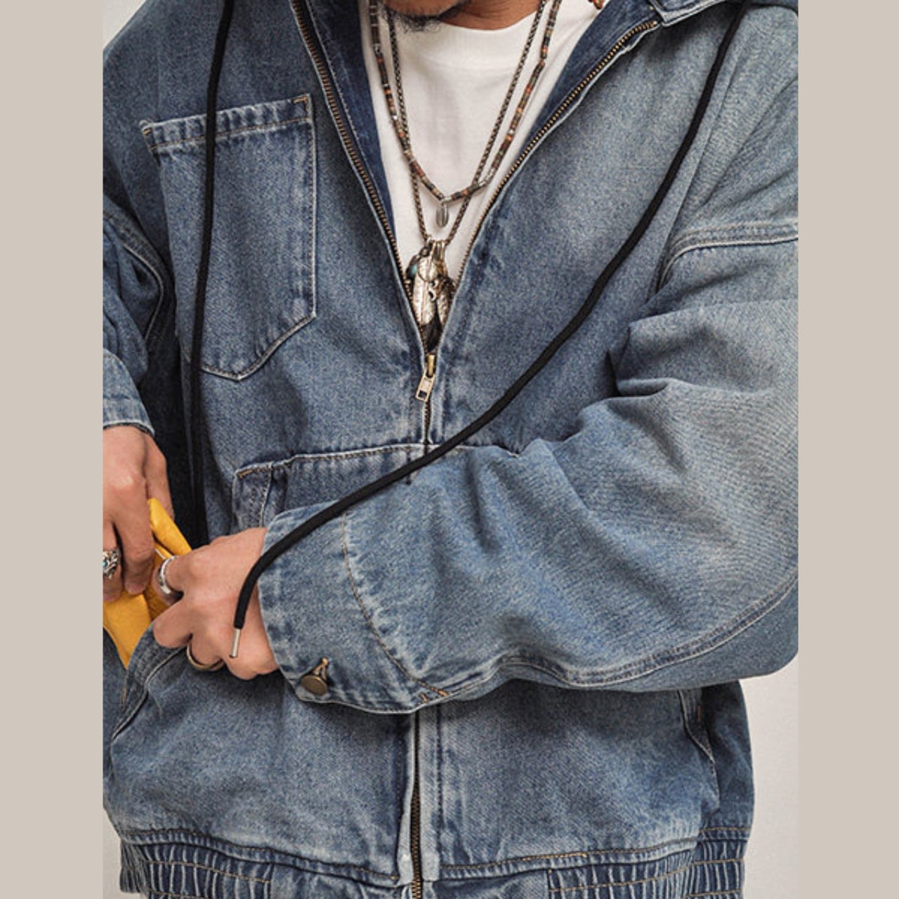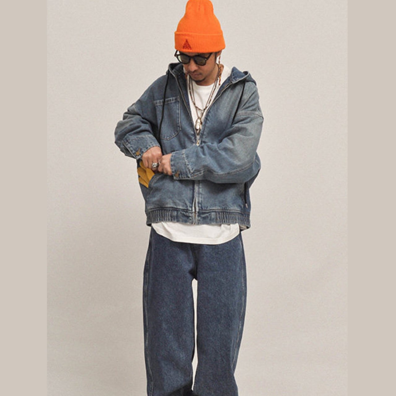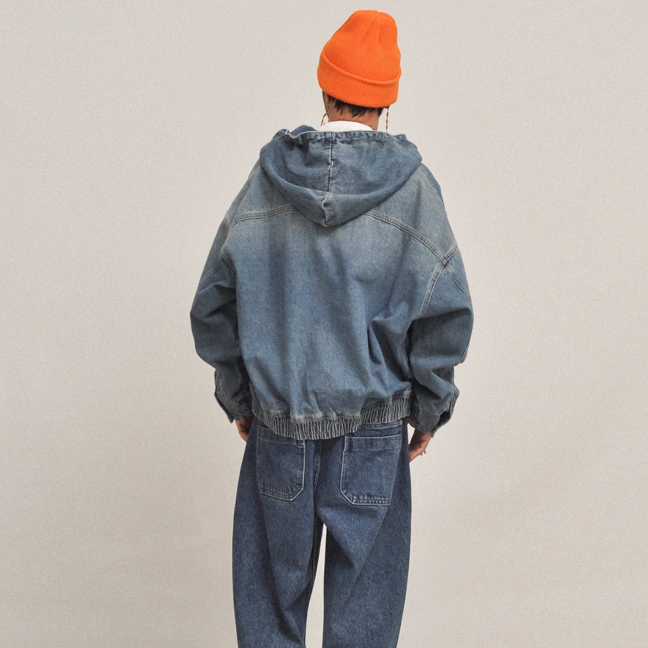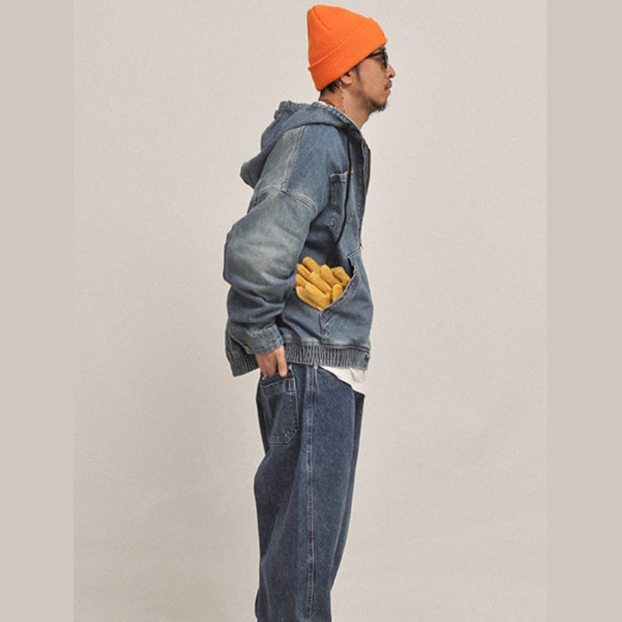 ゆったりとしたシルエットが特徴で、動きやすさと快適さを提供します。フロントジッパーと大きなフロントポケットがアクセントとなり、シンプルながらも目を引くデザインに。デニムのライトブルーは、どんなコーディネートにも合わせやすく、デイリーユースにぴったりです。カジュアルでありながら、独特のスタイルを演出する一着で、シティボーイにぴったりのアイテムです。