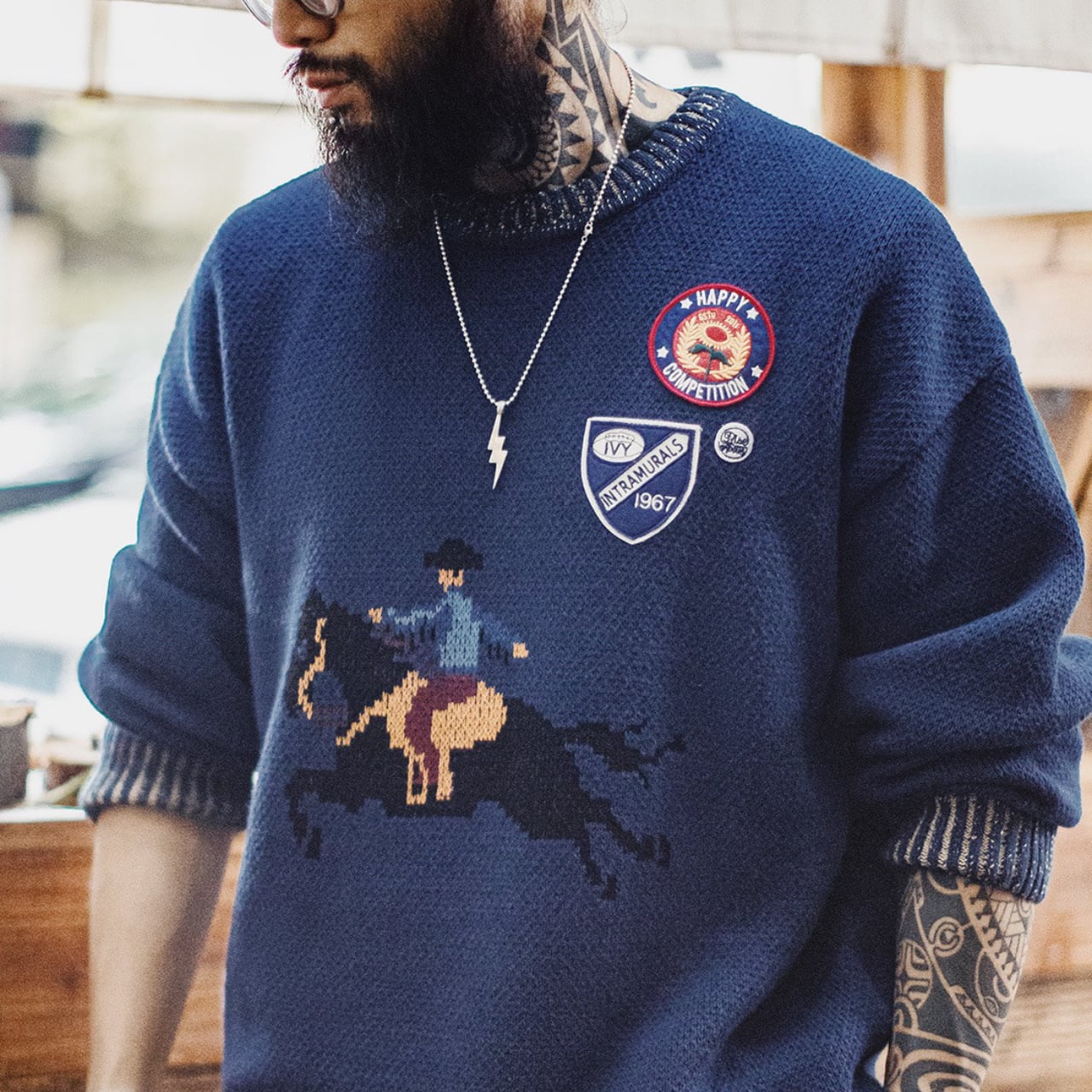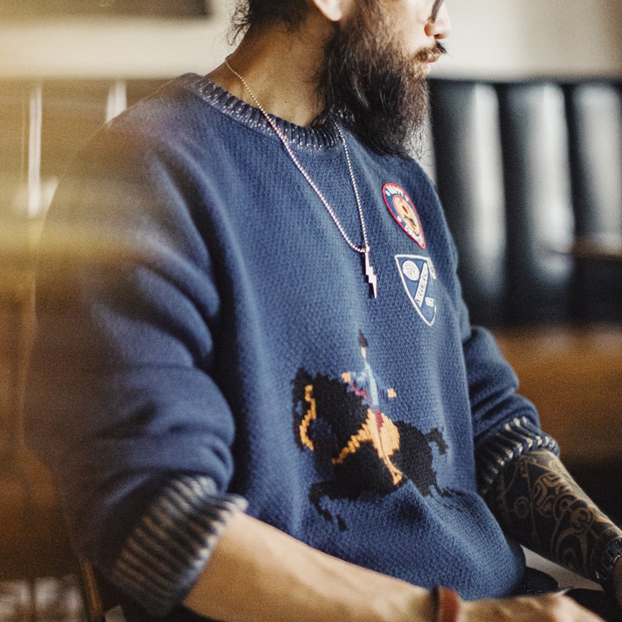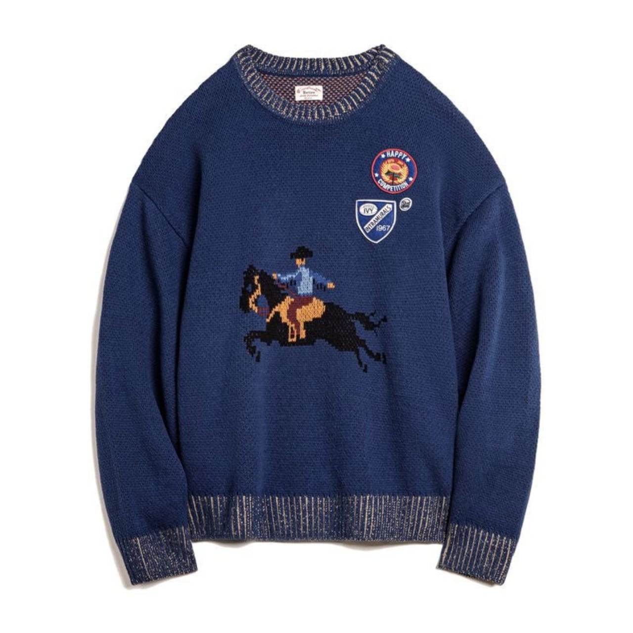 クラシックなムードと遊び心を融合させた、存在感抜群のニットセーター。フロントには馬に乗るライダーのジャカード柄を大胆に配置し、60’sヴィンテージを思わせる雰囲気に仕上げています。胸元のワッペンディテールが程よいアクセントとなり、一枚でスタイルが完成する主役アイテム。程よく厚みのある編み地で、秋冬はもちろん、インナー次第で長いシーズン活躍します。デニムやワークパンツと合わせたラフな着こなしはもちろん、スラックスで外したコーデもおすすめです。