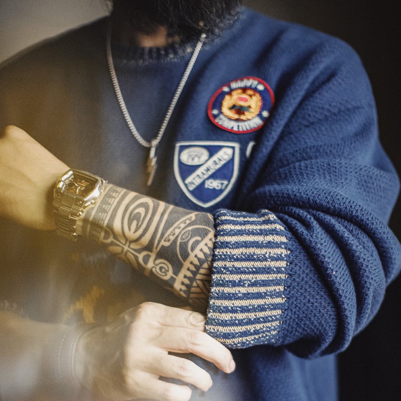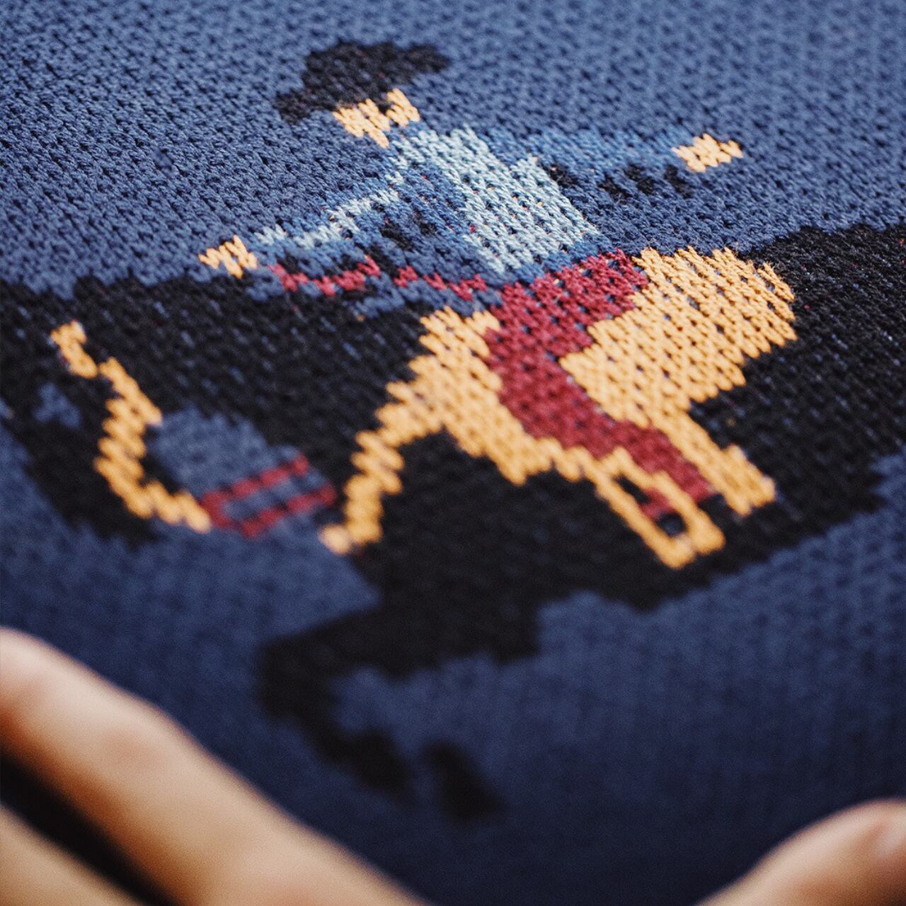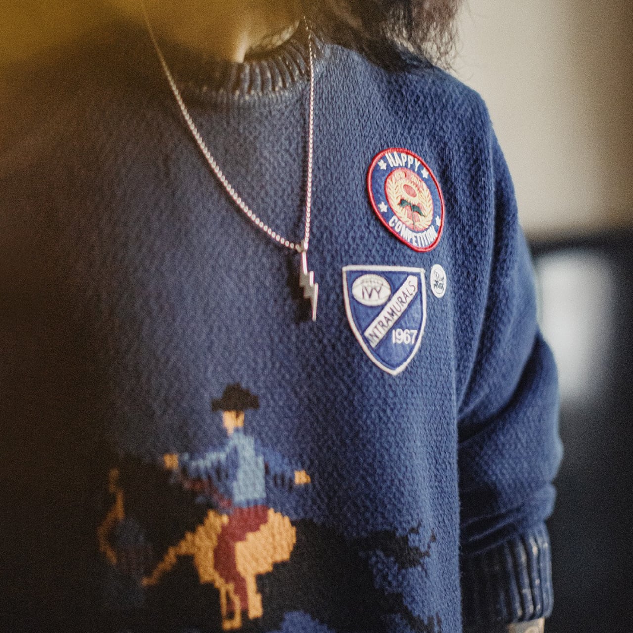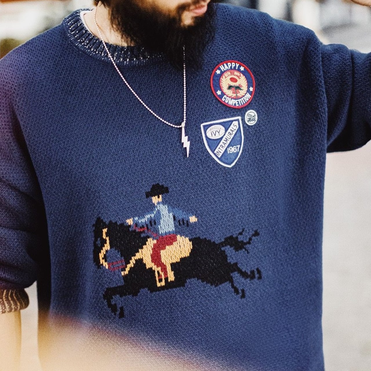 クラシックなムードと遊び心を融合させた、存在感抜群のニットセーター。フロントには馬に乗るライダーのジャカード柄を大胆に配置し、60’sヴィンテージを思わせる雰囲気に仕上げています。胸元のワッペンディテールが程よいアクセントとなり、一枚でスタイルが完成する主役アイテム。程よく厚みのある編み地で、秋冬はもちろん、インナー次第で長いシーズン活躍します。デニムやワークパンツと合わせたラフな着こなしはもちろん、スラックスで外したコーデもおすすめです。
