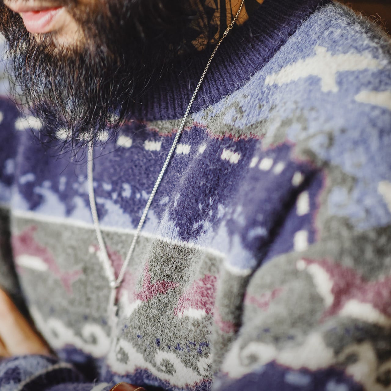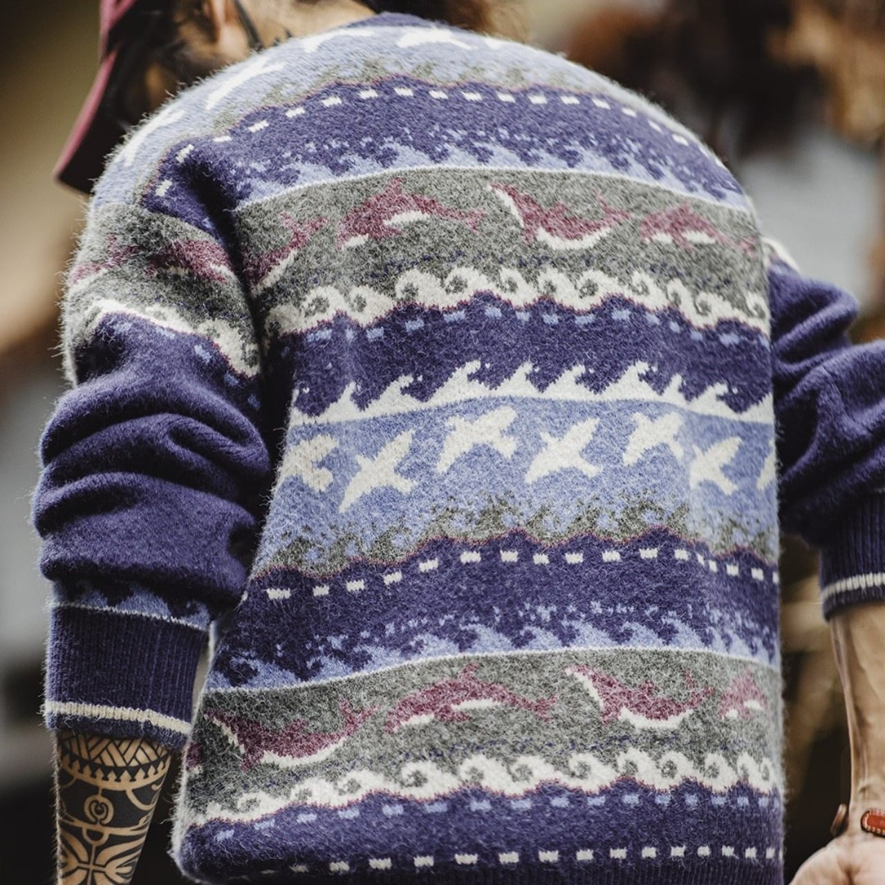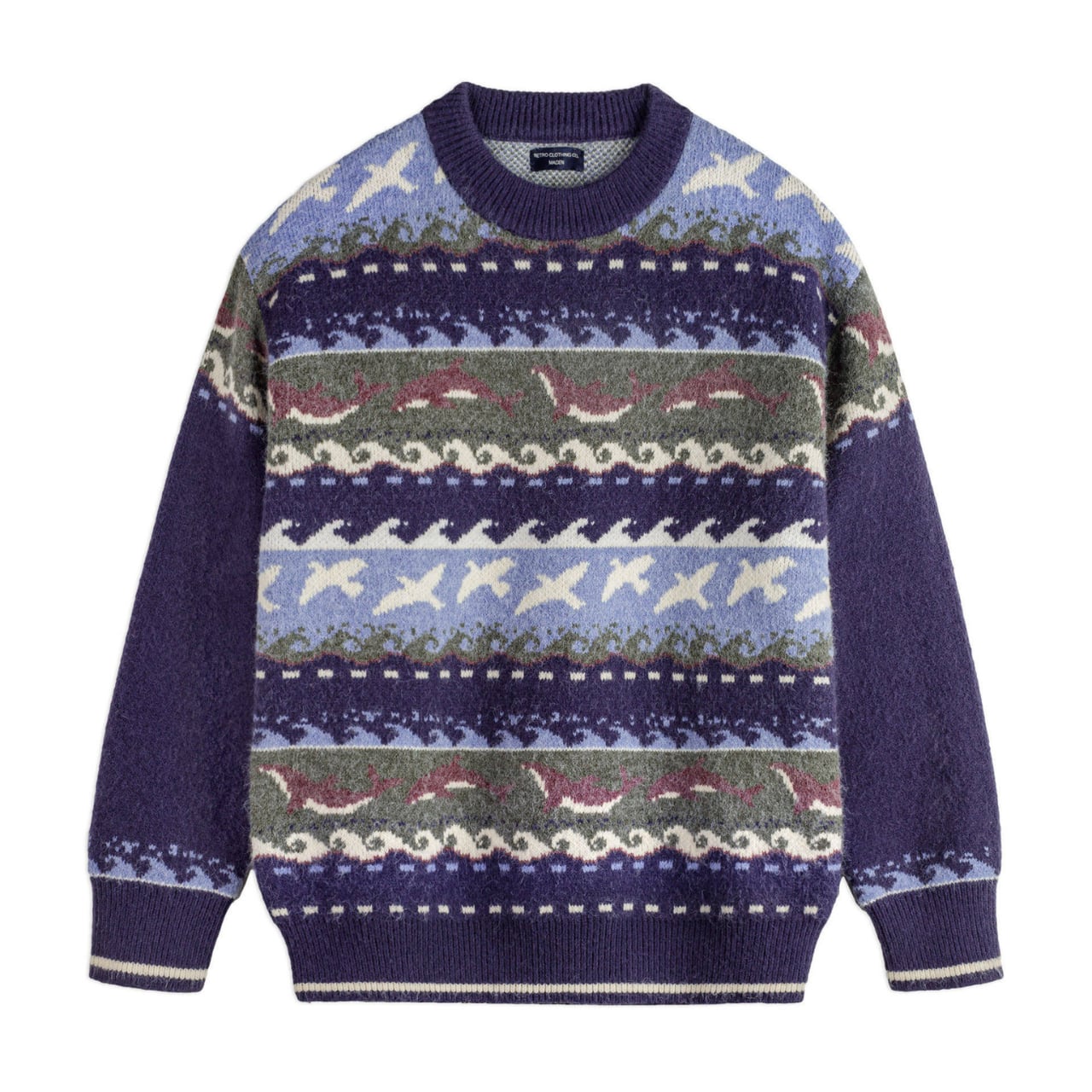 飛び交う海鳥、波のリズム、イルカをモチーフにしたパターンを、深みのあるネイビーとブルーを基調に編み立てています。