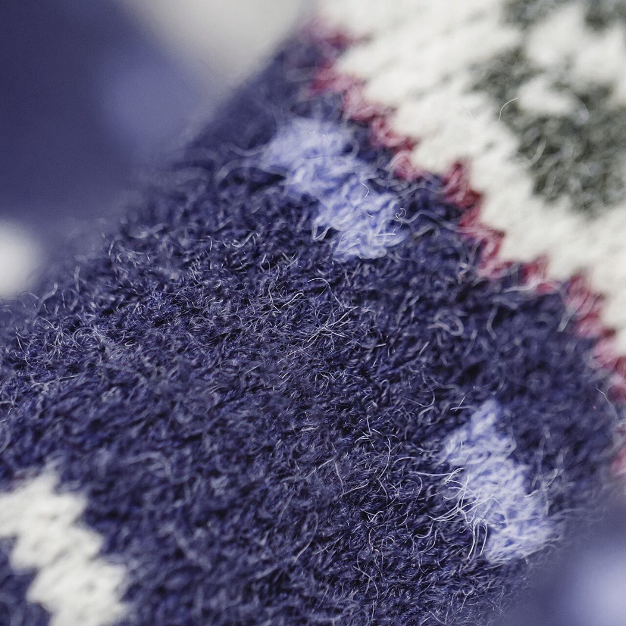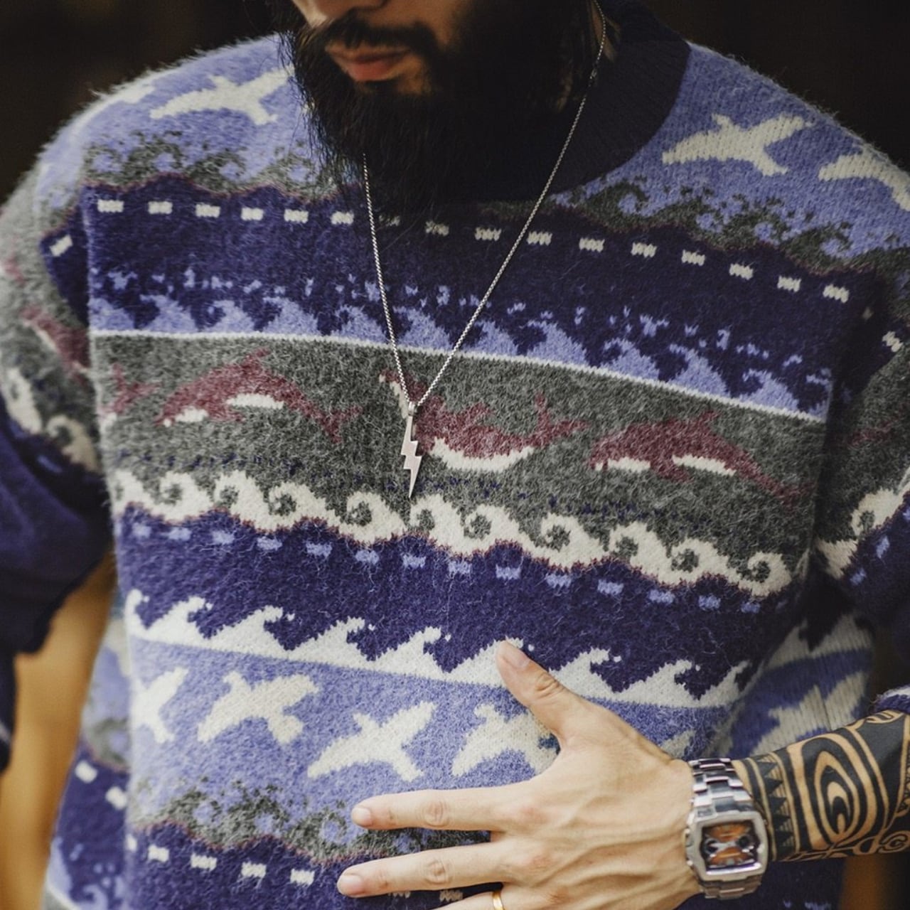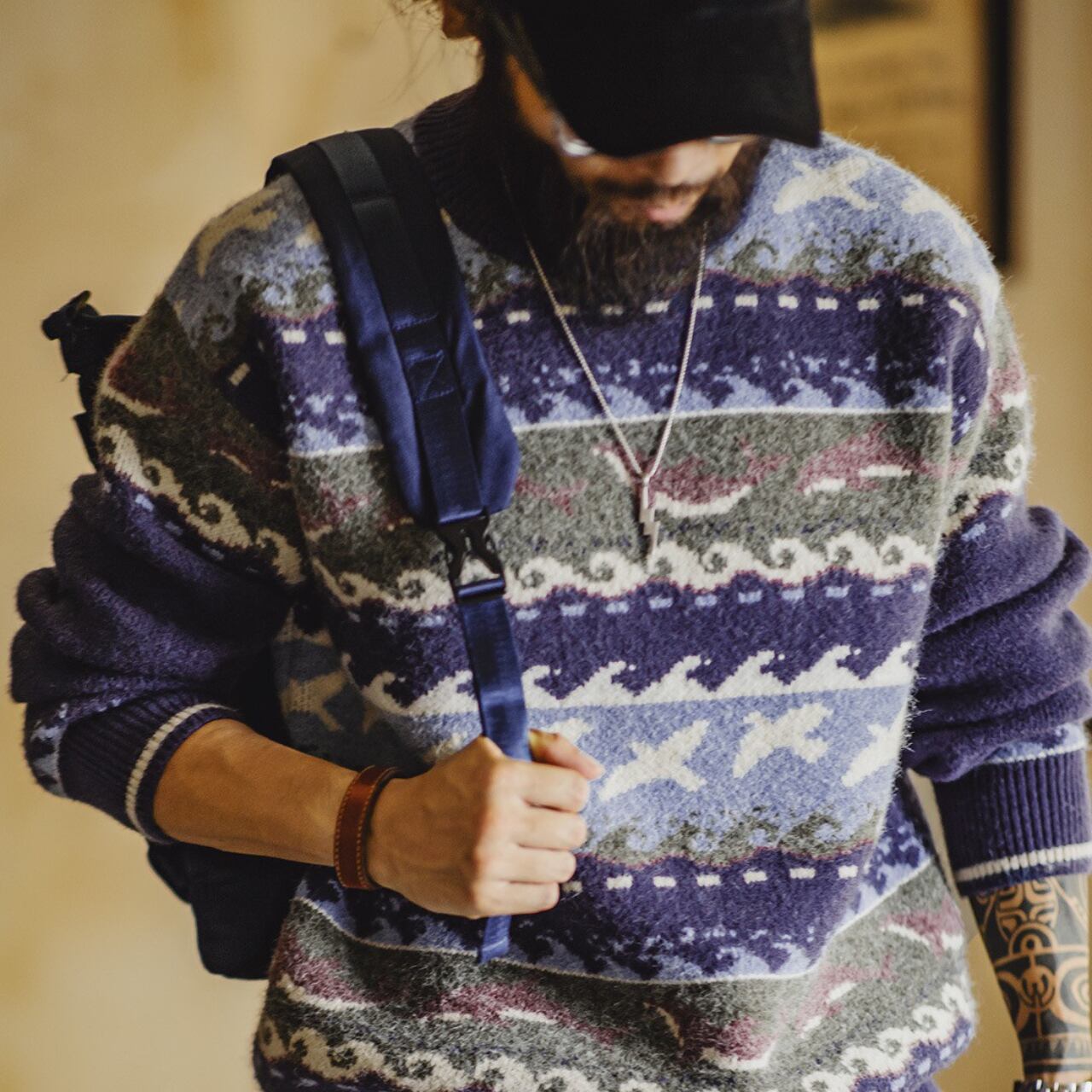 飛び交う海鳥、波のリズム、イルカをモチーフにしたパターンを、深みのあるネイビーとブルーを基調に編み立てています。