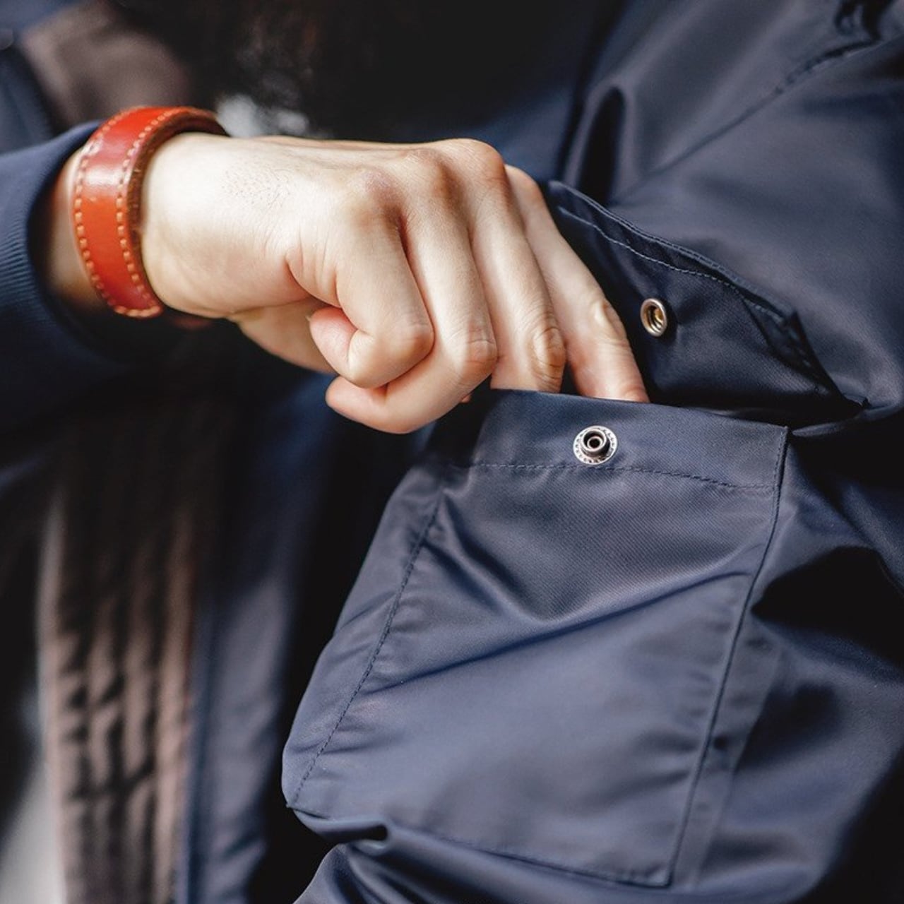 程よく光沢のあるナイロン素材が、ミリタリー由来の無骨さを残しつつも都会的な印象に仕上げています。