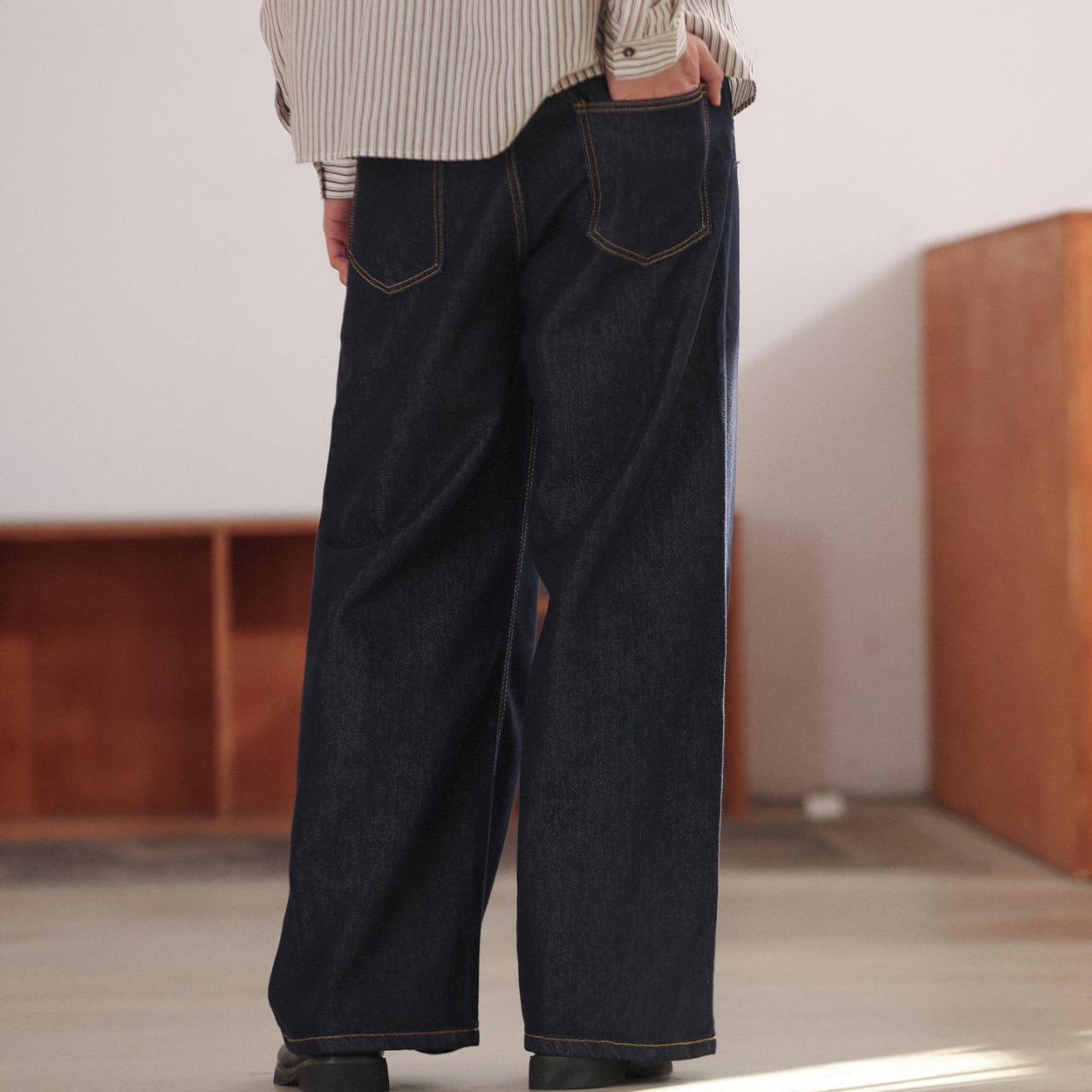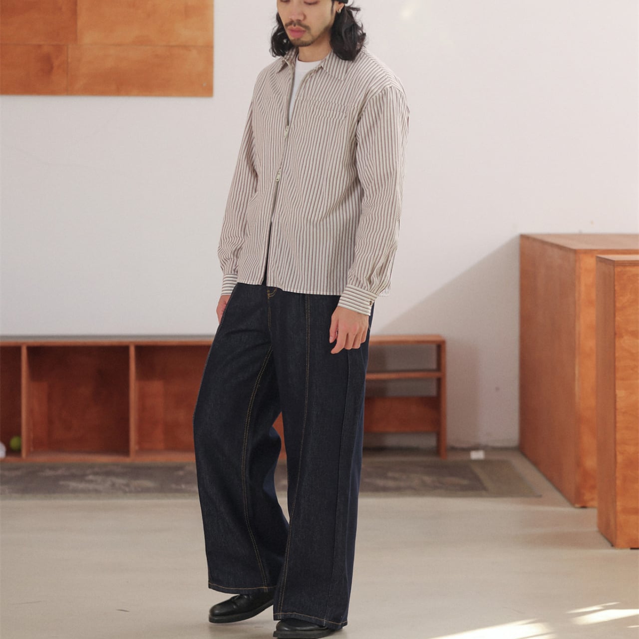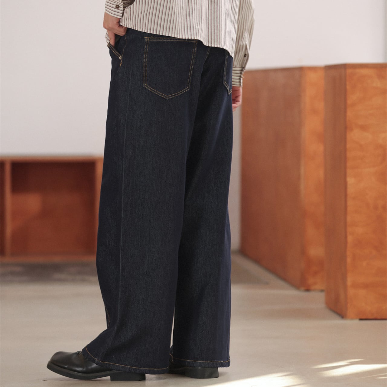 色落ちの少ないダークインディゴが上品で、シャツやスウェット、ニットなどどんなトップスにも好相性。シンプルな着こなしでもスタイルが決まる、“都市生活者のためのデニム”です。