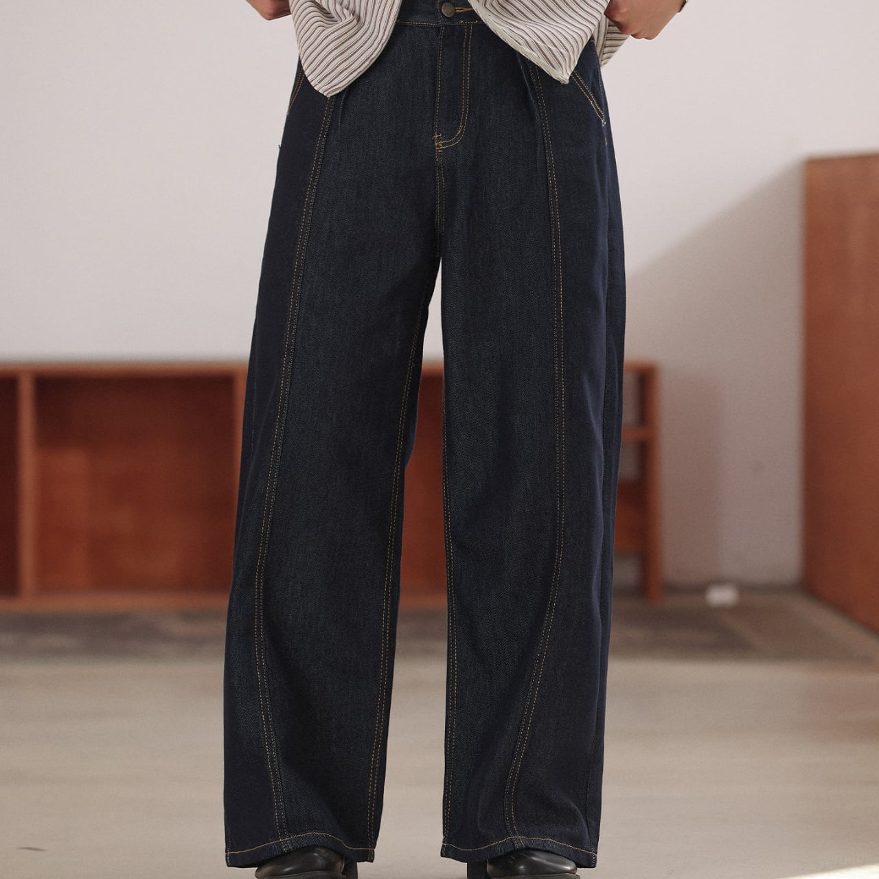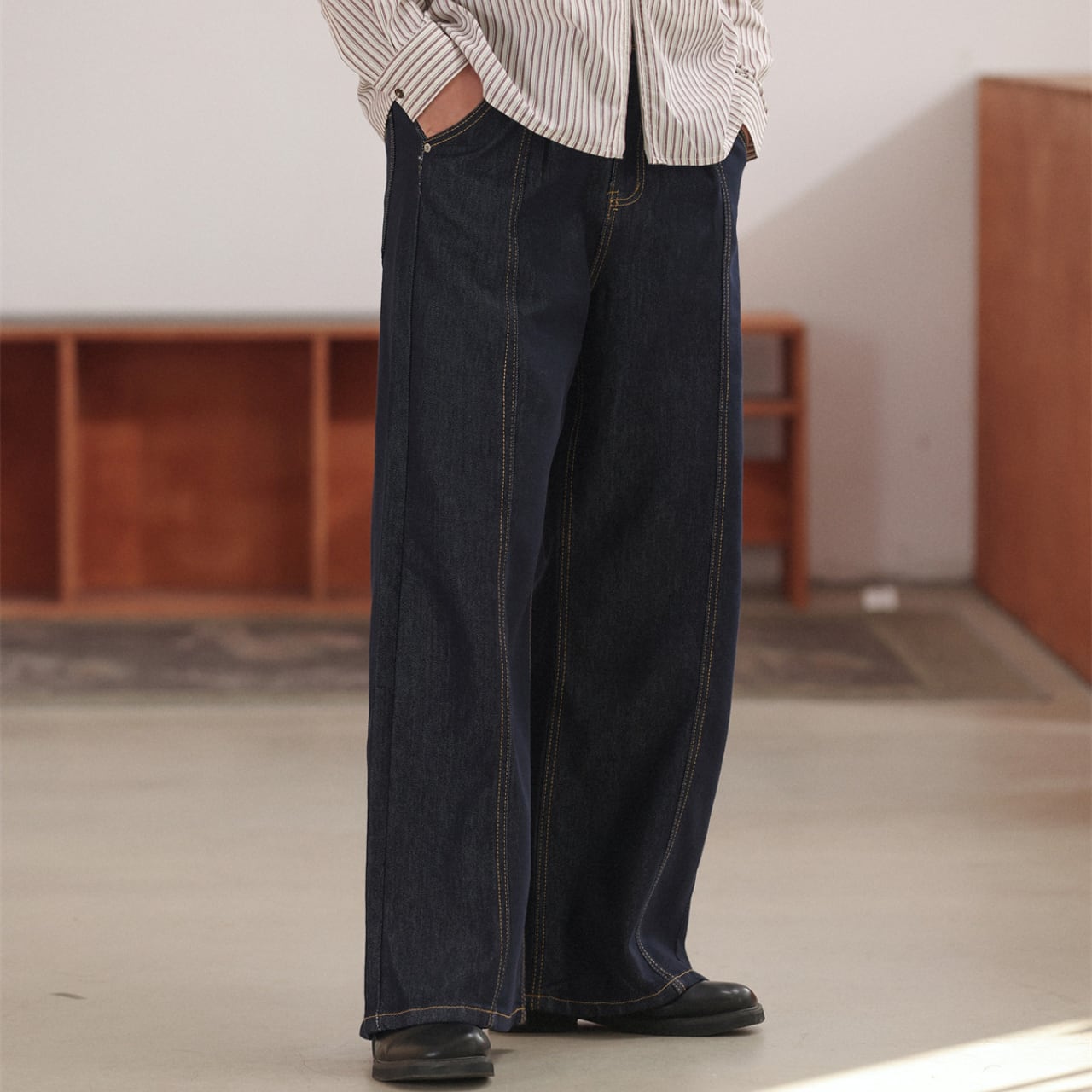 ワイドストレートなシルエットに深めのツータックを加え、立体感と程よい抜け感をプラス。フロントとサイドに走るダブルステッチが特徴的で、無骨さと繊細さを併せ持つ一本。