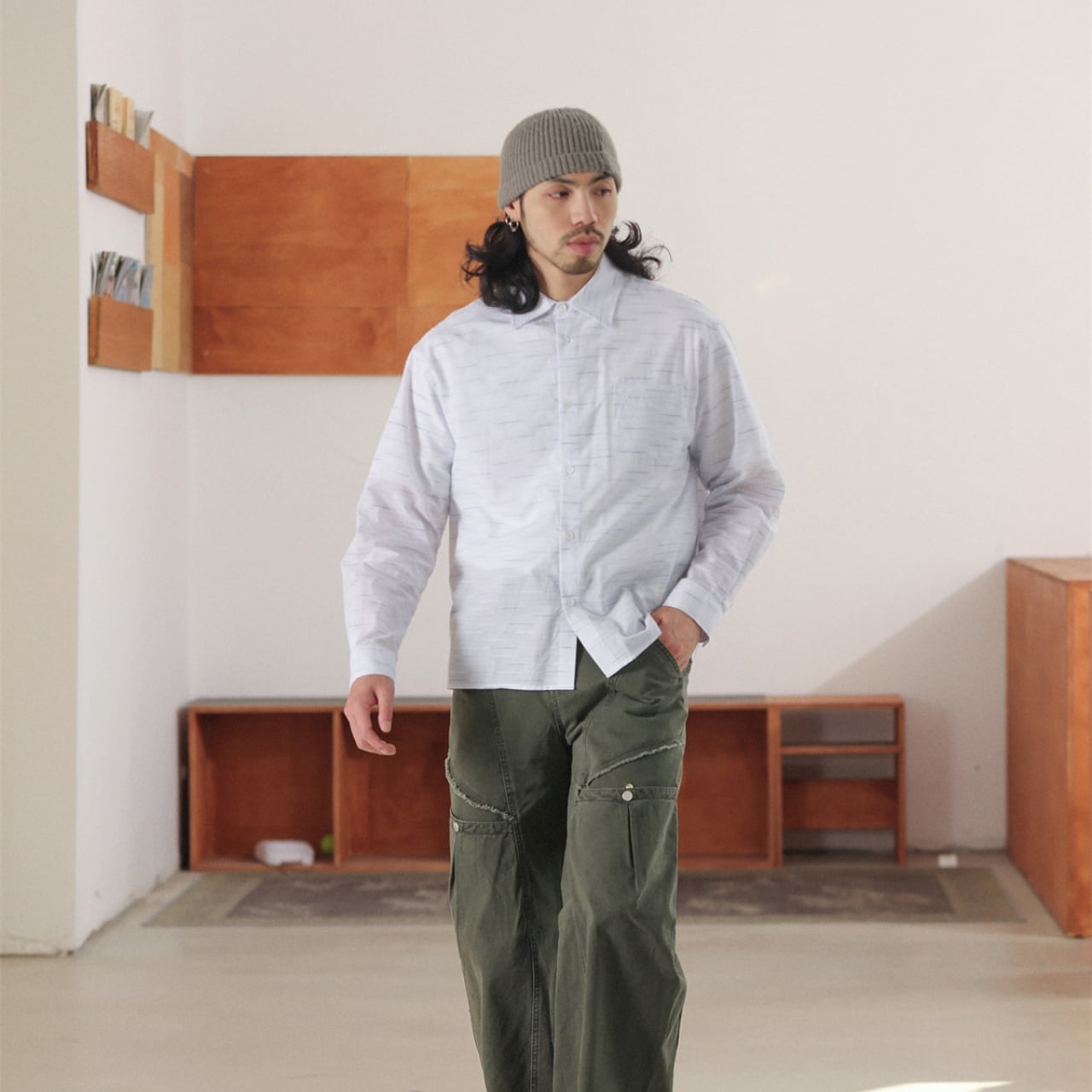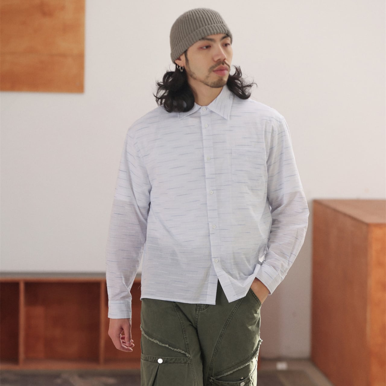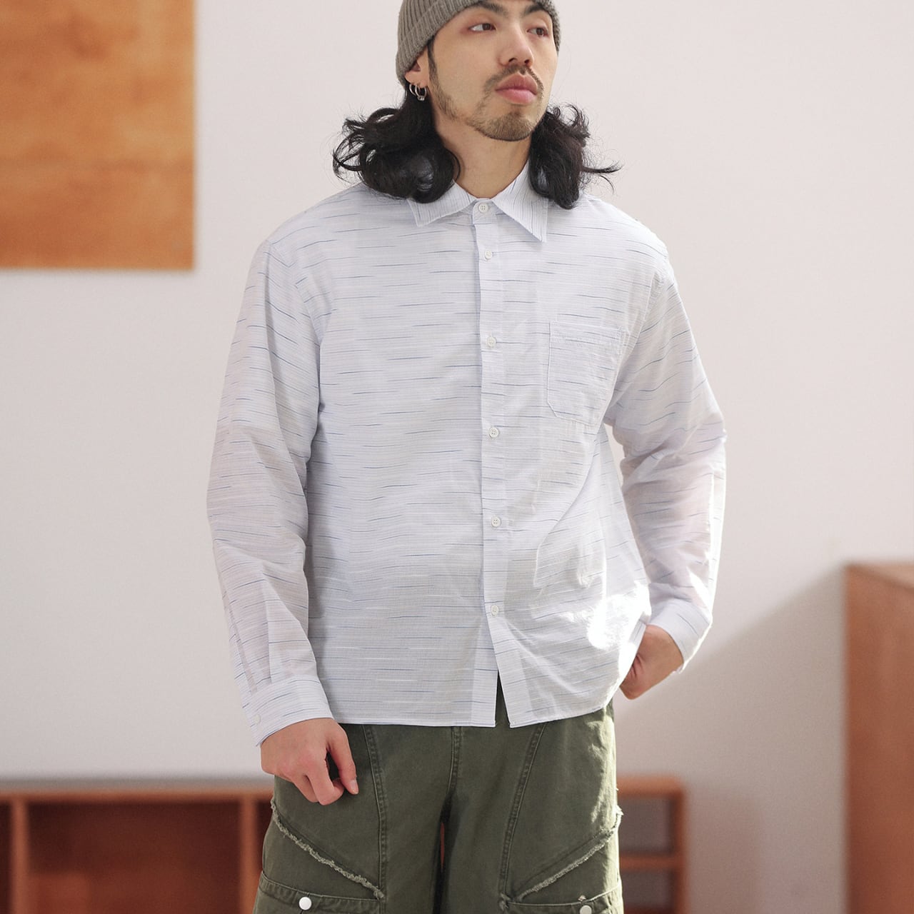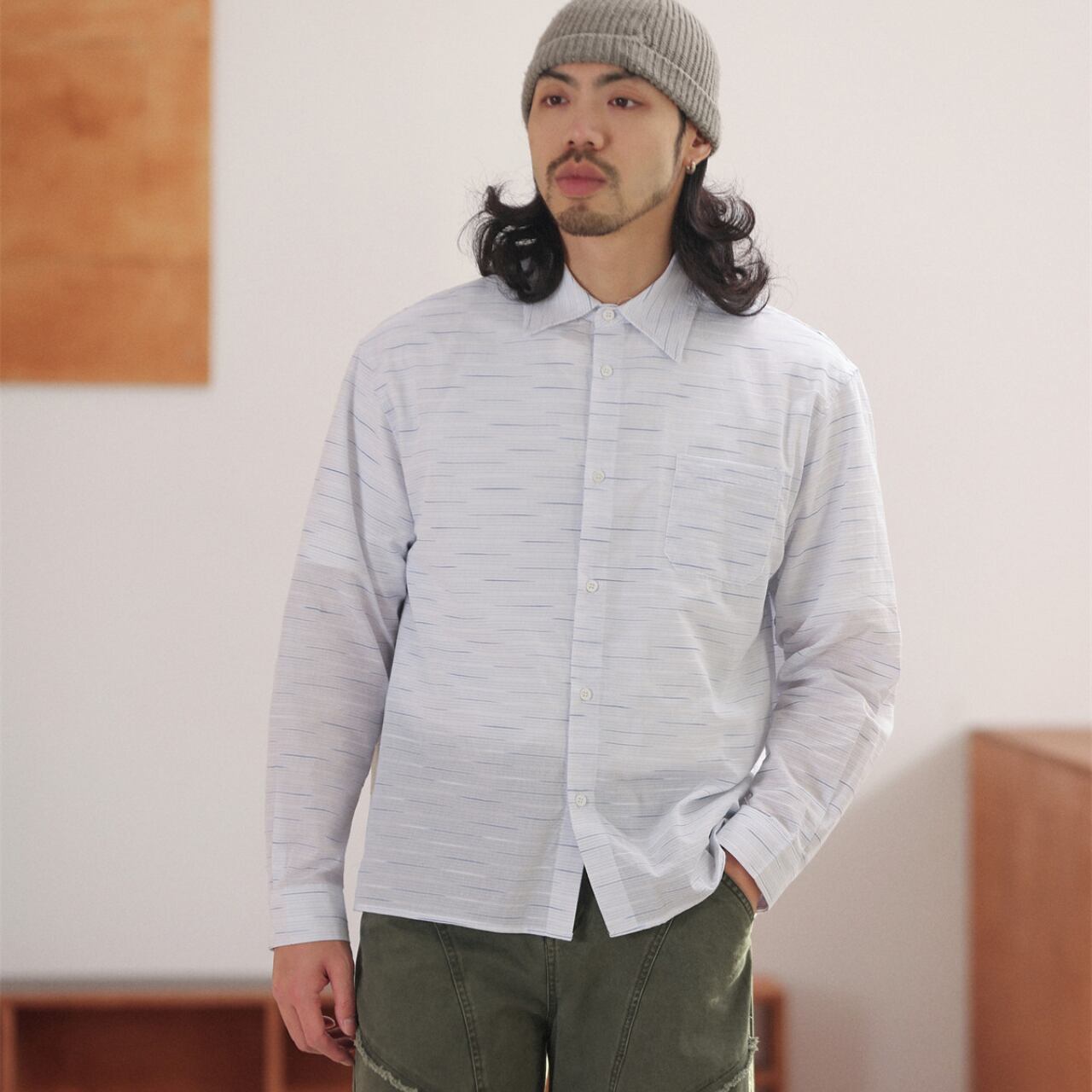 淡いブルーをベースに、細かなストライプ柄がランダムに走るテクスチャーシャツ。光の角度によって表情が変わる織り生地は、無地ライクでありながらも存在感を放つ絶妙な仕上がり。ややワイドなボックスシルエットと短めの着丈が、トレンドのワイドパンツやカーゴパンツとも好相性。インナーにも羽織にも使える万能アイテムで、春のスタイリングに軽やかなアクセントを加えてくれます。