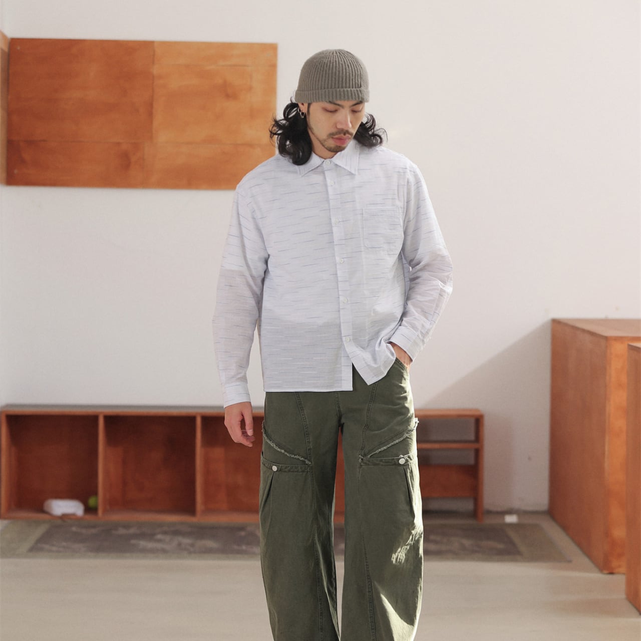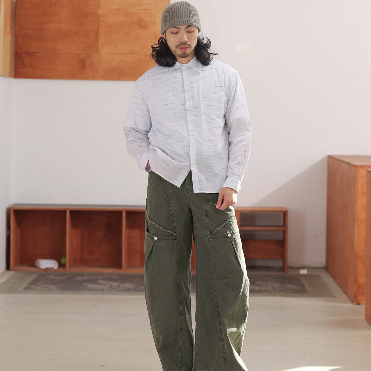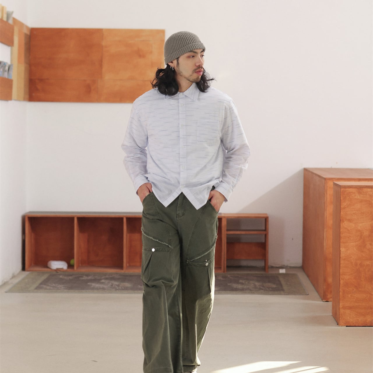 淡いブルーをベースに、細かなストライプ柄がランダムに走るテクスチャーシャツ。光の角度によって表情が変わる織り生地は、無地ライクでありながらも存在感を放つ絶妙な仕上がり。ややワイドなボックスシルエットと短めの着丈が、トレンドのワイドパンツやカーゴパンツとも好相性。インナーにも羽織にも使える万能アイテムで、春のスタイリングに軽やかなアクセントを加えてくれます。