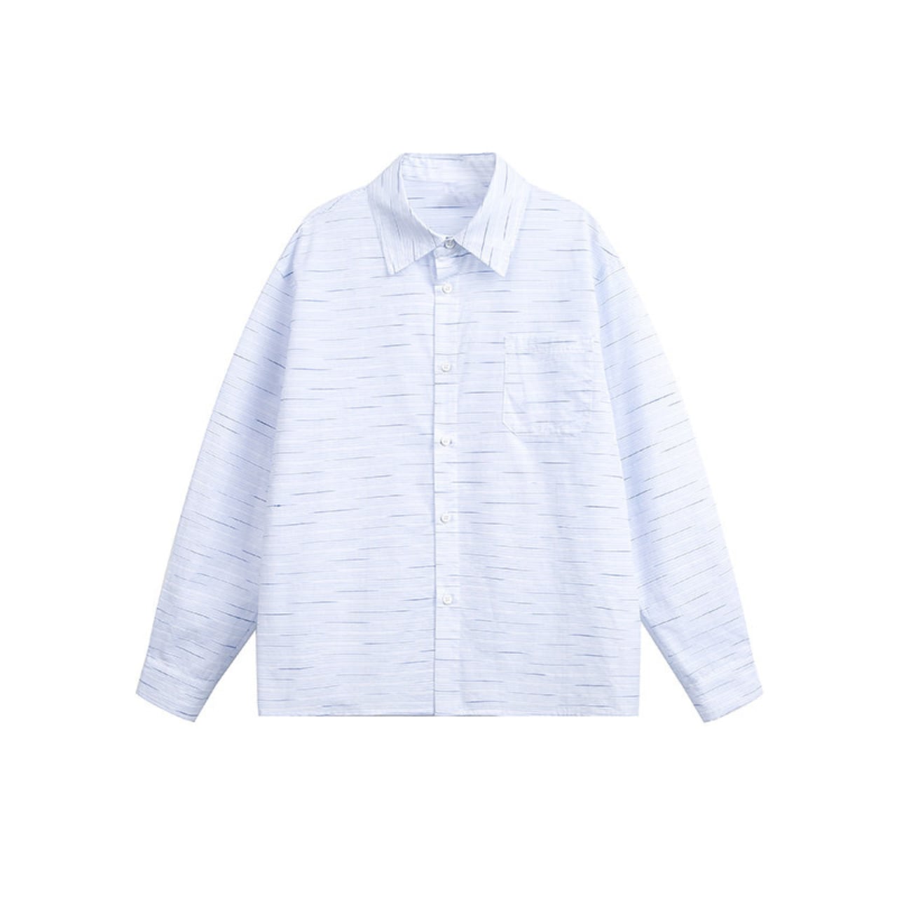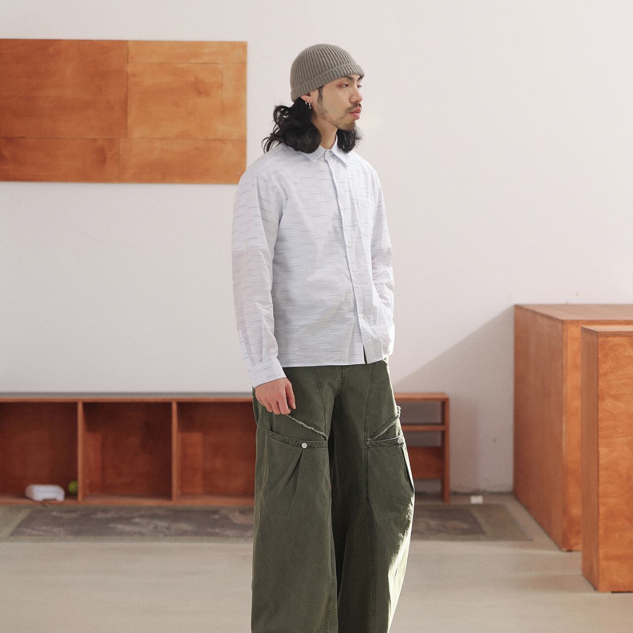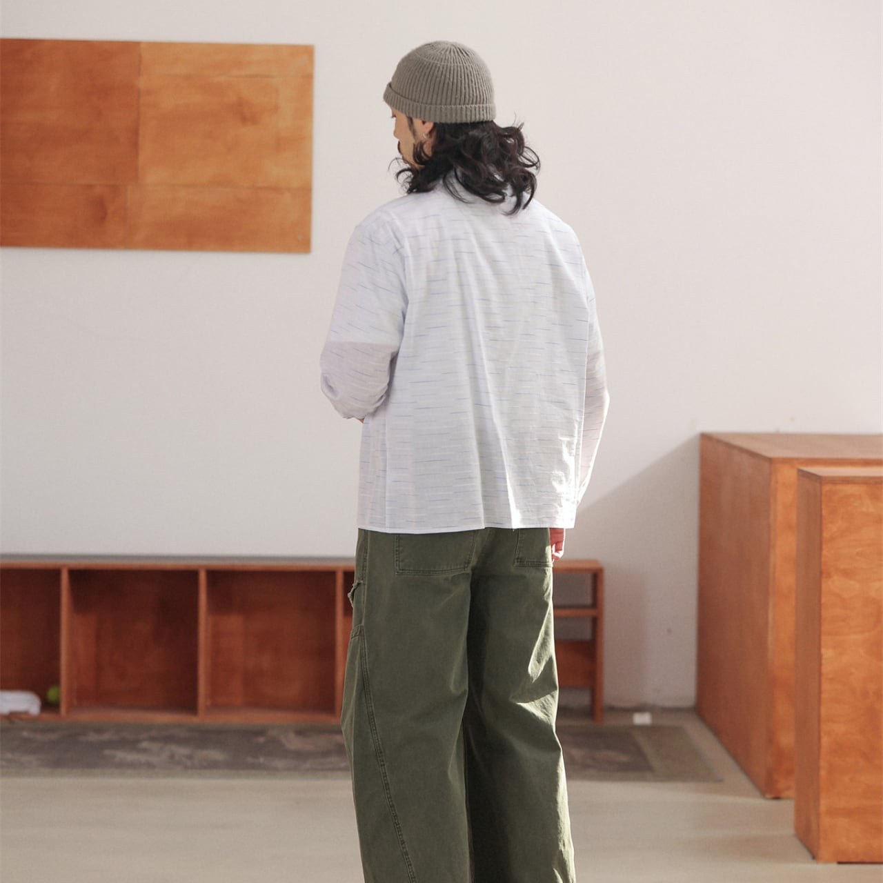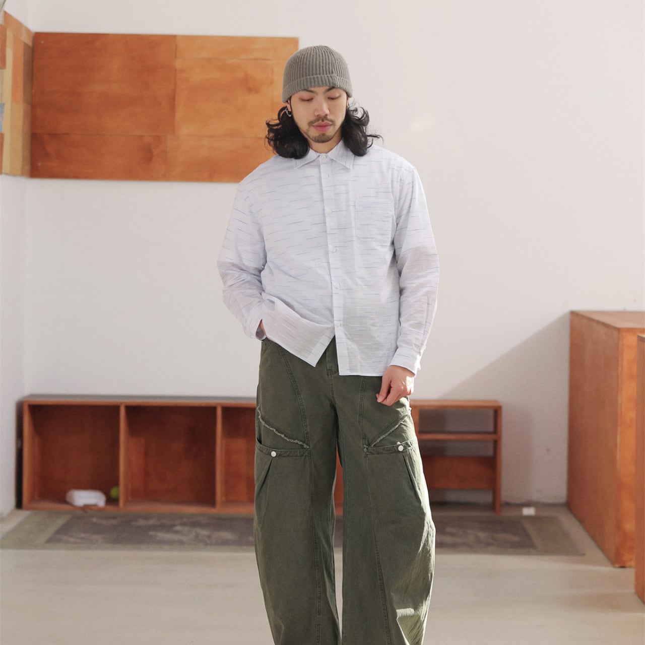 淡いブルーをベースに、細かなストライプ柄がランダムに走るテクスチャーシャツ。光の角度によって表情が変わる織り生地は、無地ライクでありながらも存在感を放つ絶妙な仕上がり。ややワイドなボックスシルエットと短めの着丈が、トレンドのワイドパンツやカーゴパンツとも好相性。インナーにも羽織にも使える万能アイテムで、春のスタイリングに軽やかなアクセントを加えてくれます。