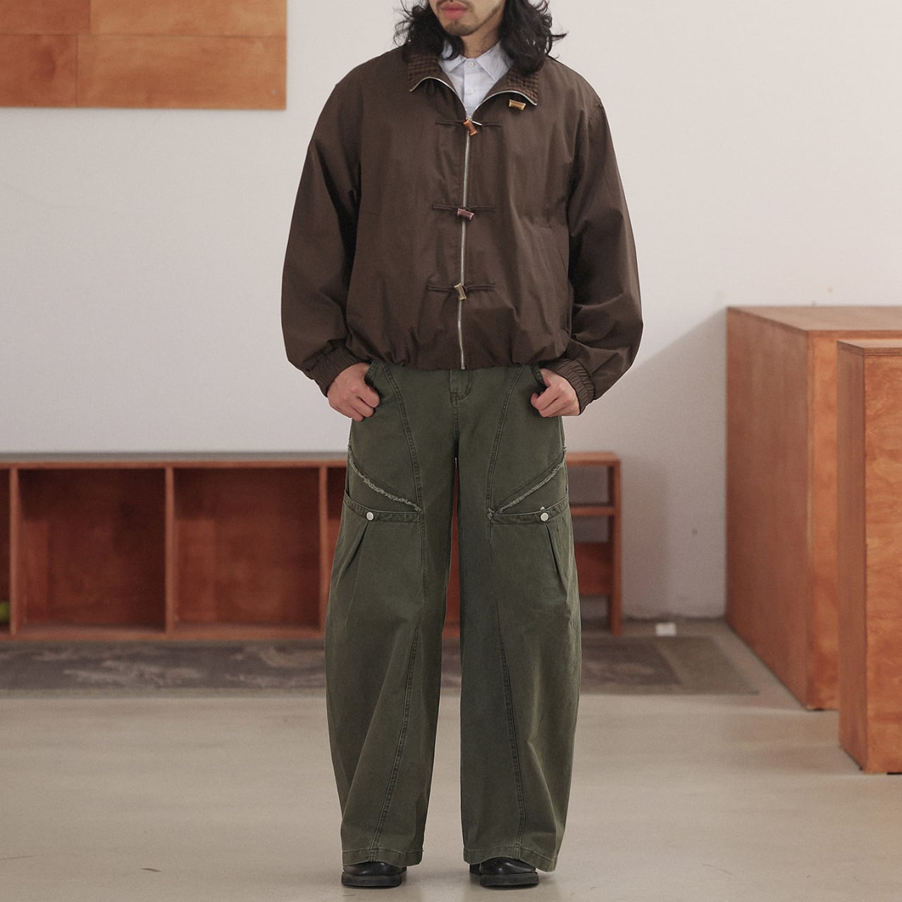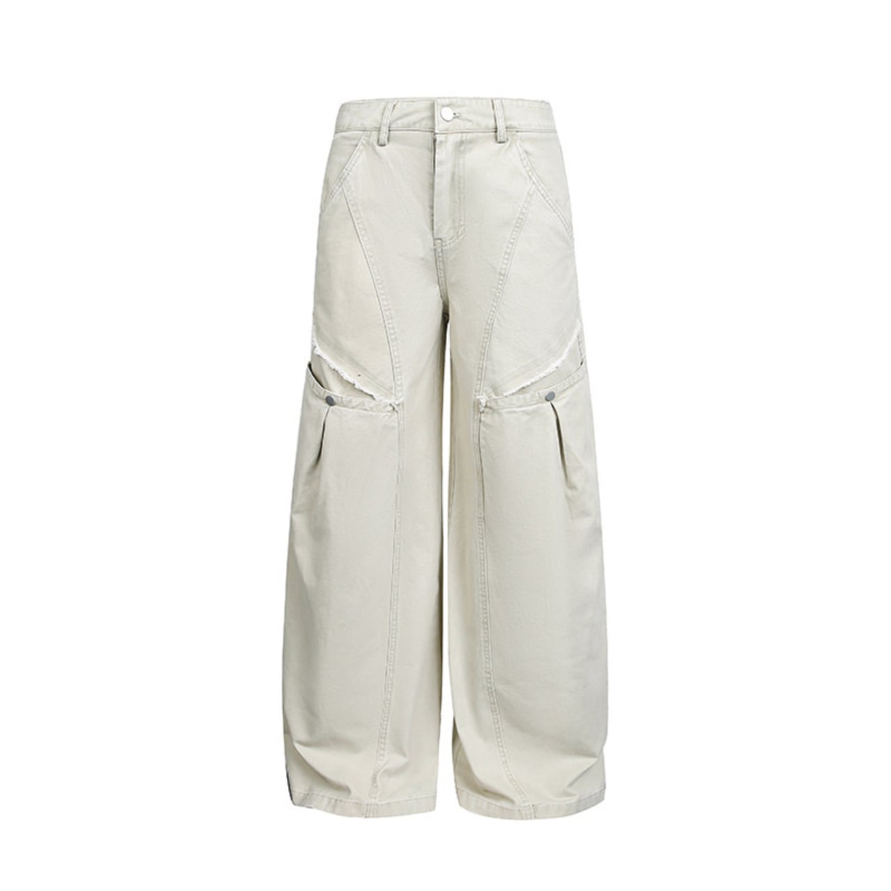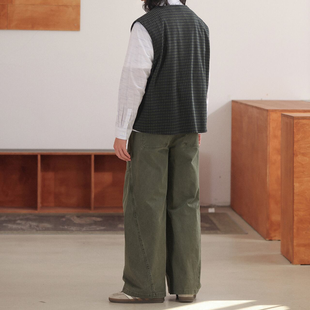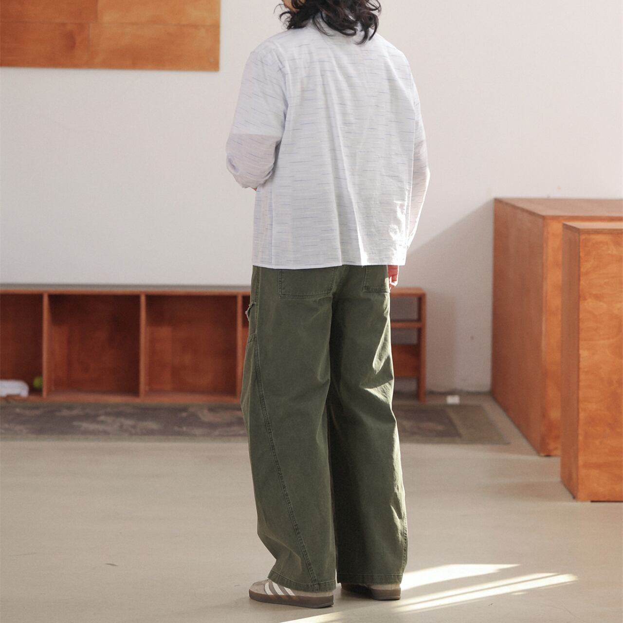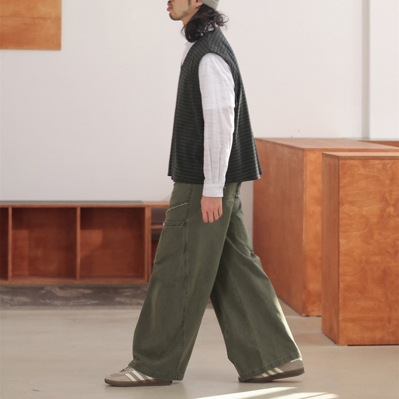 フロントのダーツステッチと断ち切りディテールが、無骨さと抜け感を両立。ヒップや裾にかけてたっぷり広がるワイドシルエットは、スニーカー・ブーツどちらでも様になるボリューム感。街でもアウトドアでもスタイルの主役になる一本です。