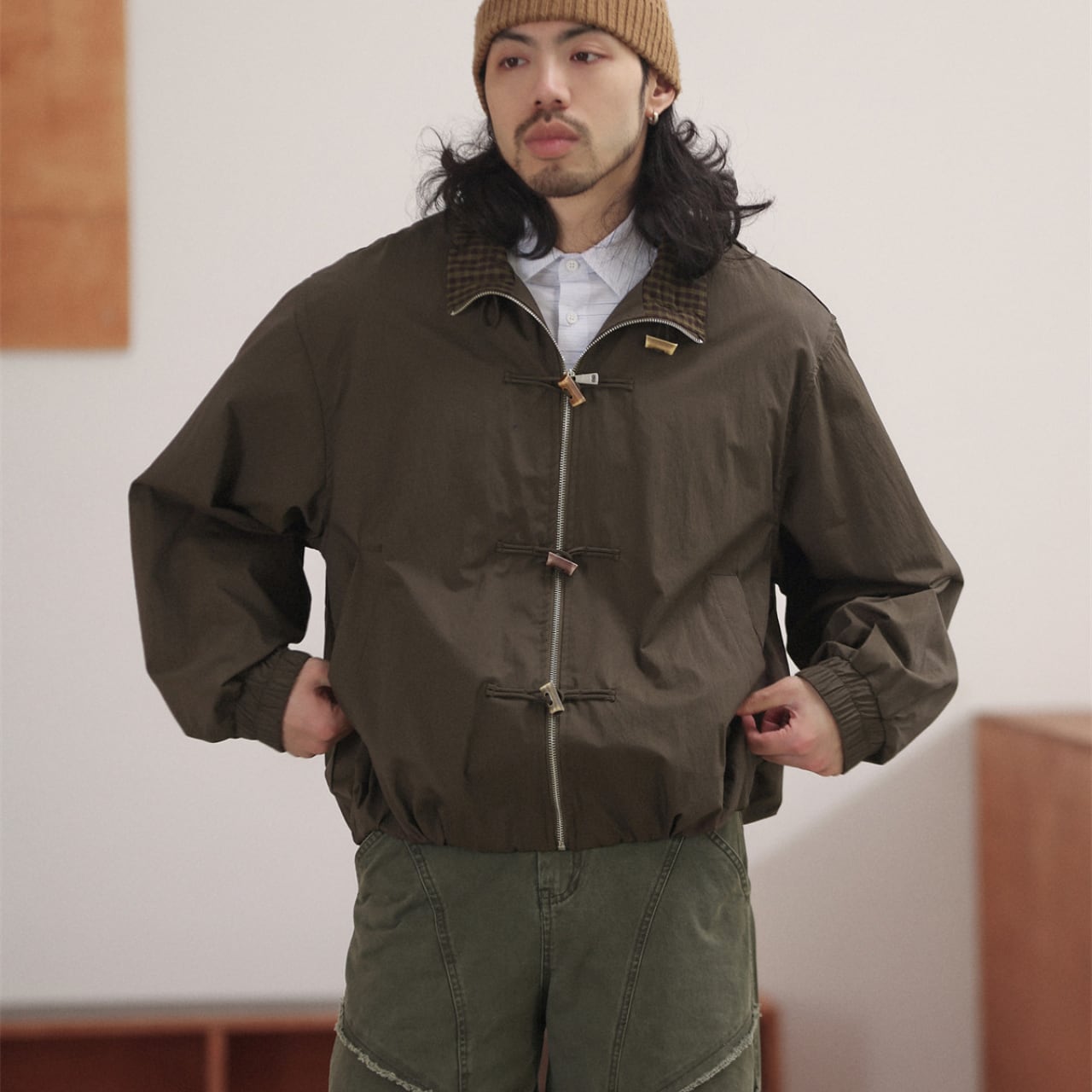 ミリタリー×クラシックを融合させたトグルデザインが特徴のナイロンブルゾン。軽量でシャリ感のあるナイロン混紡素材に、ヴィンテージライクなチェック柄の襟裏がアクセント。トグルとジップの2WAYフロント仕様で、スタイリングの幅も広がります。裾と袖口はギャザー仕様で丸みあるシルエットを演出。