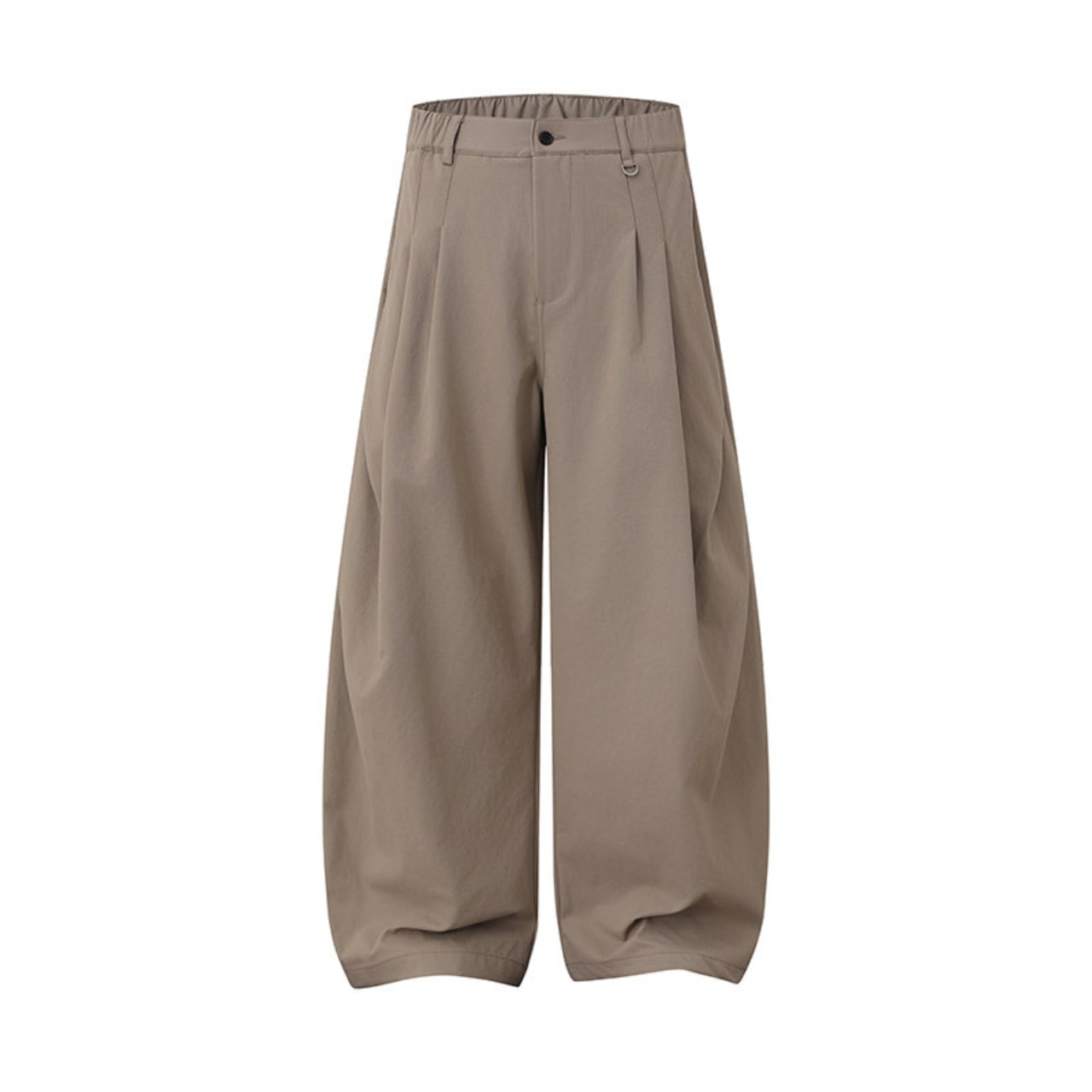 程よいハリ感のあるポリエステル生地を使用した、立体感際立つ極太ワイドパンツ。深めのタックと裾のドローコードボタンで、ボリュームを出しながらも自在なシルエット調整が可能。ウエストは背面ゴム+ベルトループ付きで快適な履き心地とフィット感を両立。シャツやスウェットと合わせるだけで抜群の存在感を放つ、主役ボトムスとして活躍します。