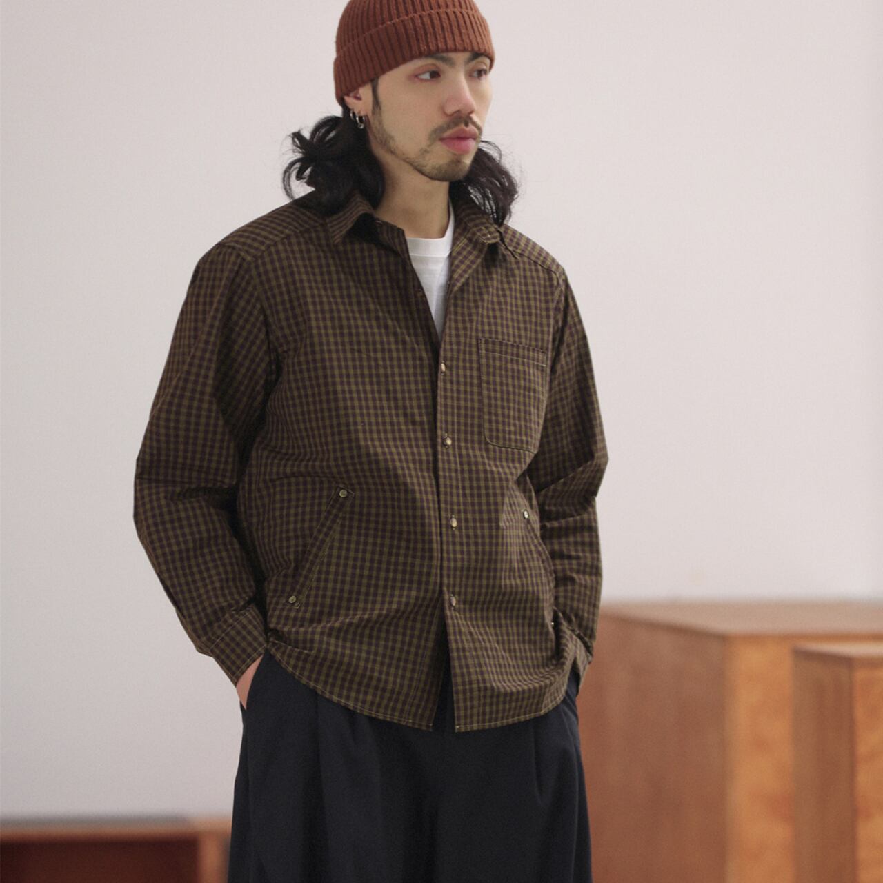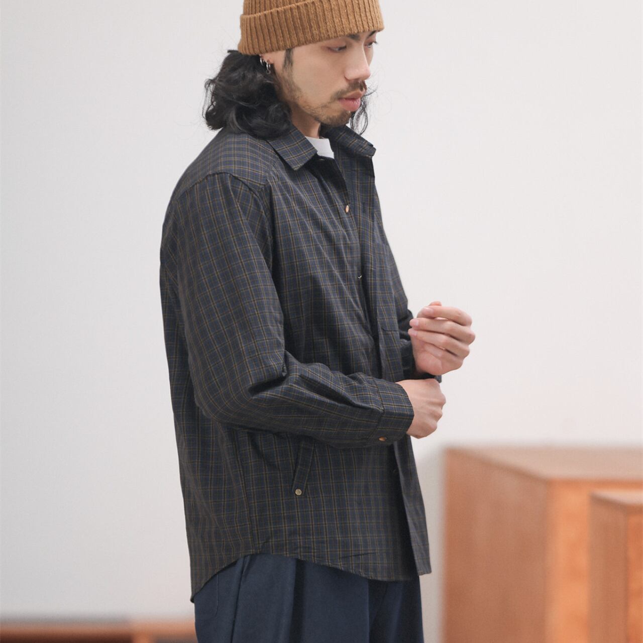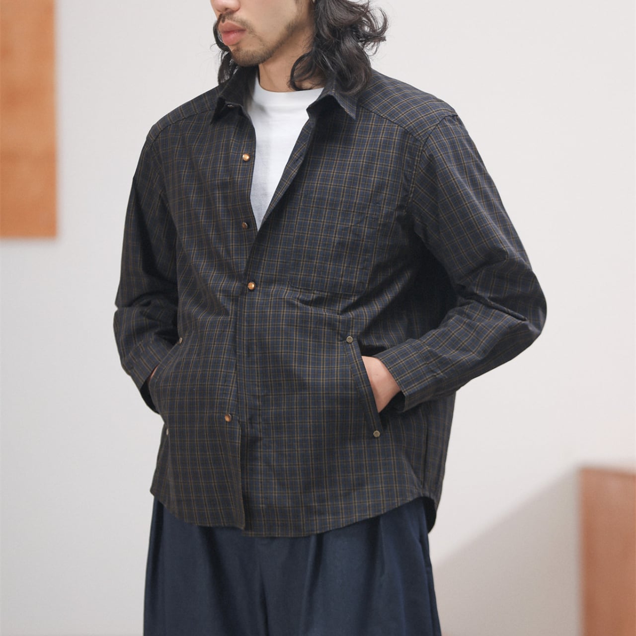 程よくハリのあるコットン混素材に、クラシカルなチェック柄を乗せたスナップボタンシャツ。襟付きでジャケットライクに羽織れる汎用性の高さが魅力で、春先のライトアウターとしても、冬場のレイヤードアイテムとしても活躍。