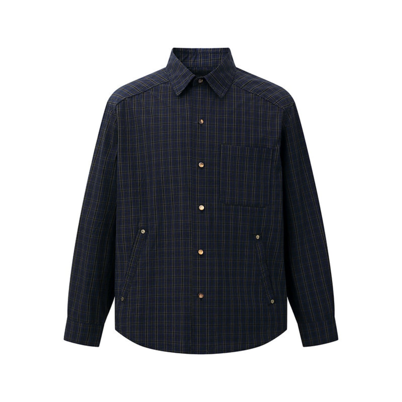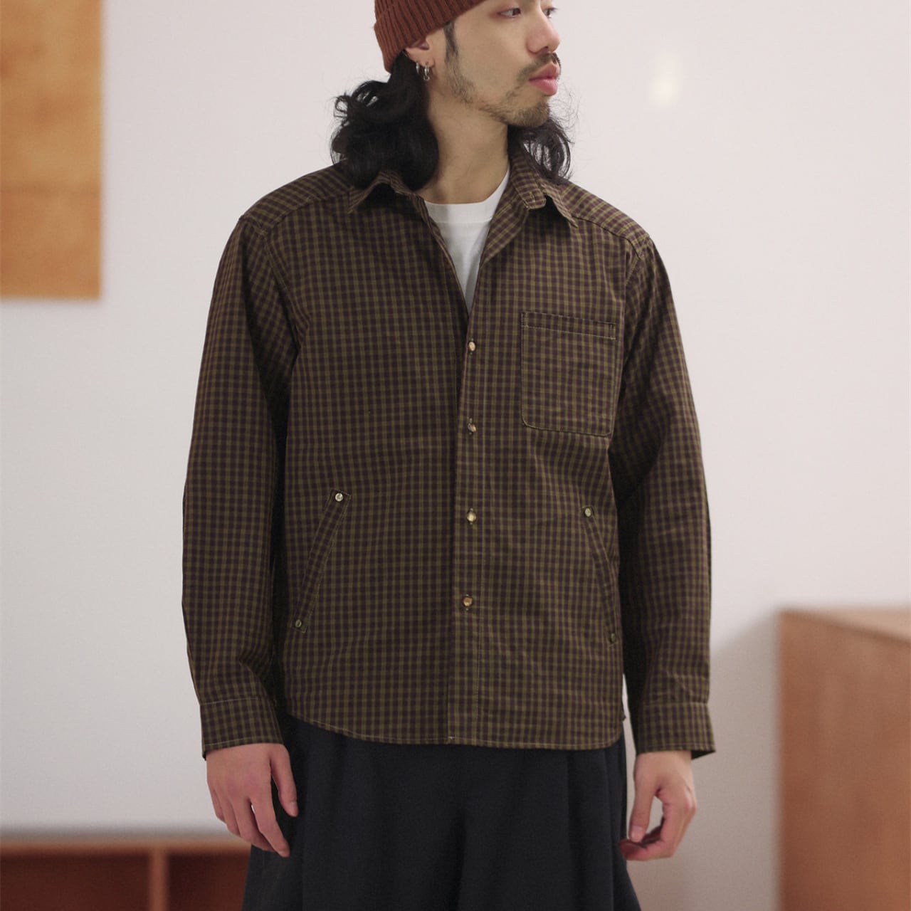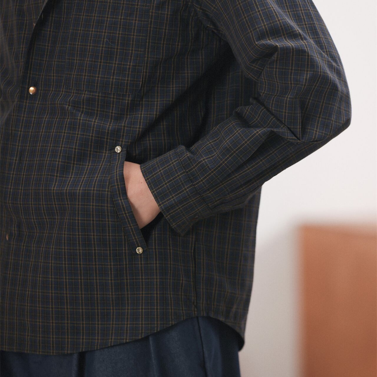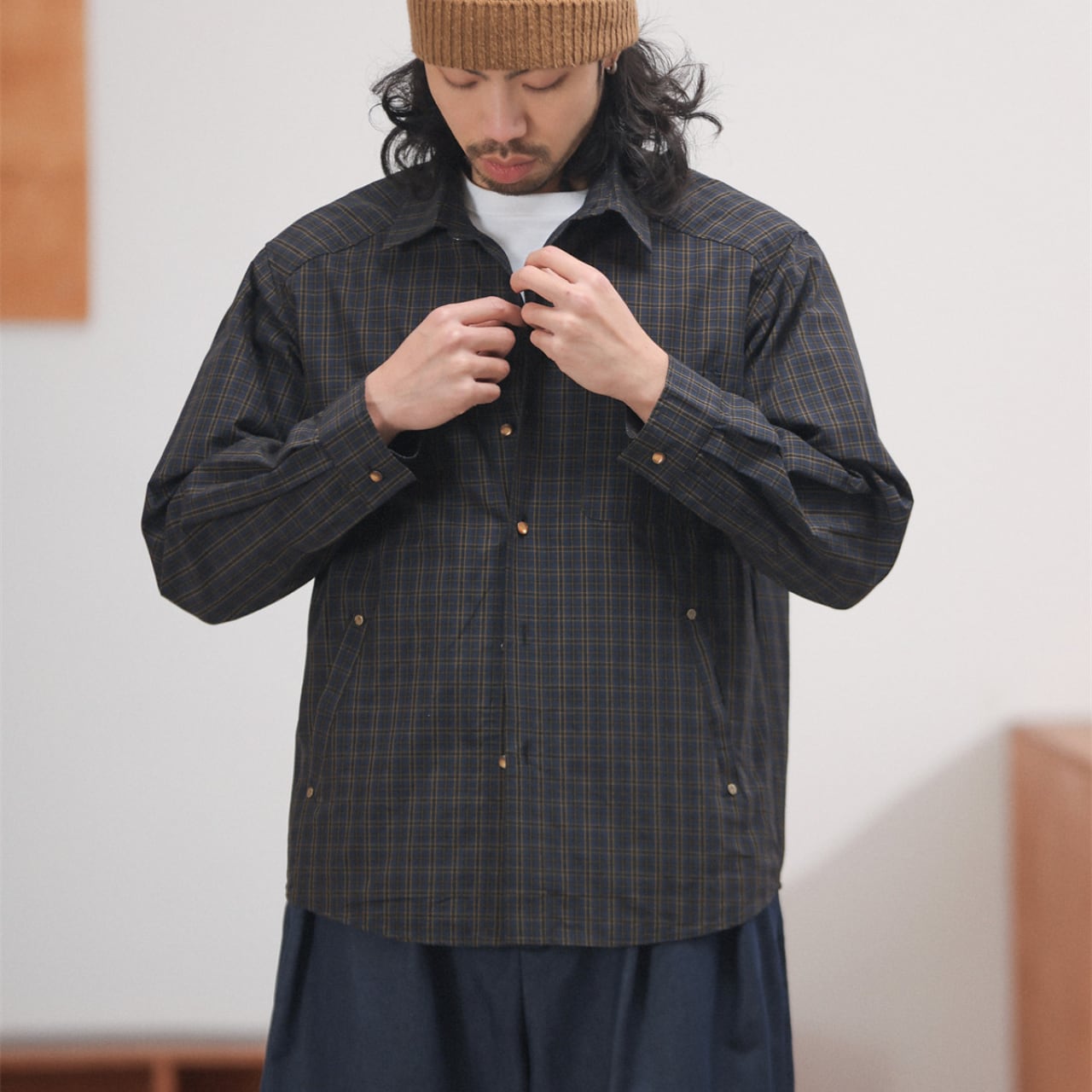 程よくハリのあるコットン混素材に、クラシカルなチェック柄を乗せたスナップボタンシャツ。襟付きでジャケットライクに羽織れる汎用性の高さが魅力で、春先のライトアウターとしても、冬場のレイヤードアイテムとしても活躍。