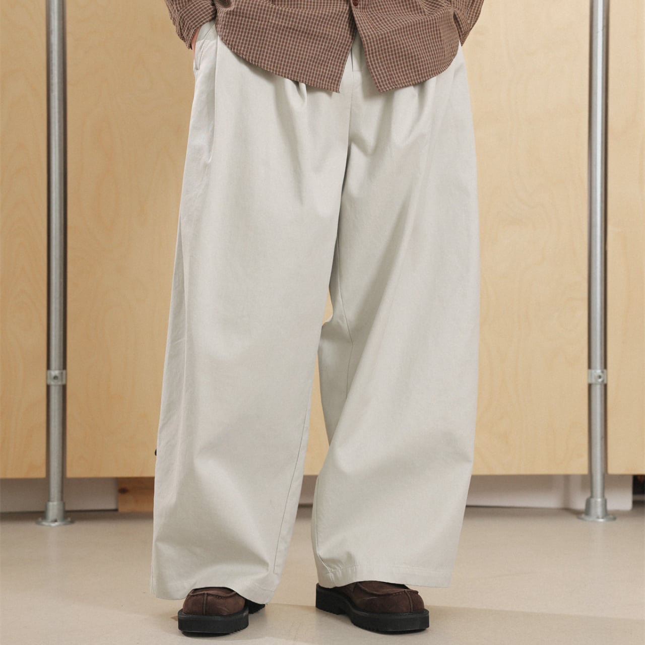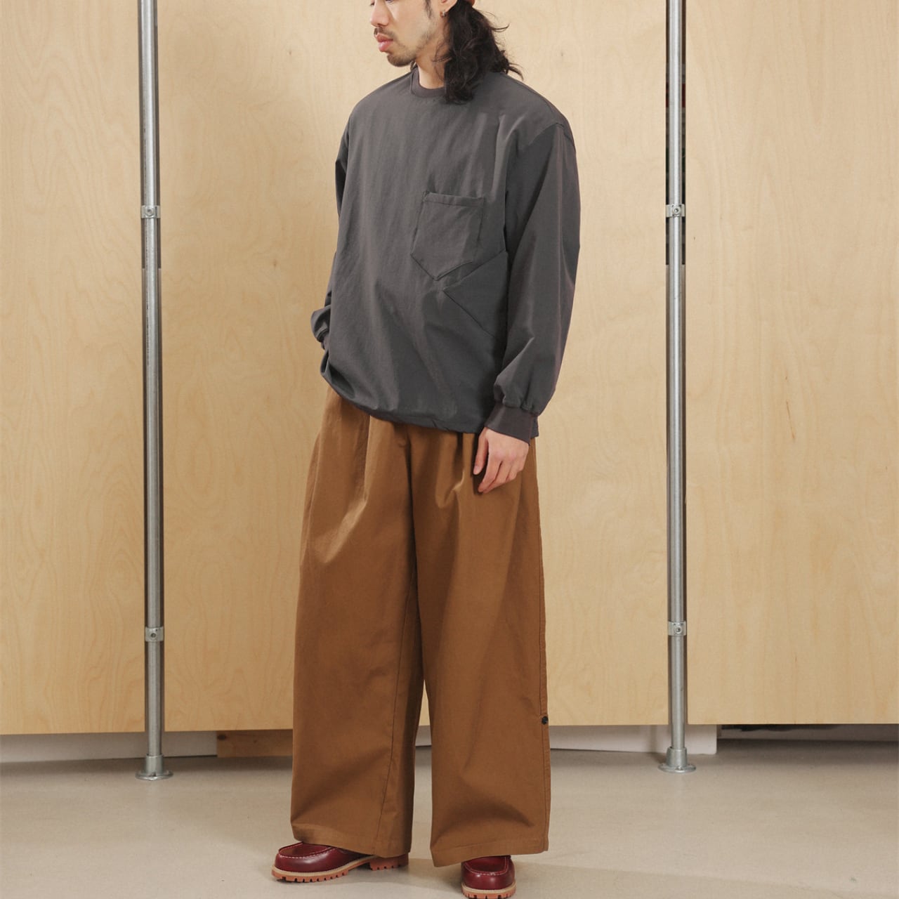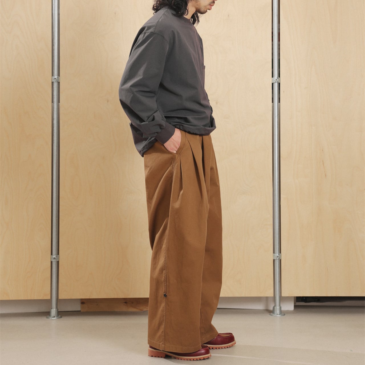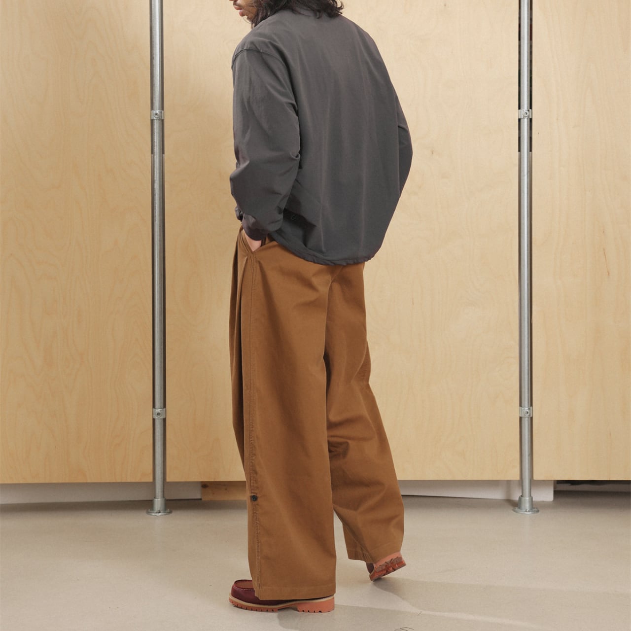 シャツやスウェットとの相性も抜群で、ミニマルにもレトロにも振れる万能パンツです。