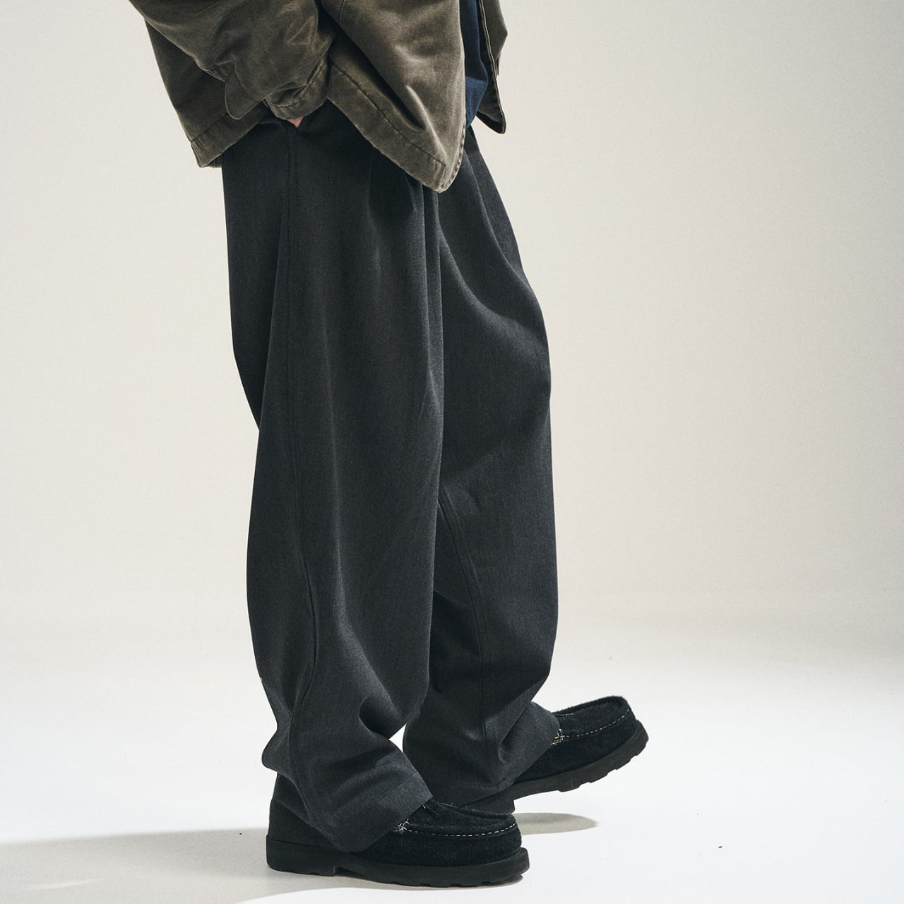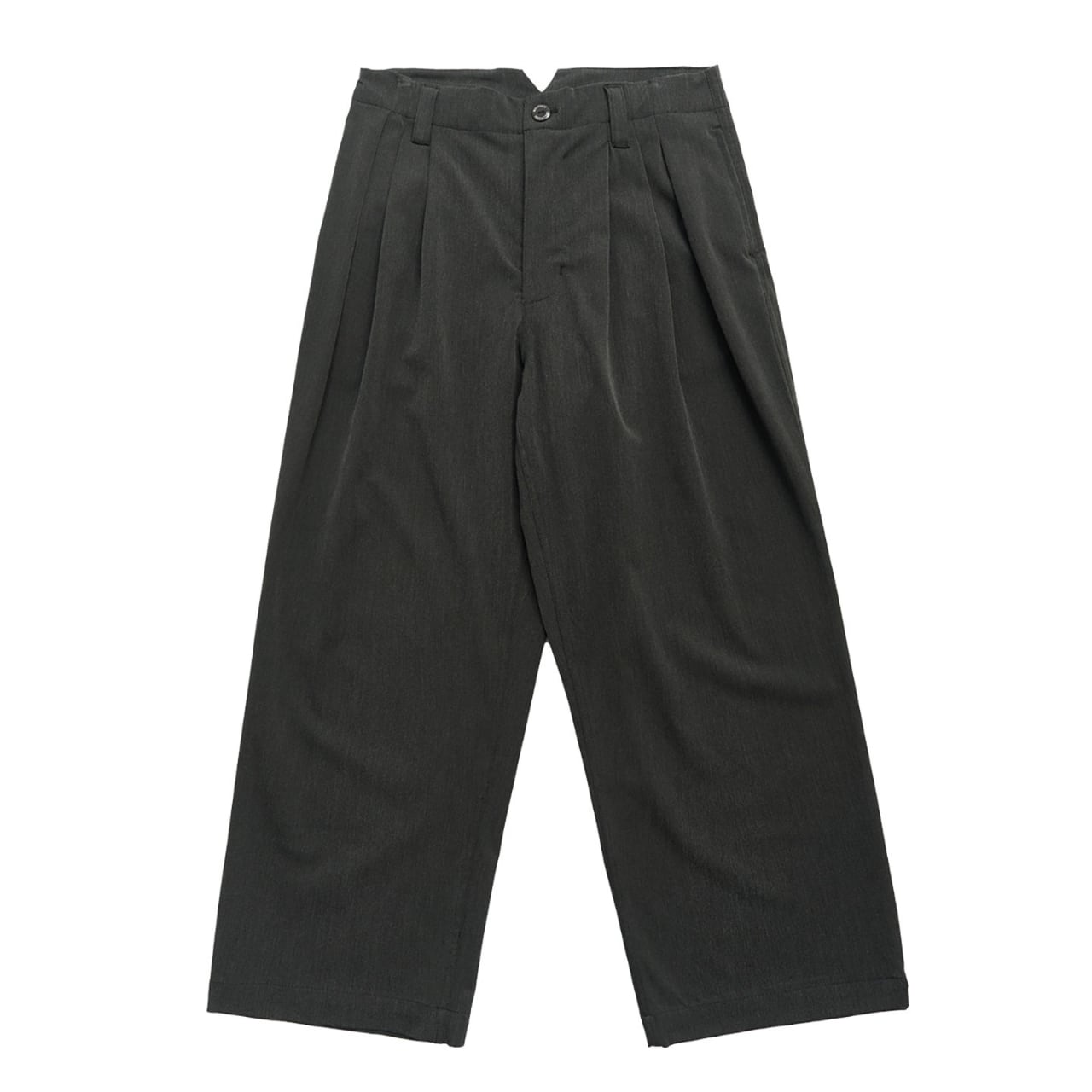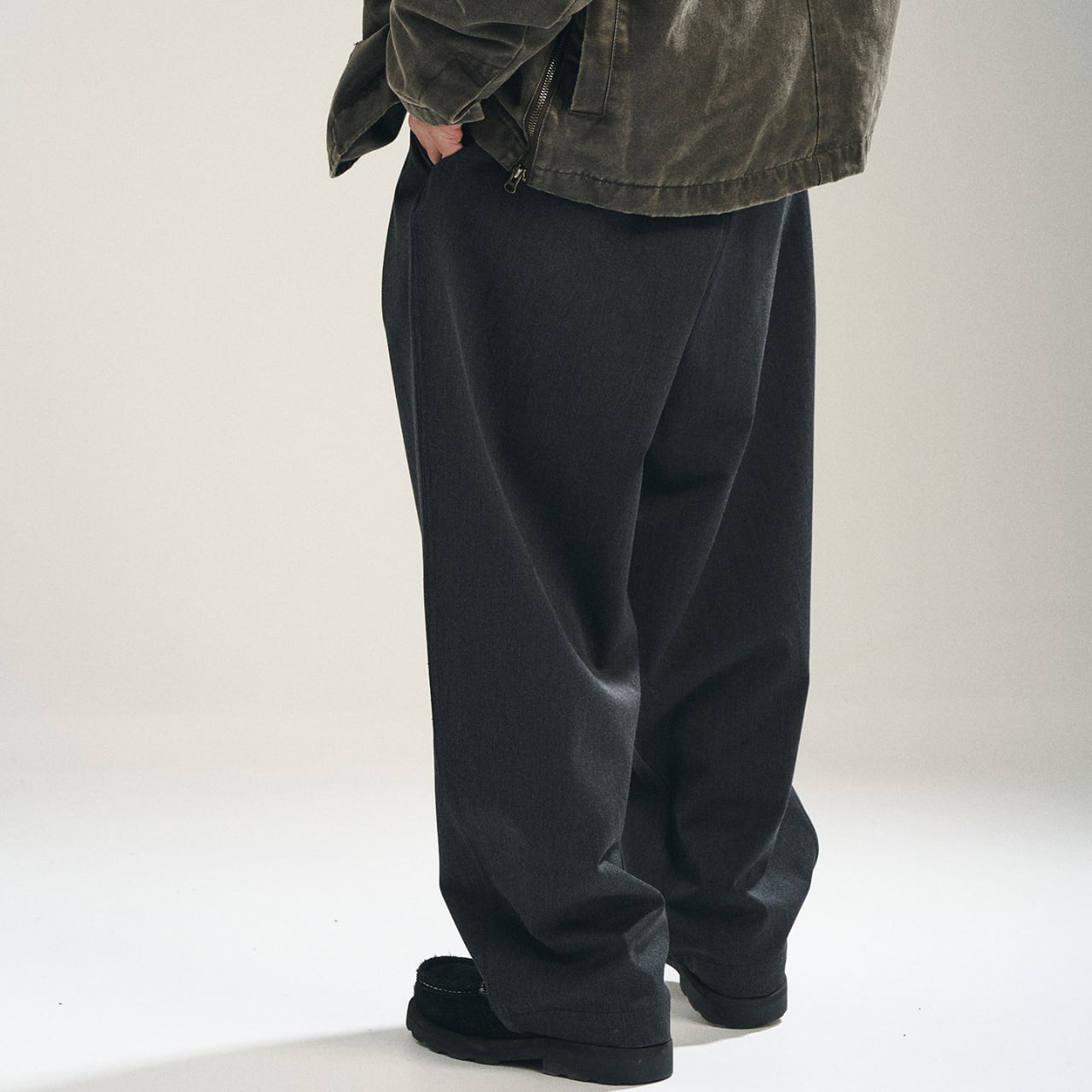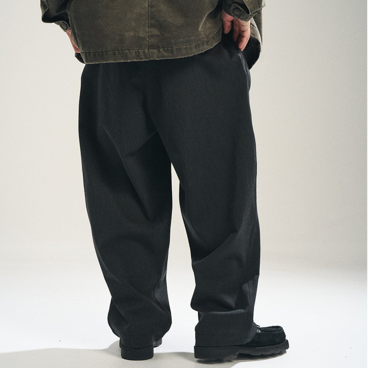 程よく落ち感のある深いチャコールグレーの生地に、ヴィンテージの空気を纏ったタック入りワイドスラックス。しっかりとした厚みと、パリッとしたポリエステル混素材が絶妙なバランスを保ち、上品ながらも無骨なストリートスタイルに仕上がっています。ウエストにはサイズ調整可能なバックル付きで、シャツインもサマになる仕様。スタイリング次第でモードにもワークにも振れる万能パンツです。