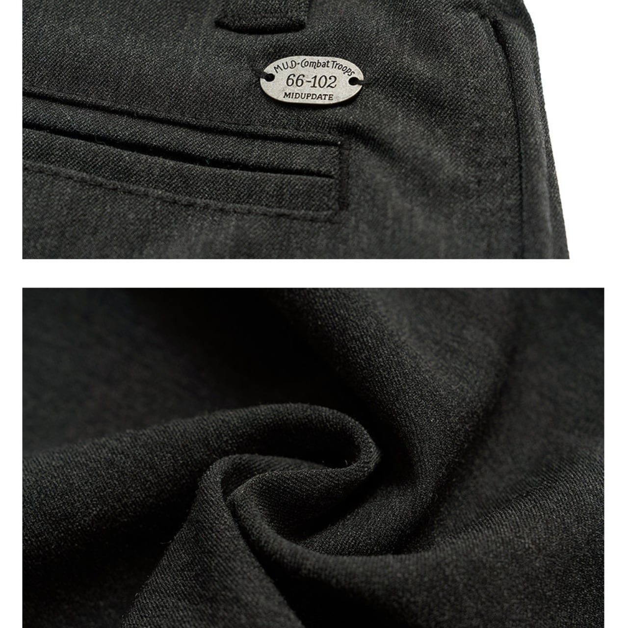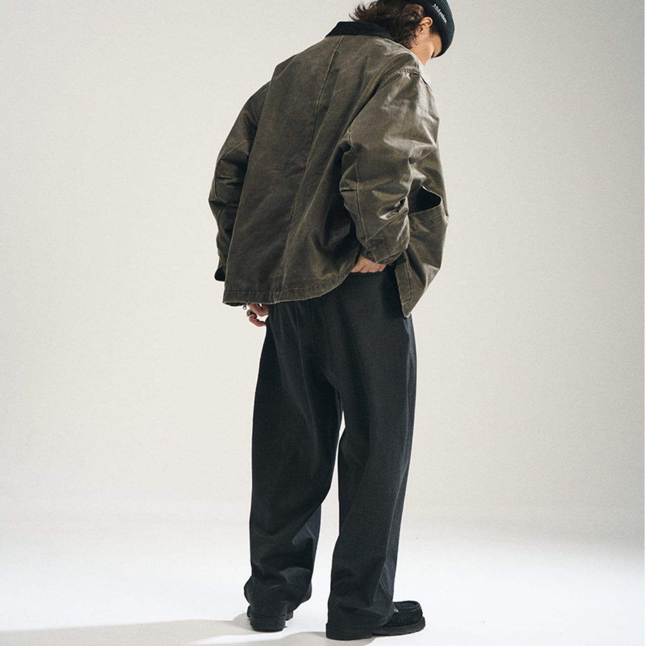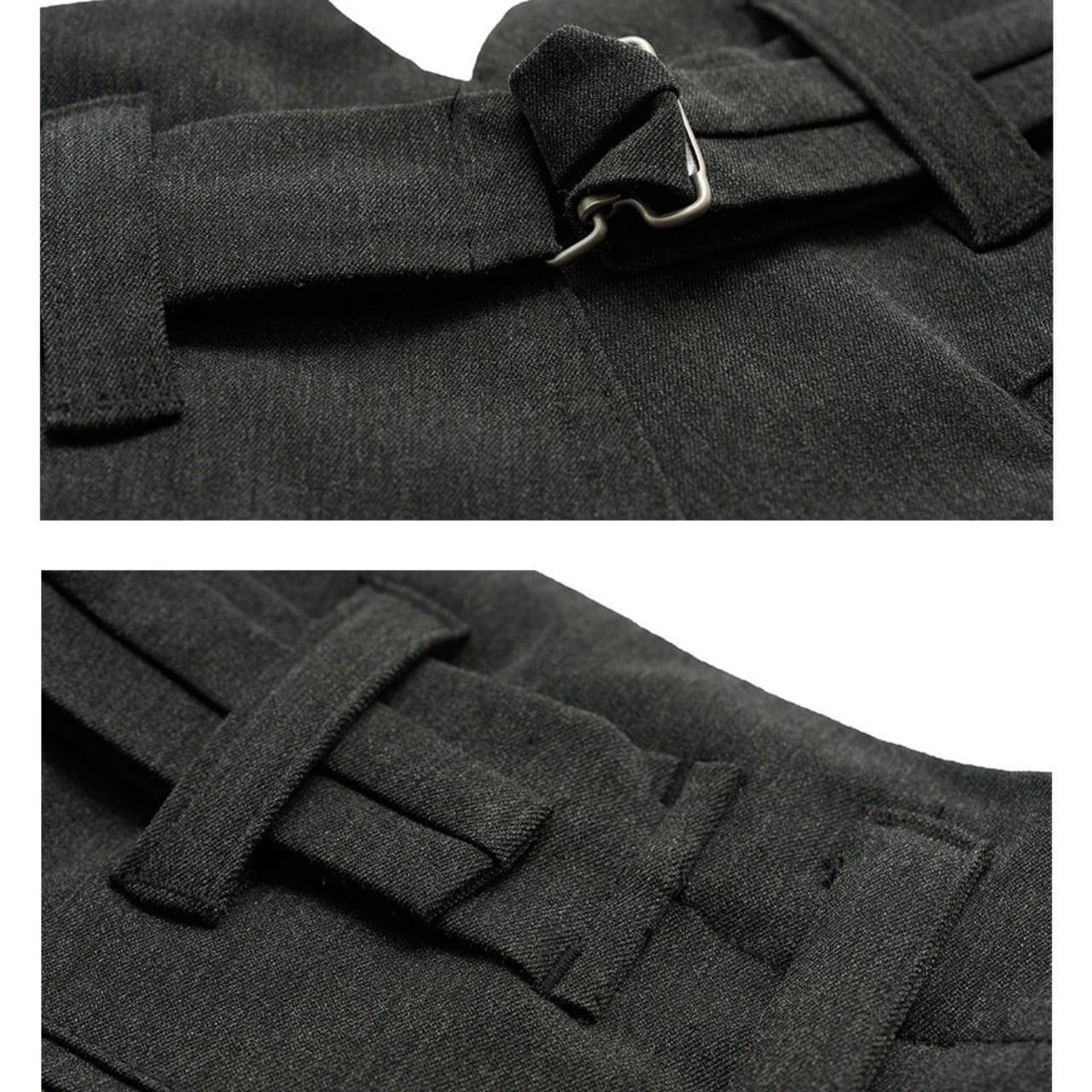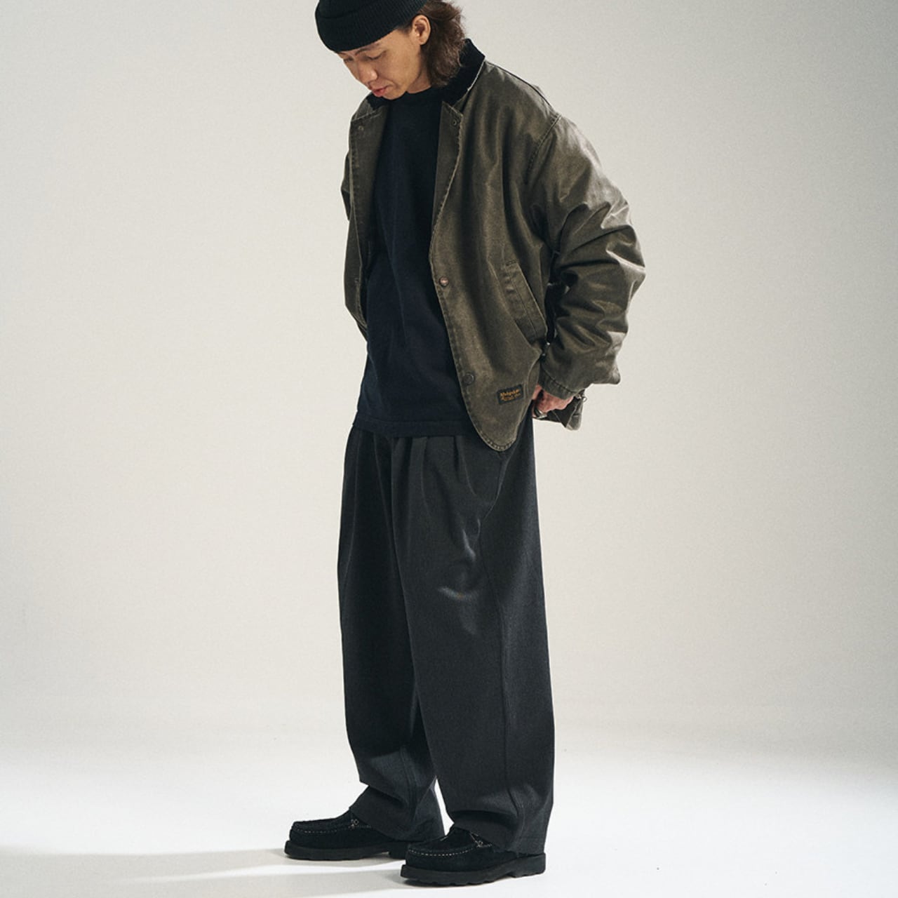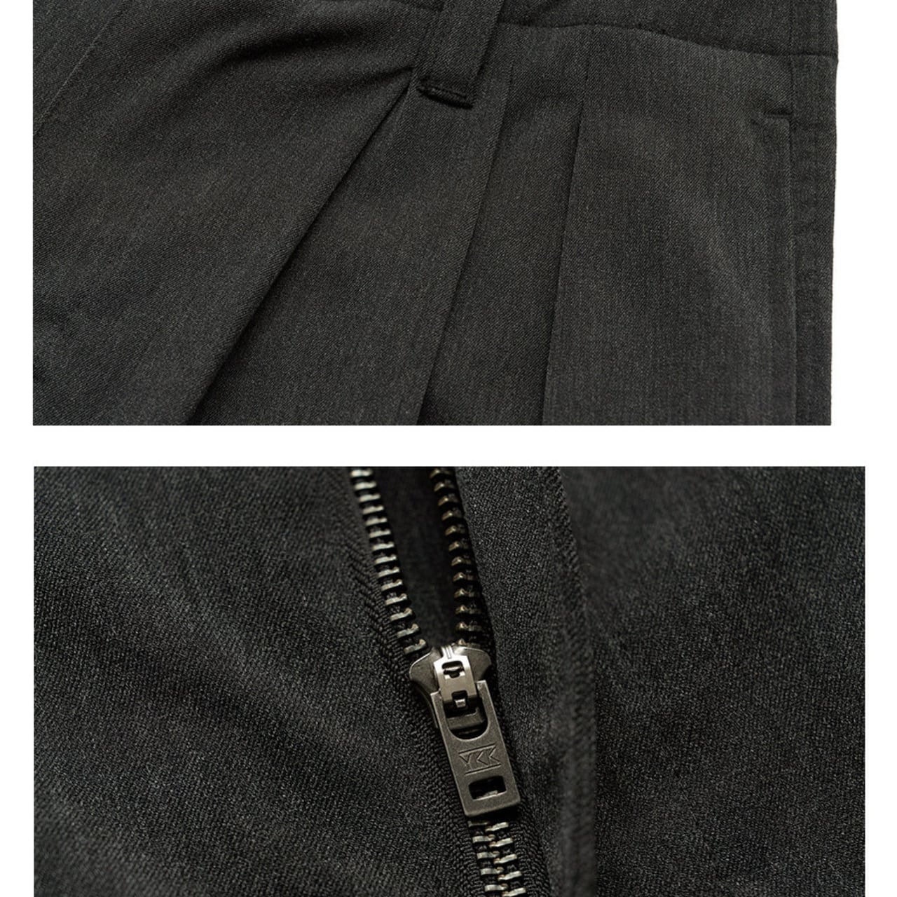 程よく落ち感のある深いチャコールグレーの生地に、ヴィンテージの空気を纏ったタック入りワイドスラックス。しっかりとした厚みと、パリッとしたポリエステル混素材が絶妙なバランスを保ち、上品ながらも無骨なストリートスタイルに仕上がっています。ウエストにはサイズ調整可能なバックル付きで、シャツインもサマになる仕様。スタイリング次第でモードにもワークにも振れる万能パンツです。