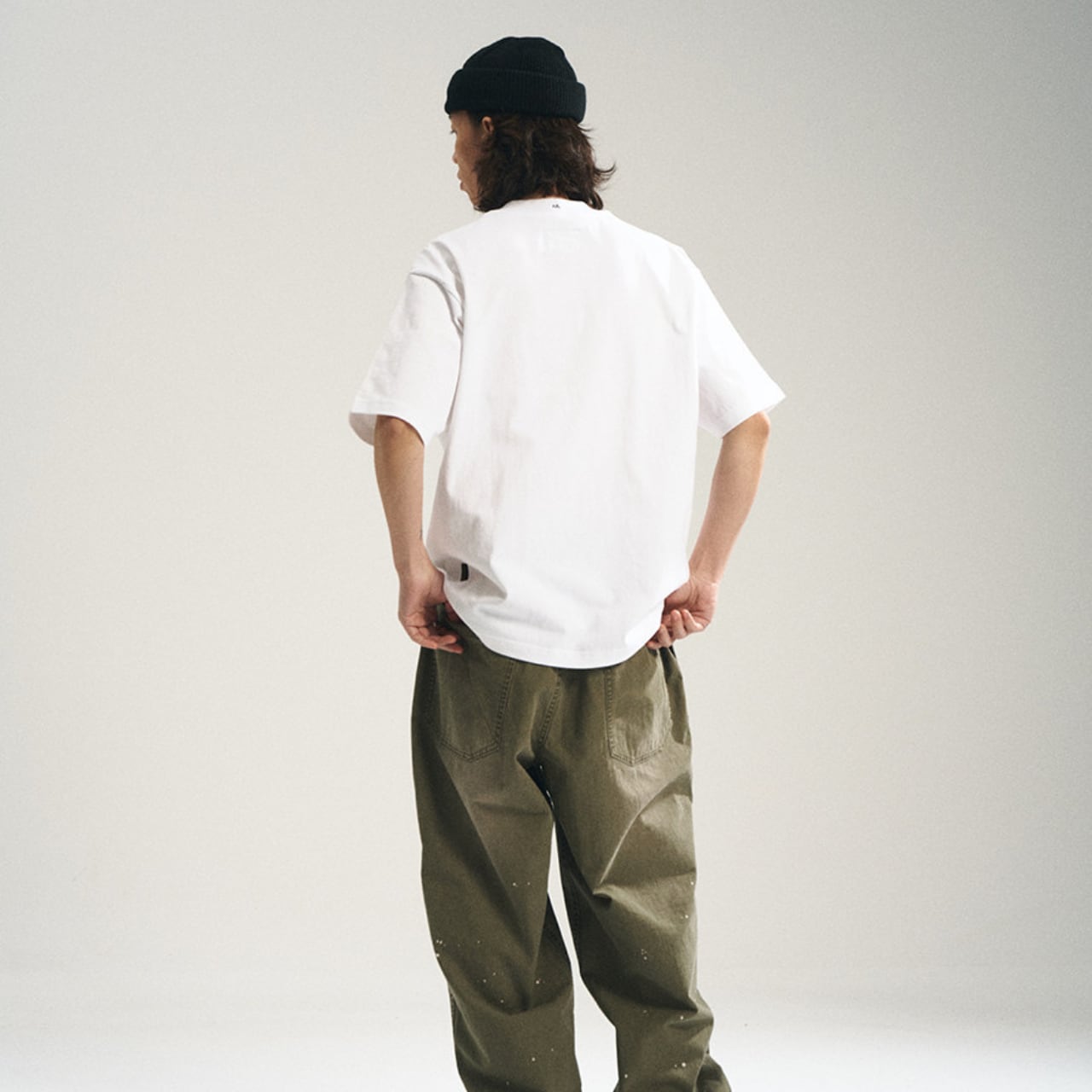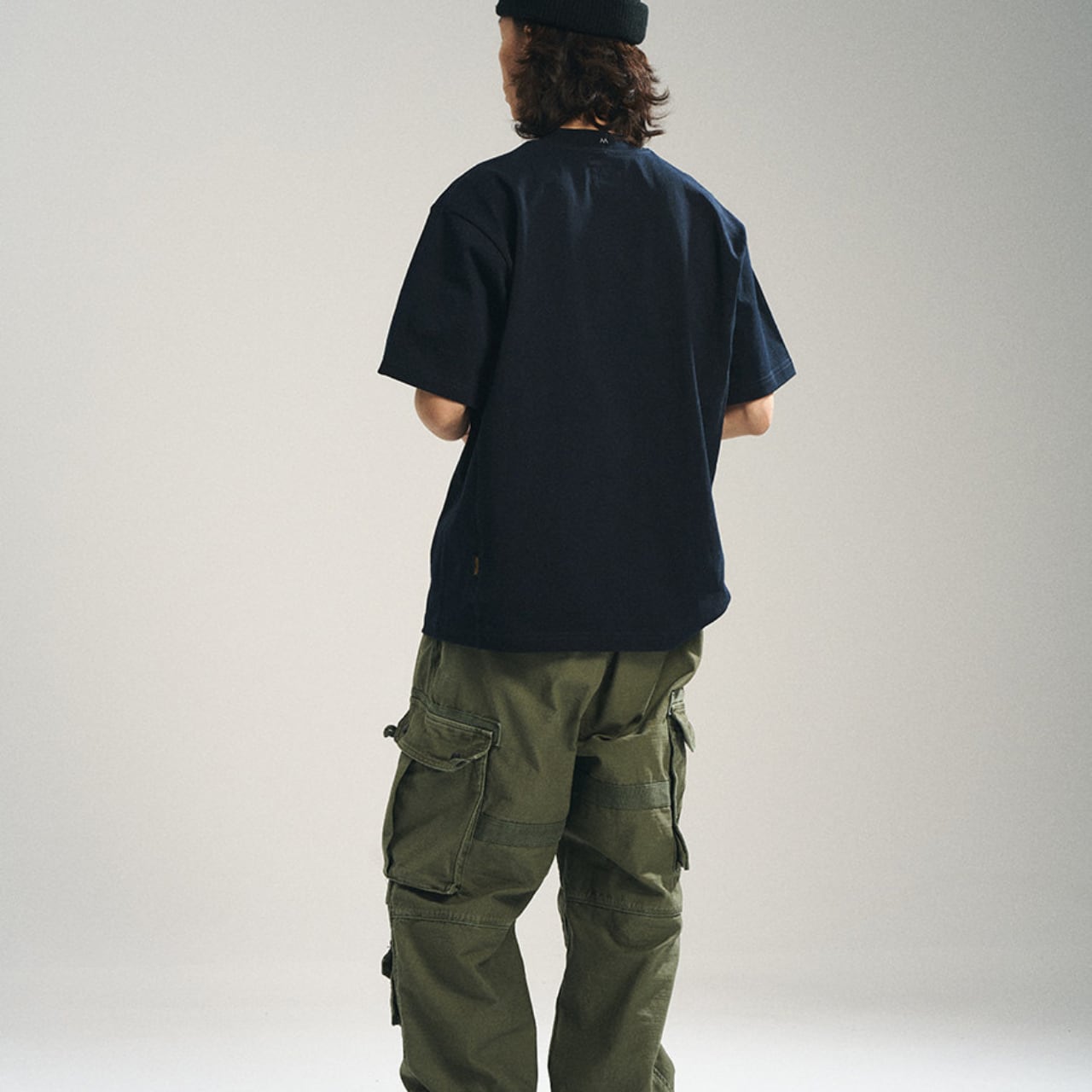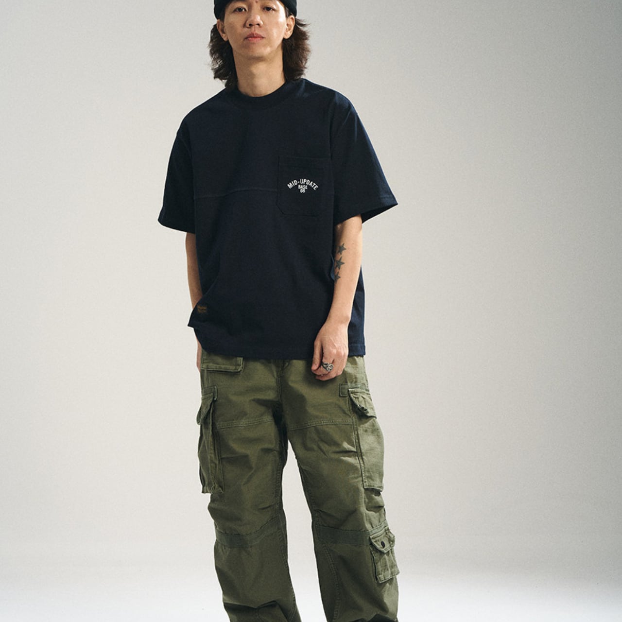 武骨なミリタリールーツをモダンに再構築した、厚手コットンのポケットTシャツ。しっかりとした生地感に、田島刺繍機による高密度ロゴ刺繍をあしらった存在感のある一枚。ワイドなドロップショルダー仕様とフロントパネルの切替デザインが、シンプルながらも立体感を演出します。カーゴパンツやワークパンツと合わせて、無骨でラフなスタイルに最適。インナーにも一枚着にも使える万能なTシャツです。