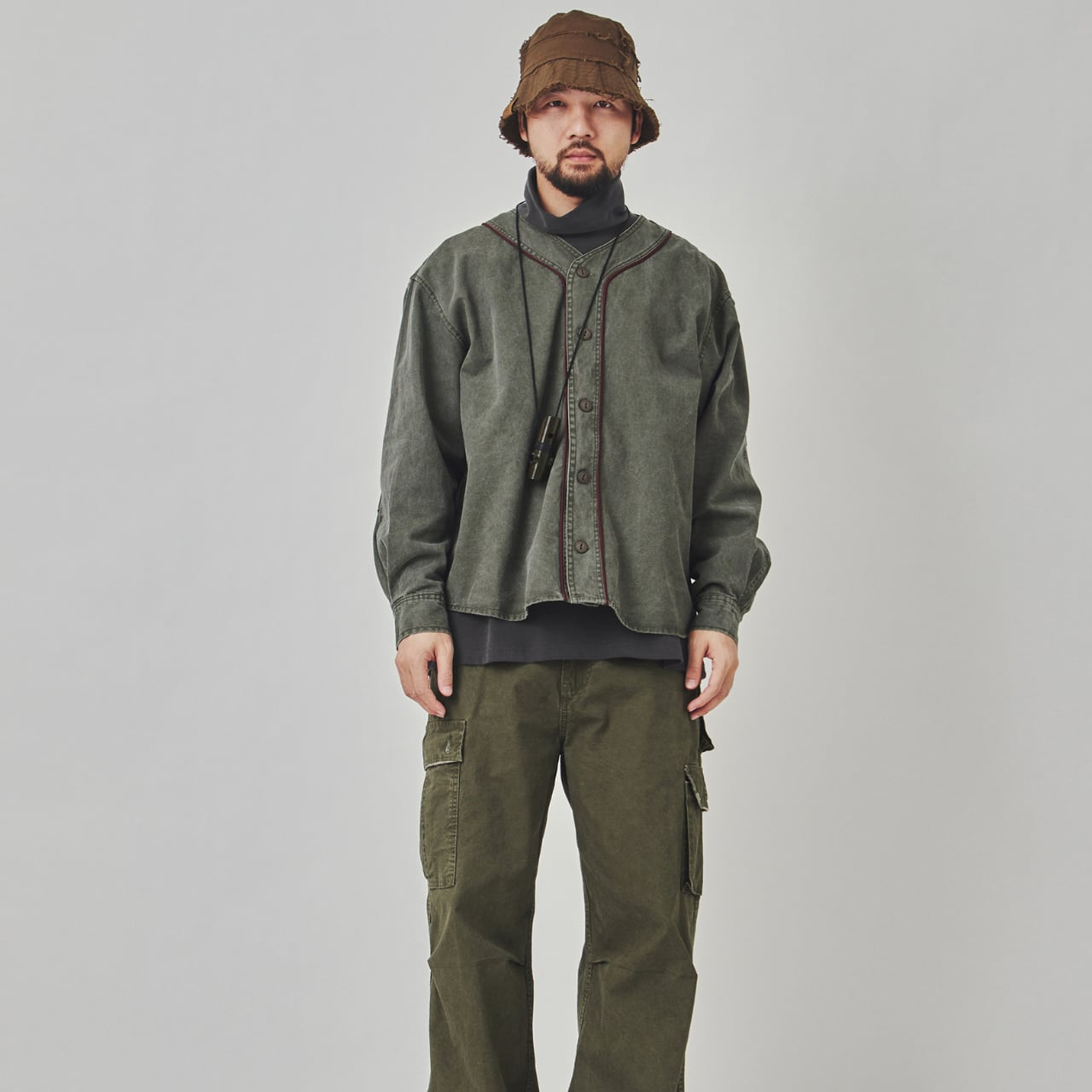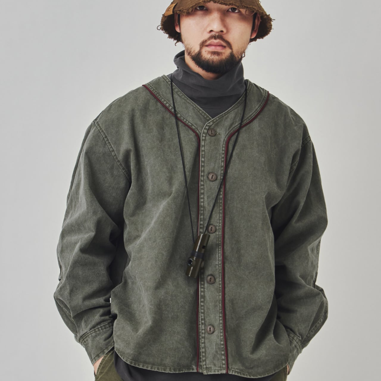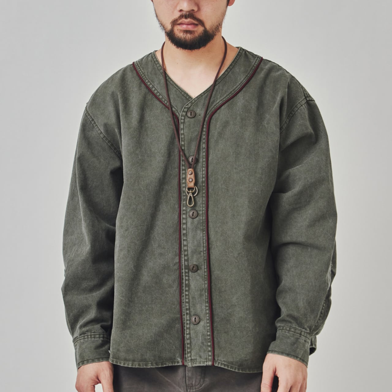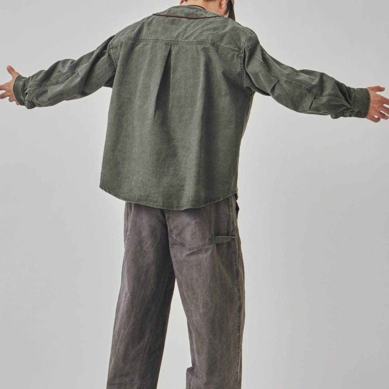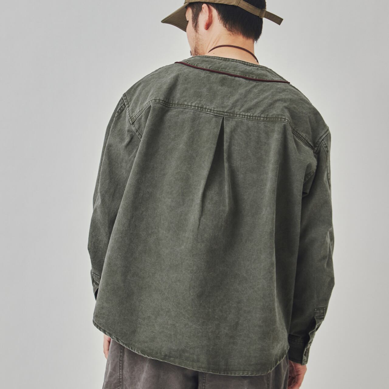 ウォッシュ加工のかかった柔らかいコットン素材に、絶妙な配色のパイピングが映える1枚。ゆったりとしたシルエットとフロントボタンのバランスが絶妙で、ヴィンテージワークやミリタリースタイルにぴったり。襟なしのVネック仕様で、インナーとのレイヤードも楽しめる万能シャツジャケットです。落ち着いた色展開で、ユニセックスでも着用可能なアイテム。