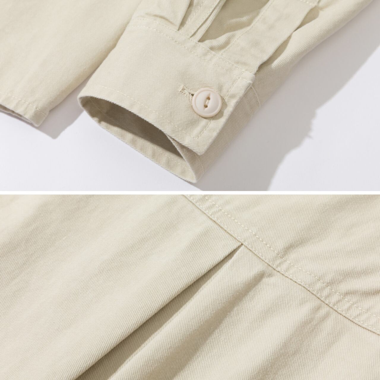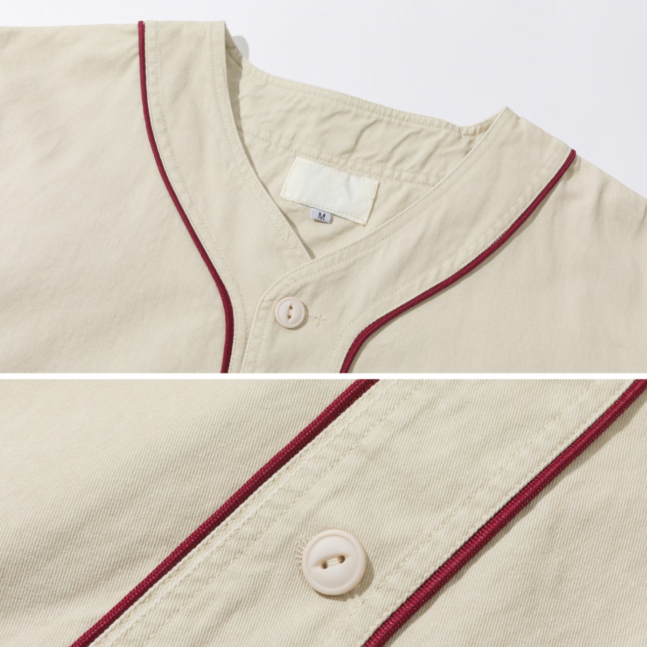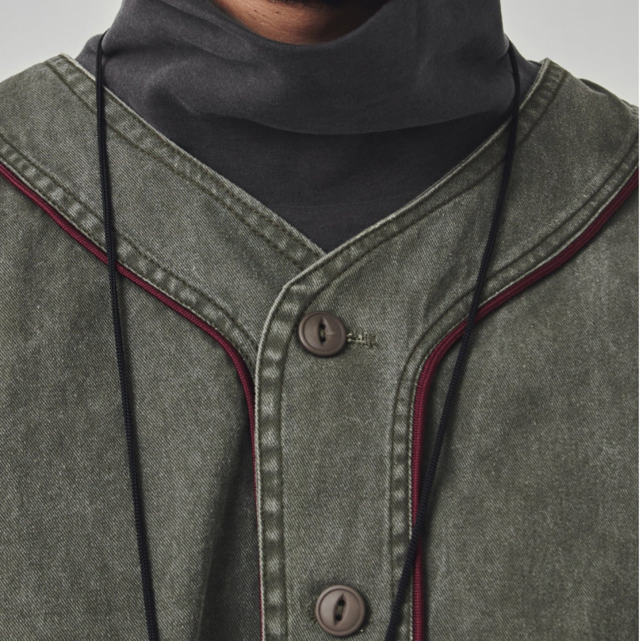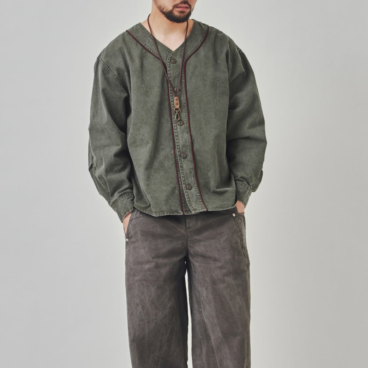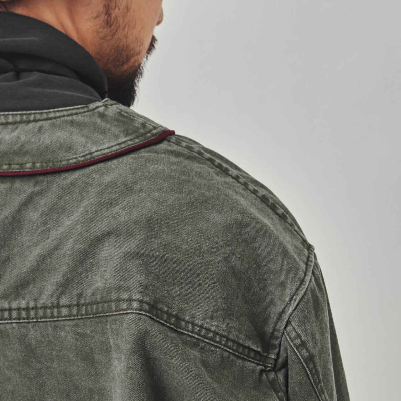 ウォッシュ加工のかかった柔らかいコットン素材に、絶妙な配色のパイピングが映える1枚。ゆったりとしたシルエットとフロントボタンのバランスが絶妙で、ヴィンテージワークやミリタリースタイルにぴったり。襟なしのVネック仕様で、インナーとのレイヤードも楽しめる万能シャツジャケットです。落ち着いた色展開で、ユニセックスでも着用可能なアイテム。