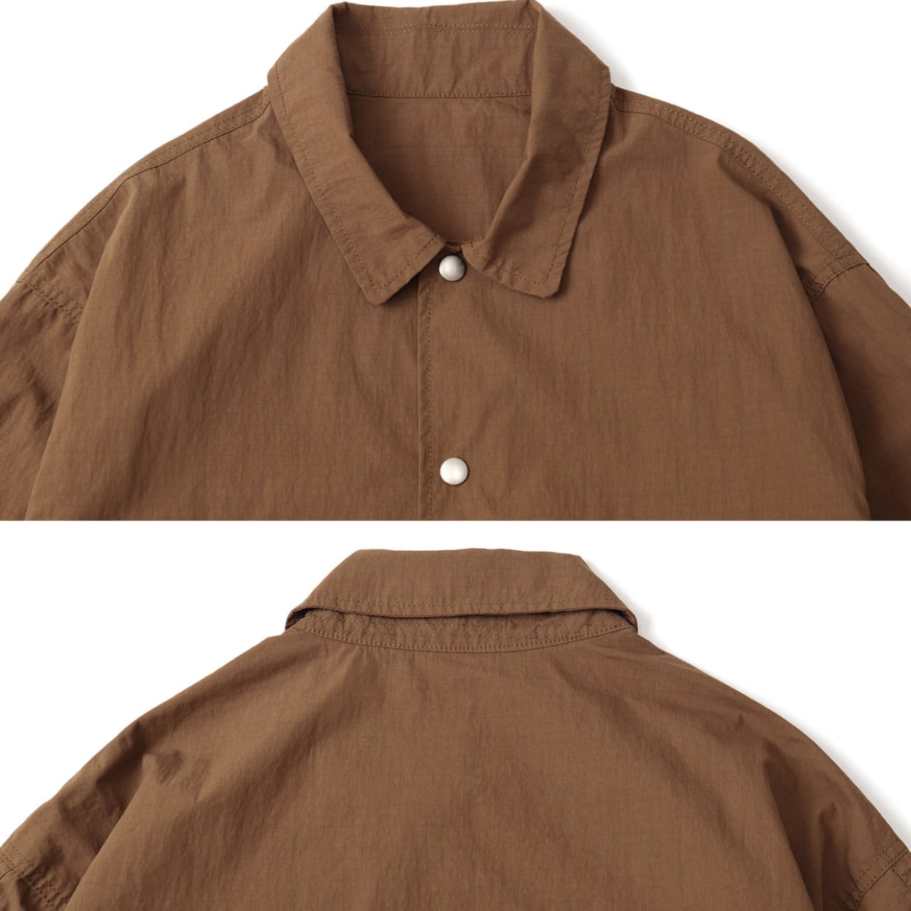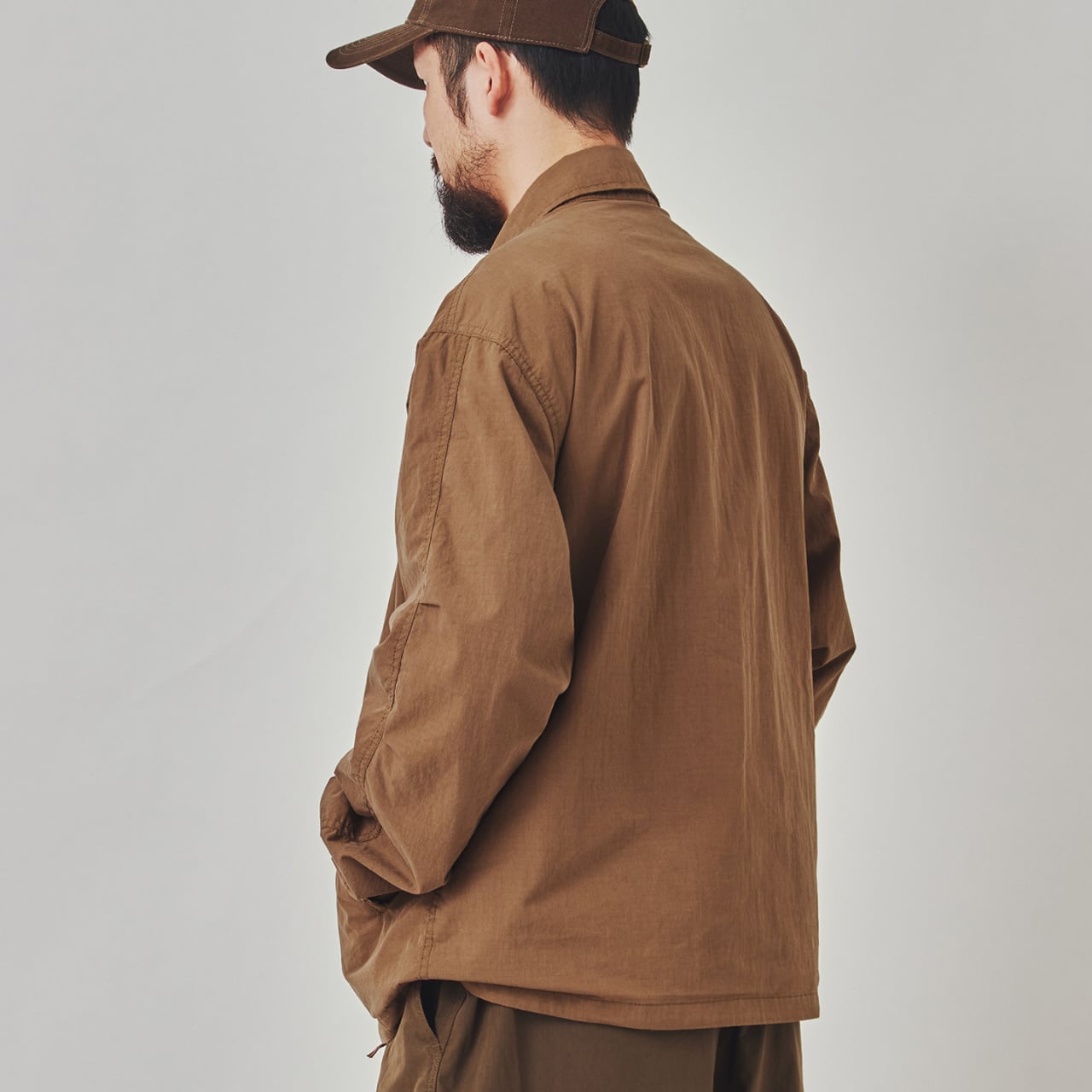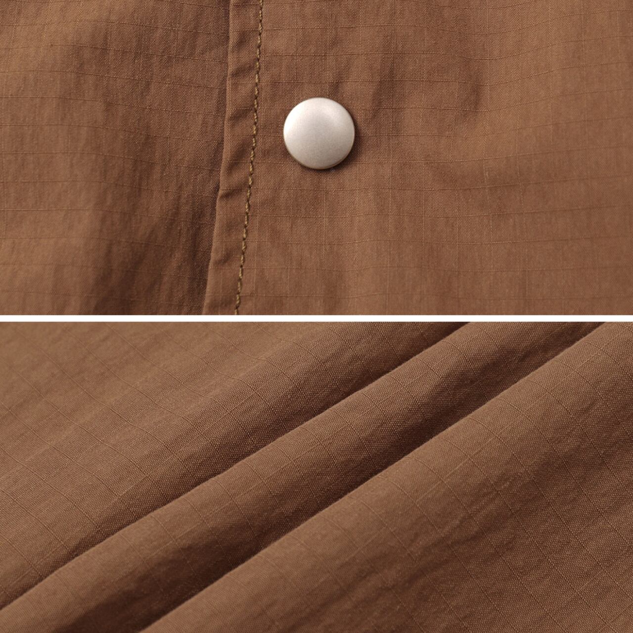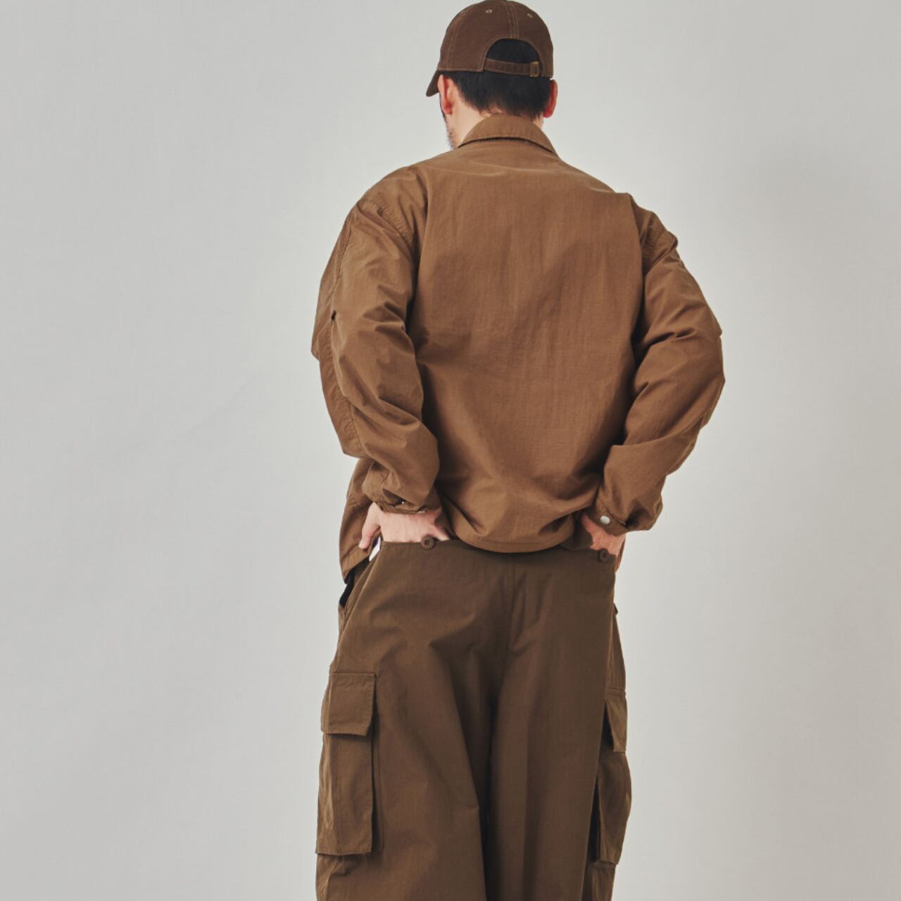 ハリのあるリップストップ生地を使用し、ワークとアウトドアの機能性を掛け合わせたシャツジャケット。胸元のステッチや大きめのポケット、裾のドローコード、スナップボタンなど、細部に実用的ディテールが満載。ワイドカーゴパンツとのセットアップ風コーデもおすすめ。ラフに羽織れて気取らない、街とフィールドをつなぐ1枚です。