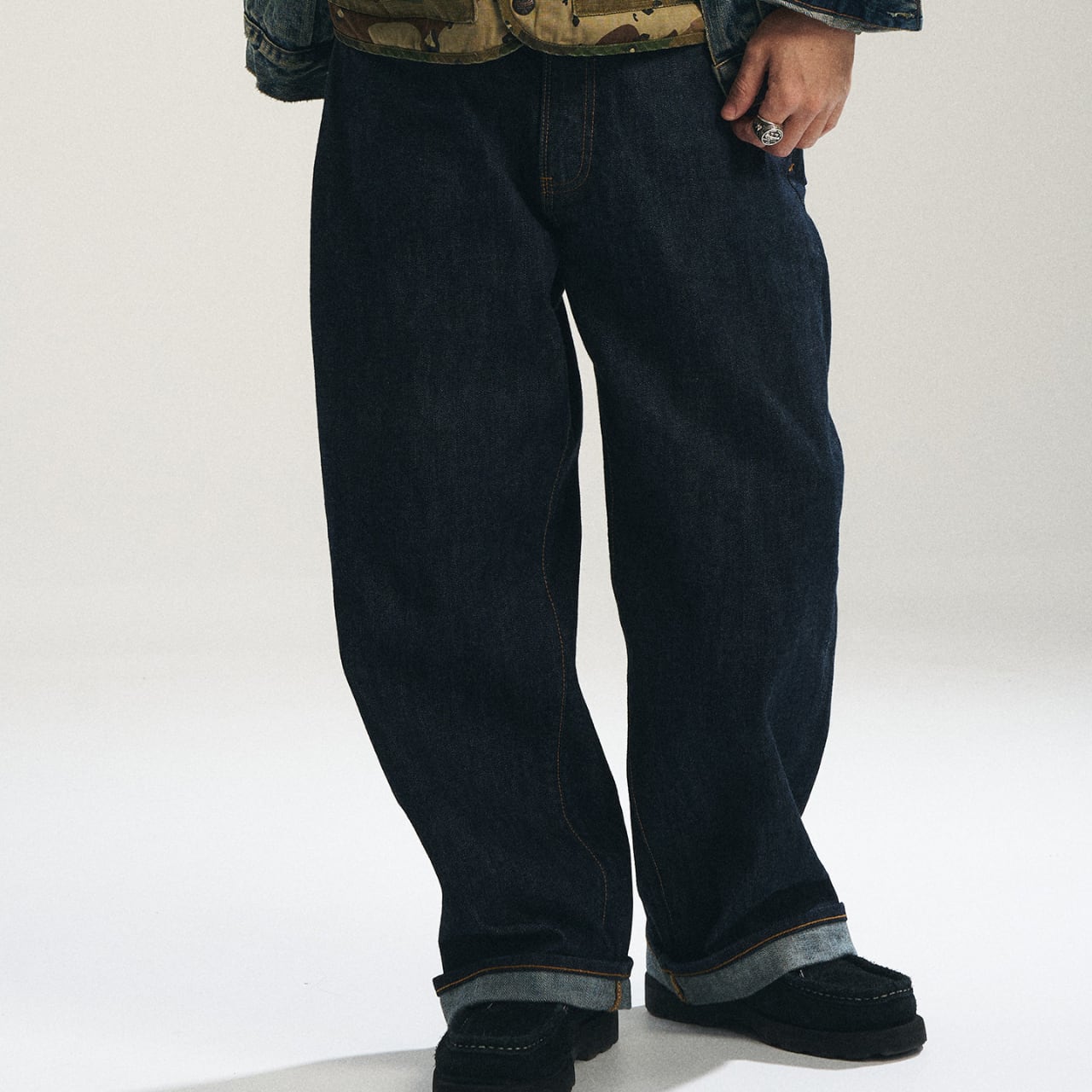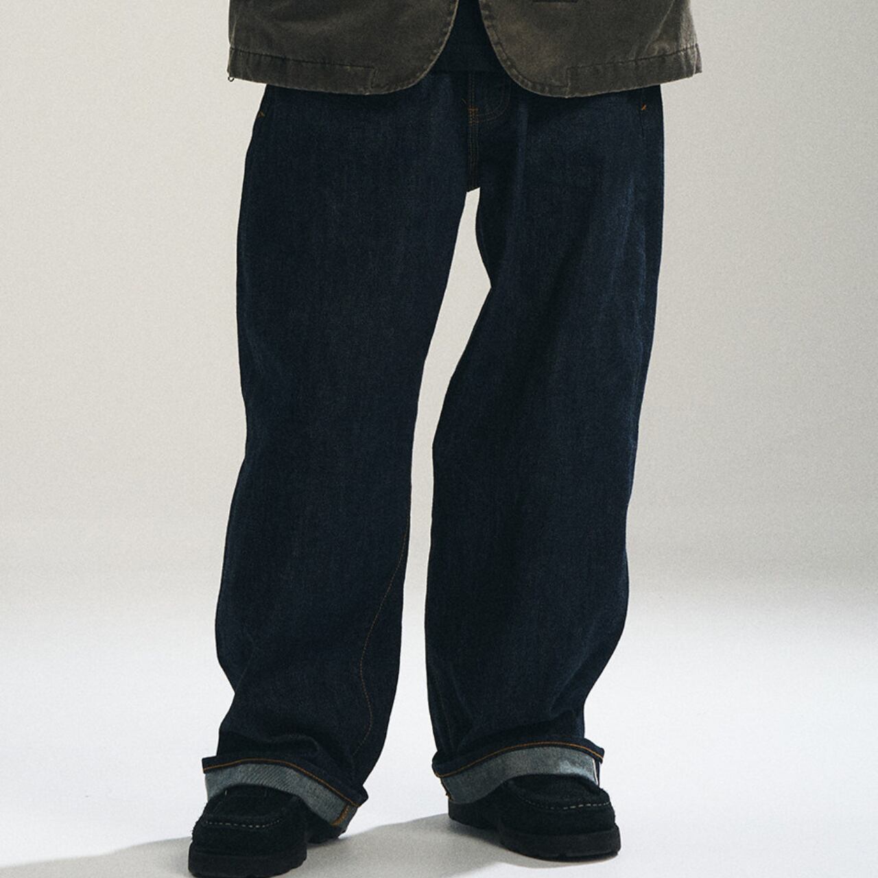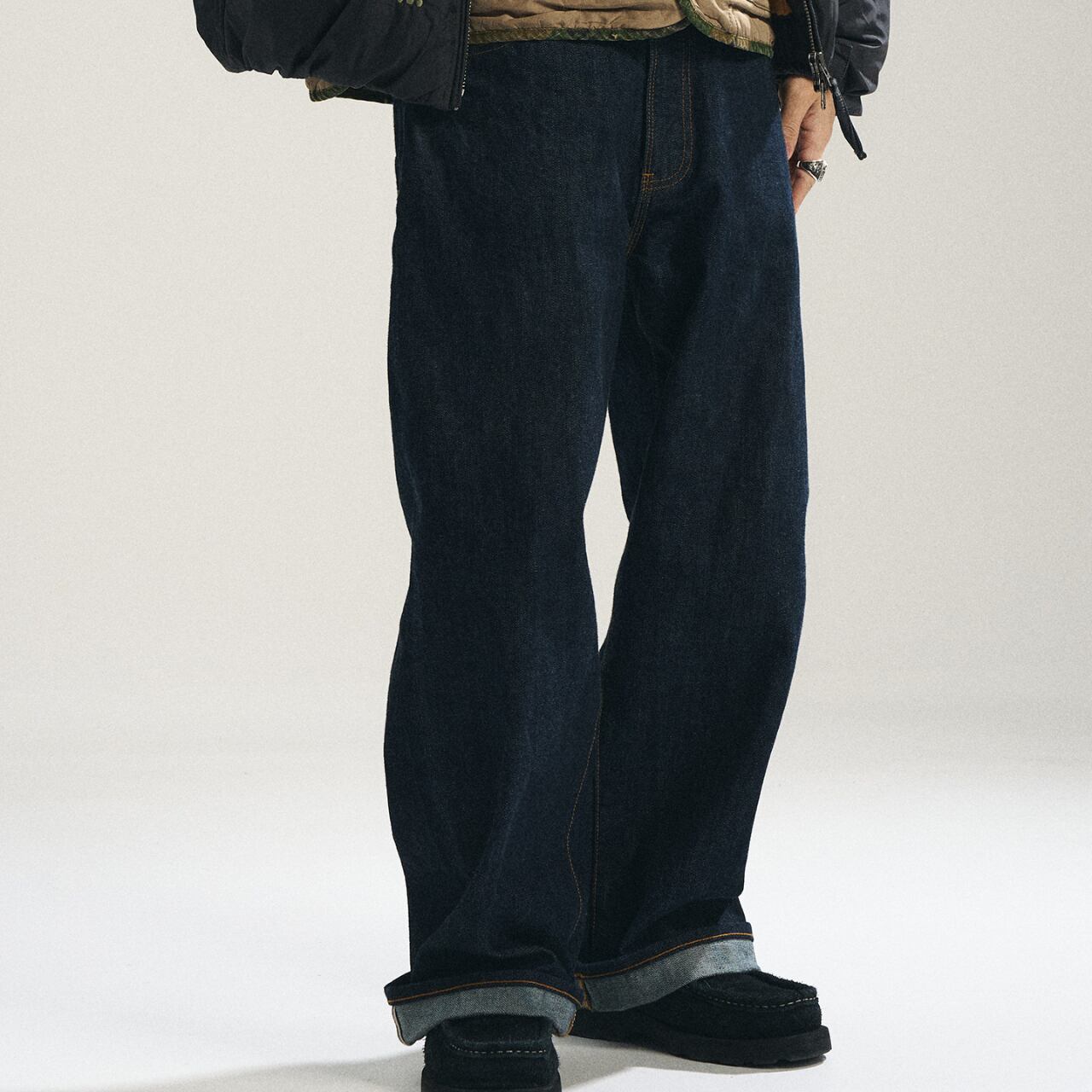 14.2ozの本格セルヴィッジデニムを使用した、クラシックな佇まいのワイドストレートジーンズ。