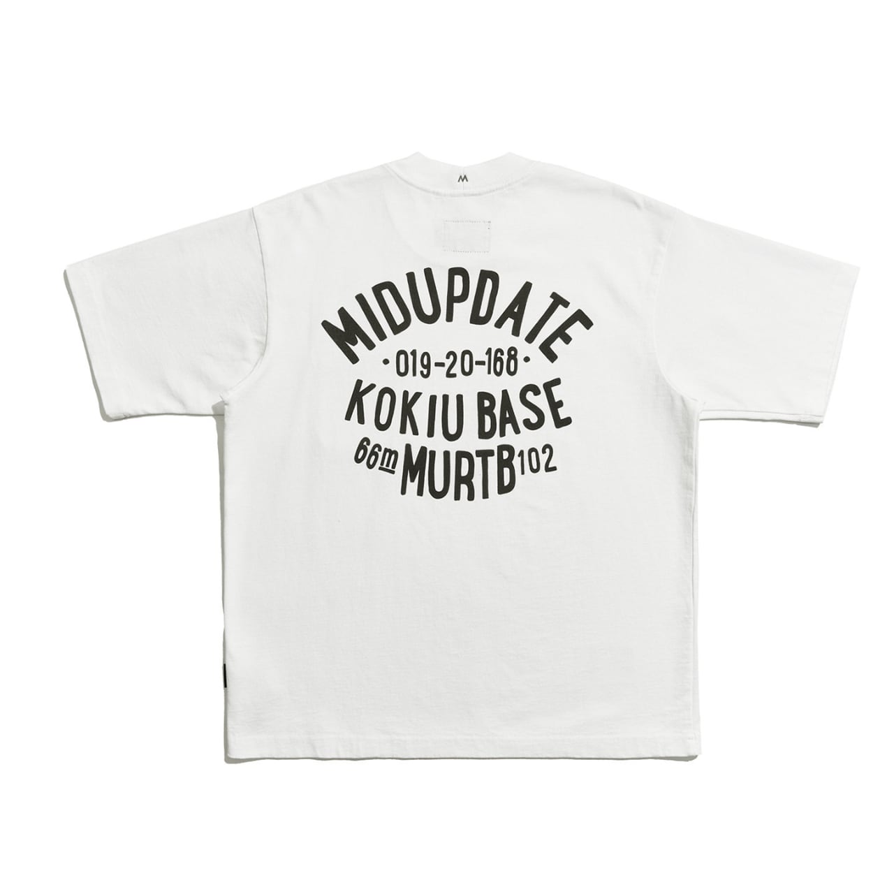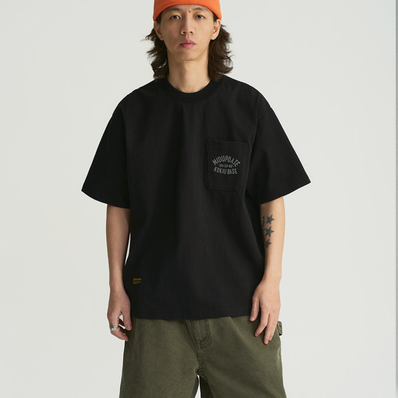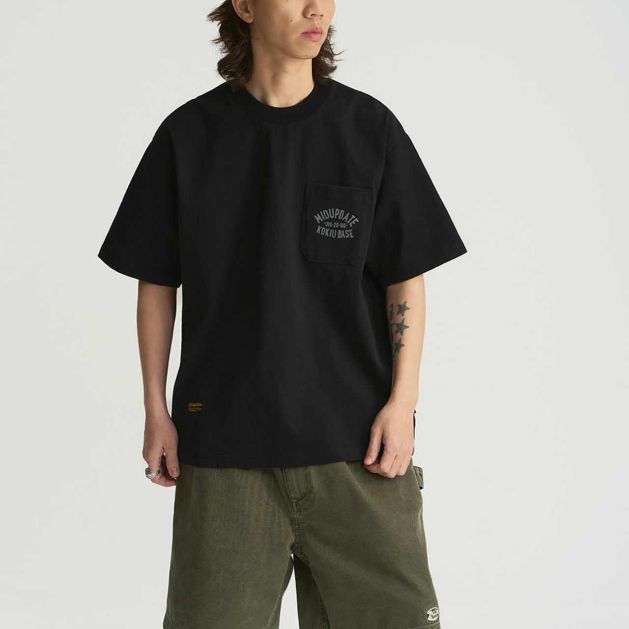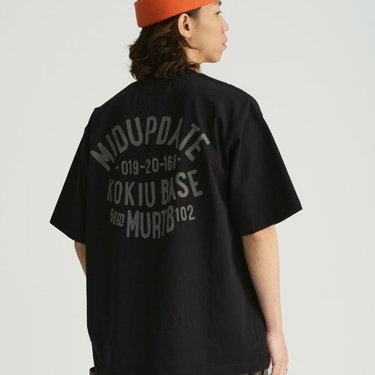 背面のアーチ状グラフィックがミリタリーテイストを演出し、フロントは胸ポケット付きのシンプルデザイン。