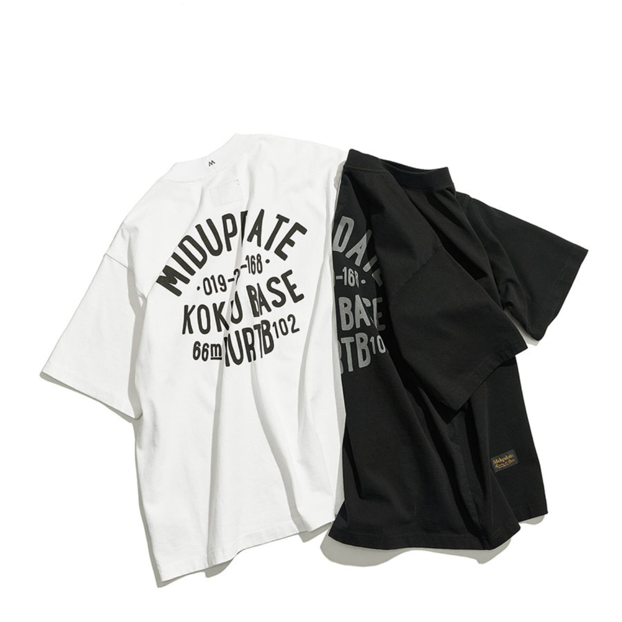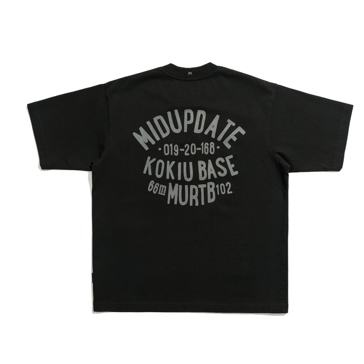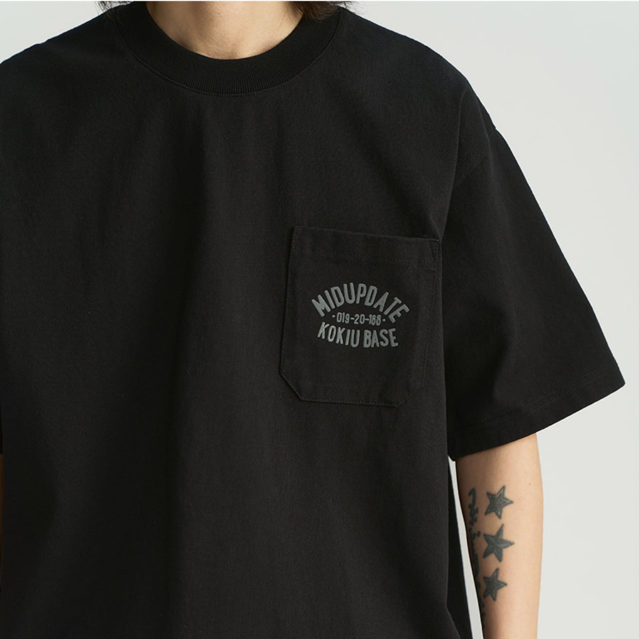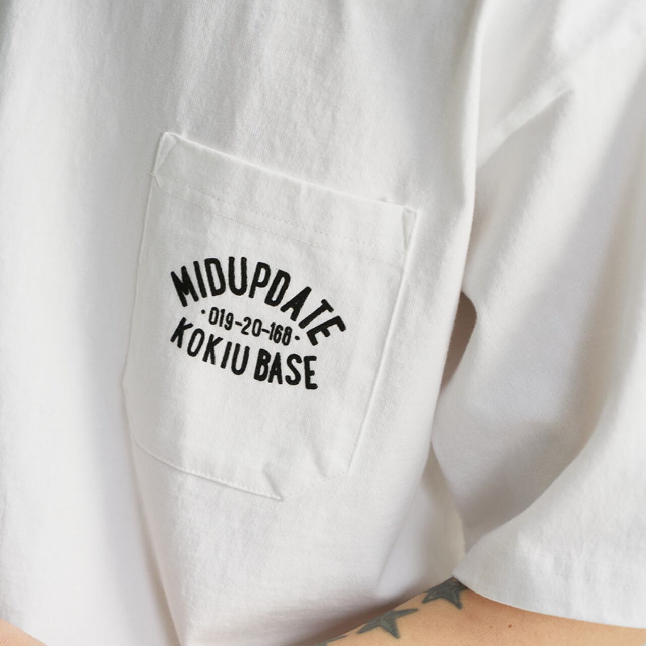 背面のアーチ状グラフィックがミリタリーテイストを演出し、フロントは胸ポケット付きのシンプルデザイン。