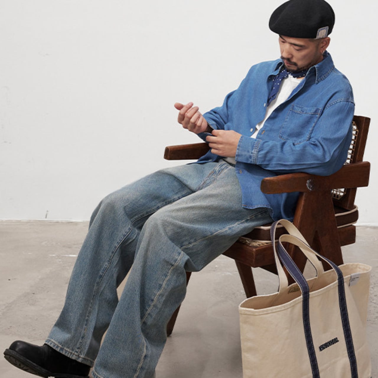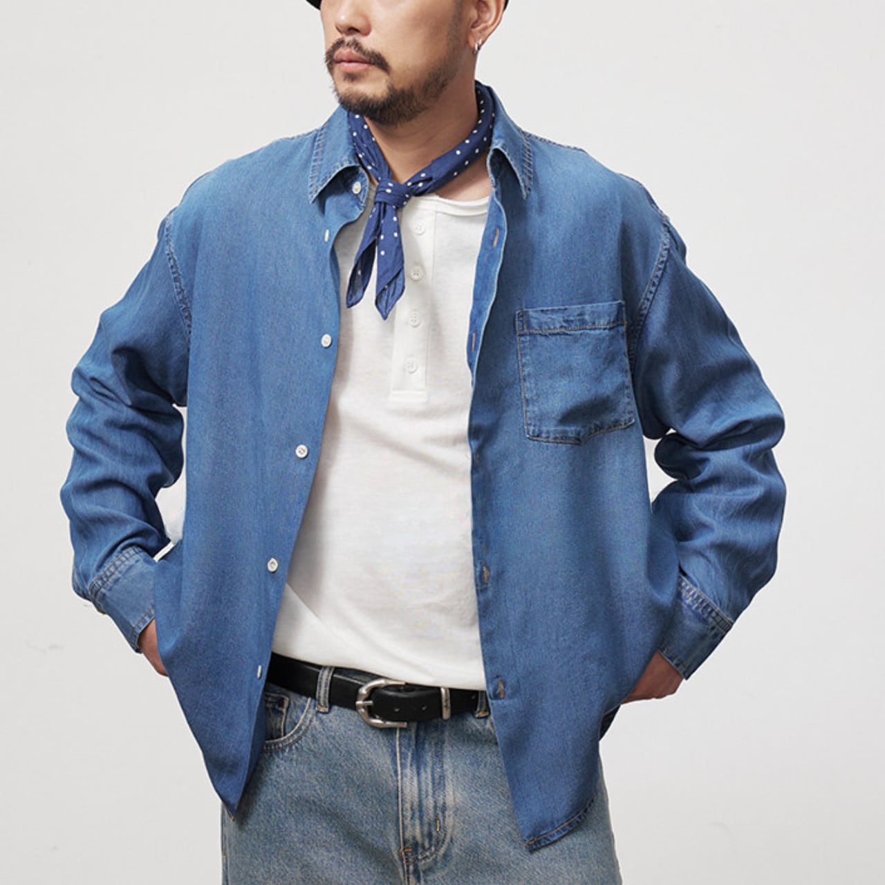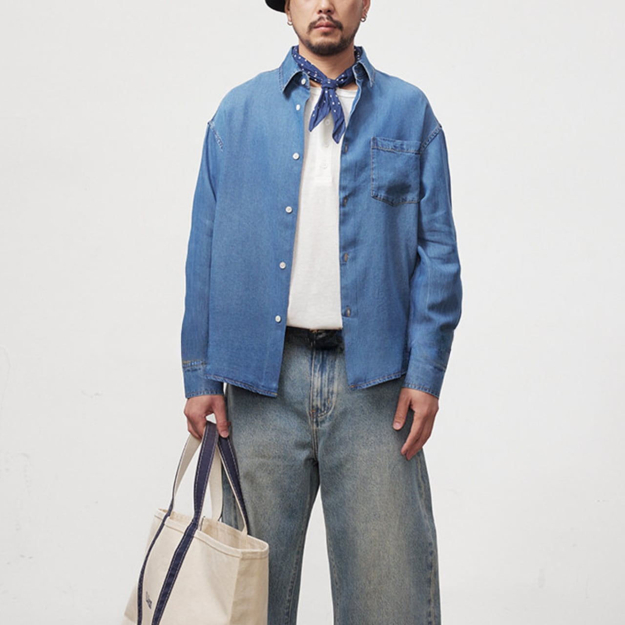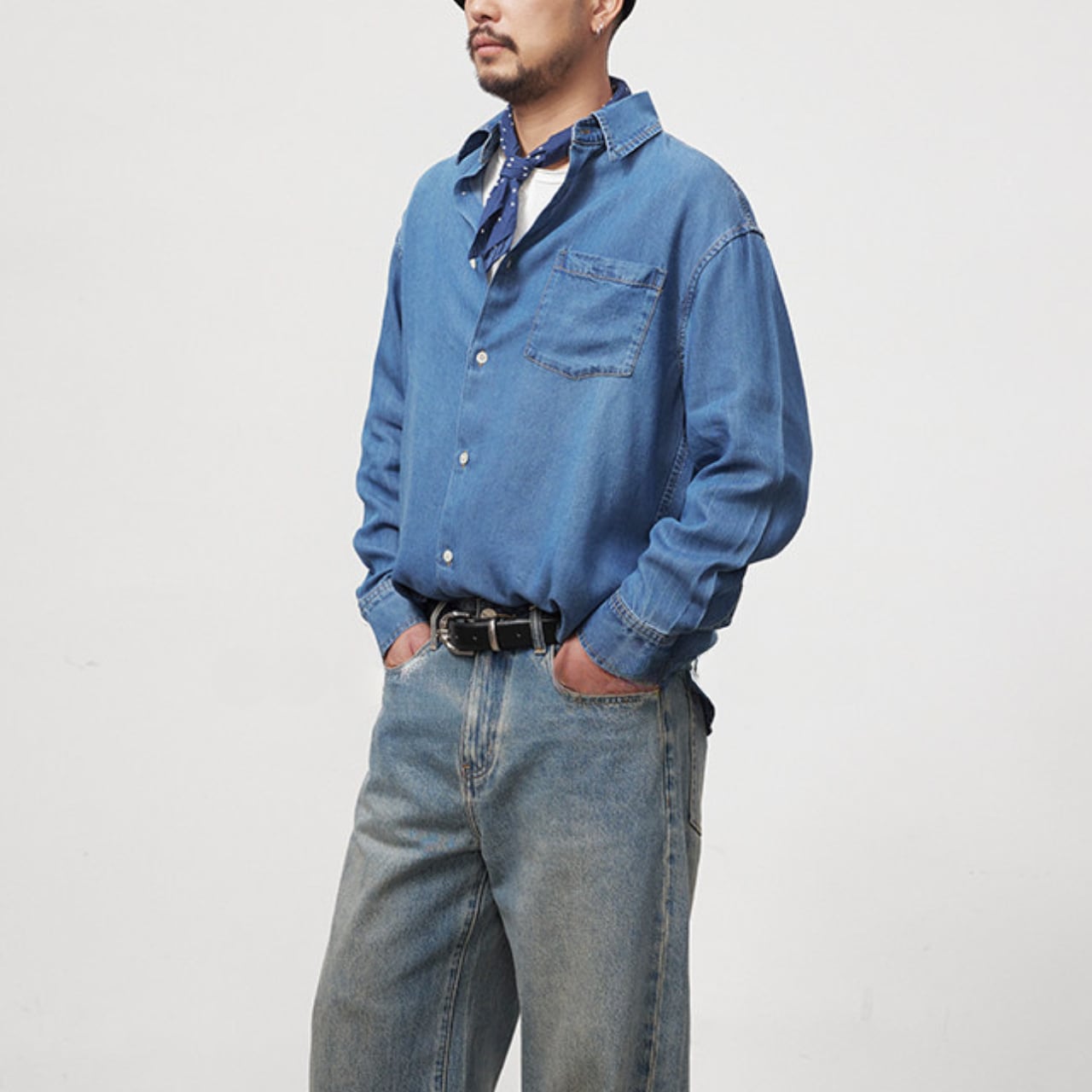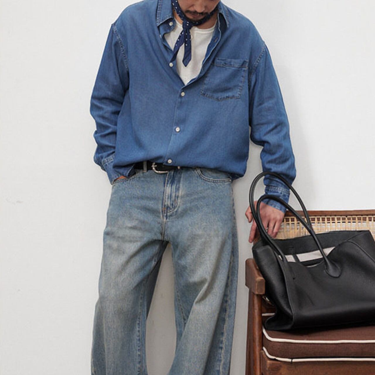 #gate #cityboyootd #デニムシャツ #フェード加工 #リラックスシルエット #古着ミックス #大人カジュアル #バンダナコーデ #ワイドパンツコーデ #camp