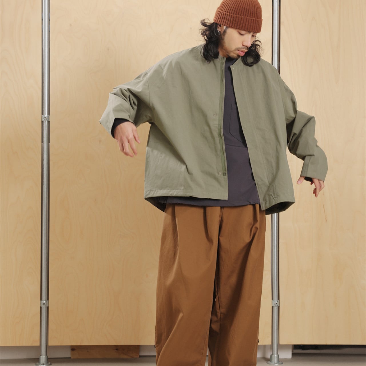 裾のドローコードでシルエット調整ができ、ワイドパンツとも好相性。