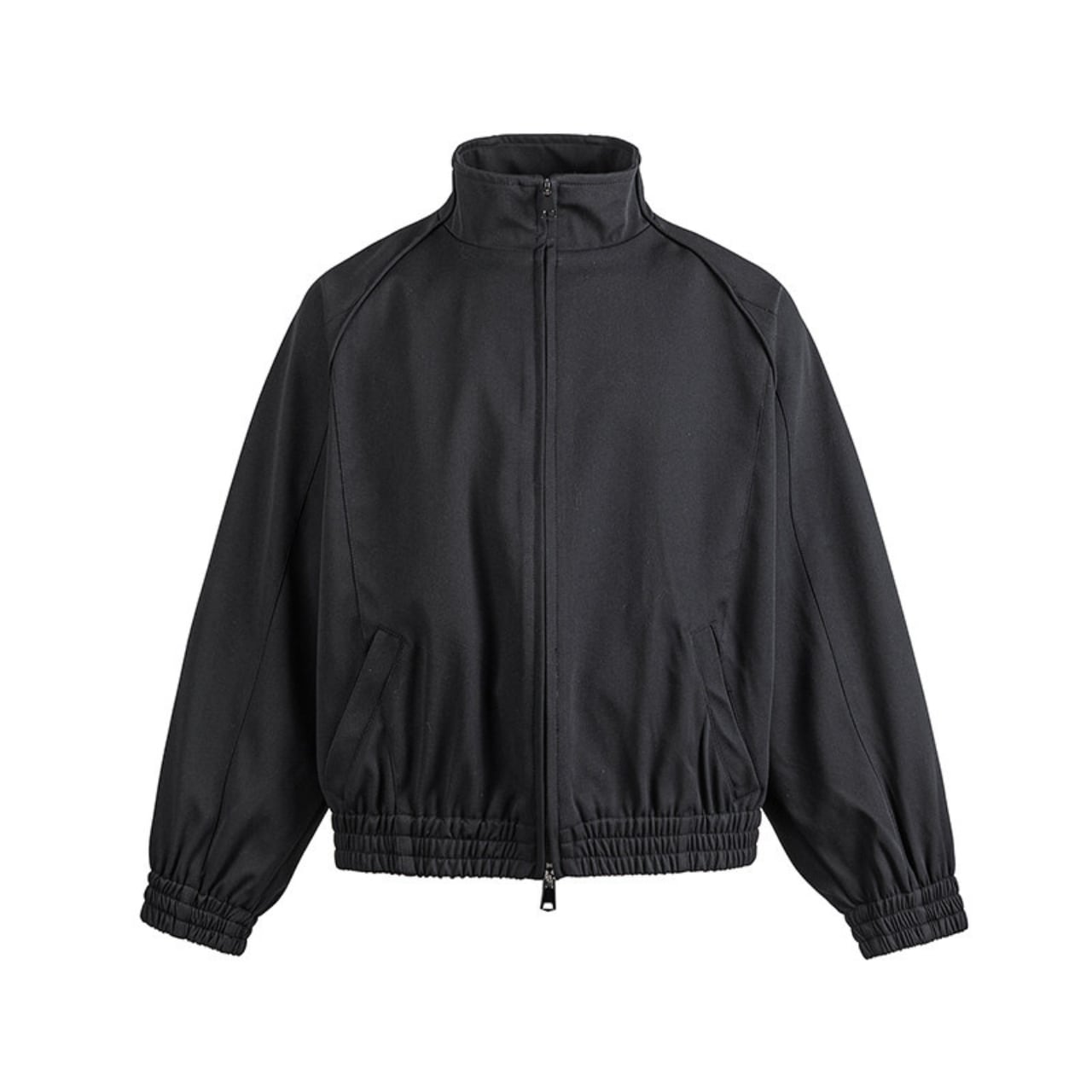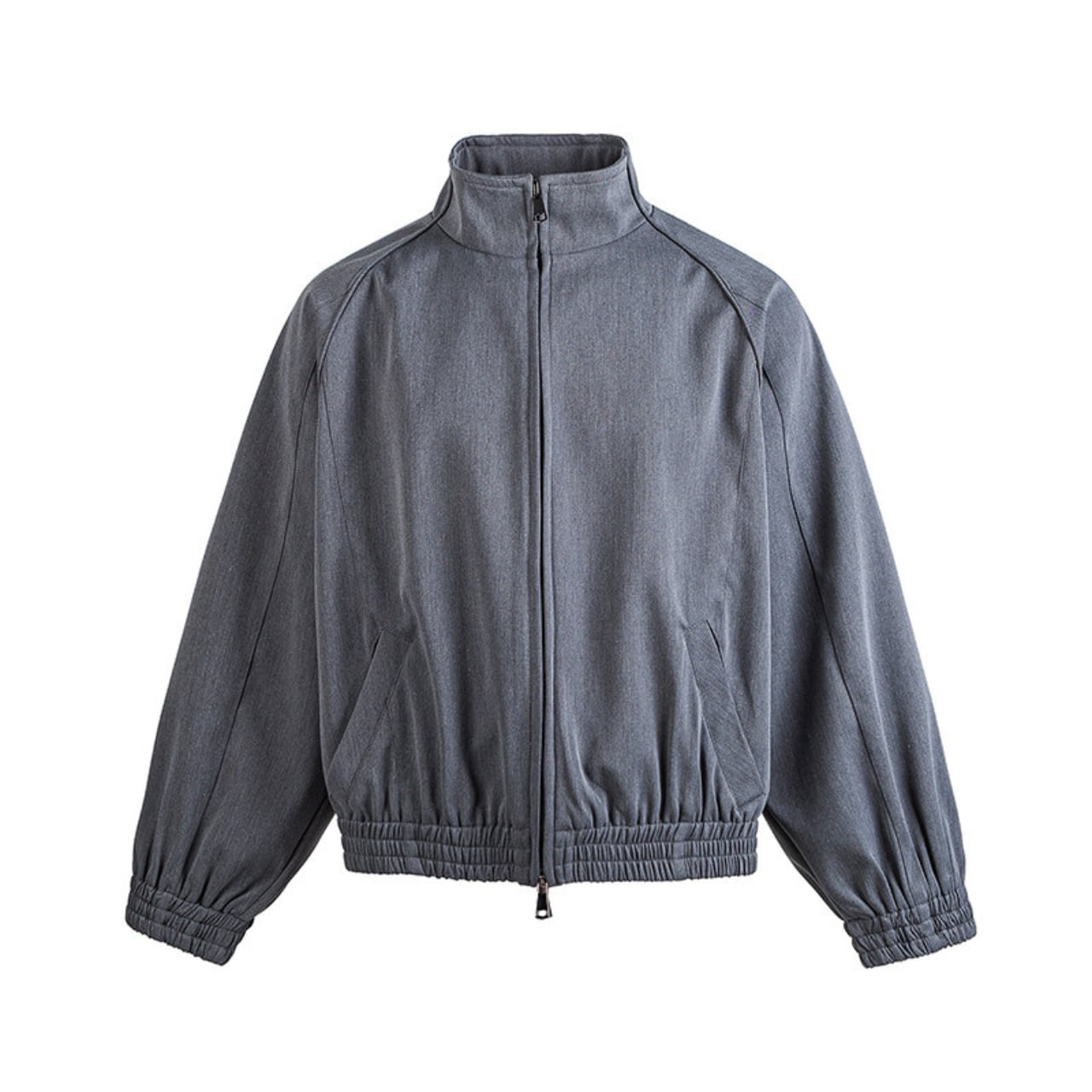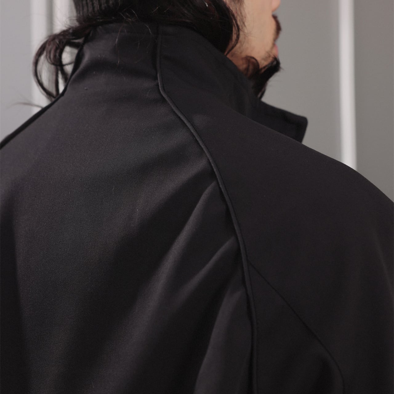 立ち上がりのあるスタンドカラーとダブルジップ仕様が、都会的な緊張感を生み出します。