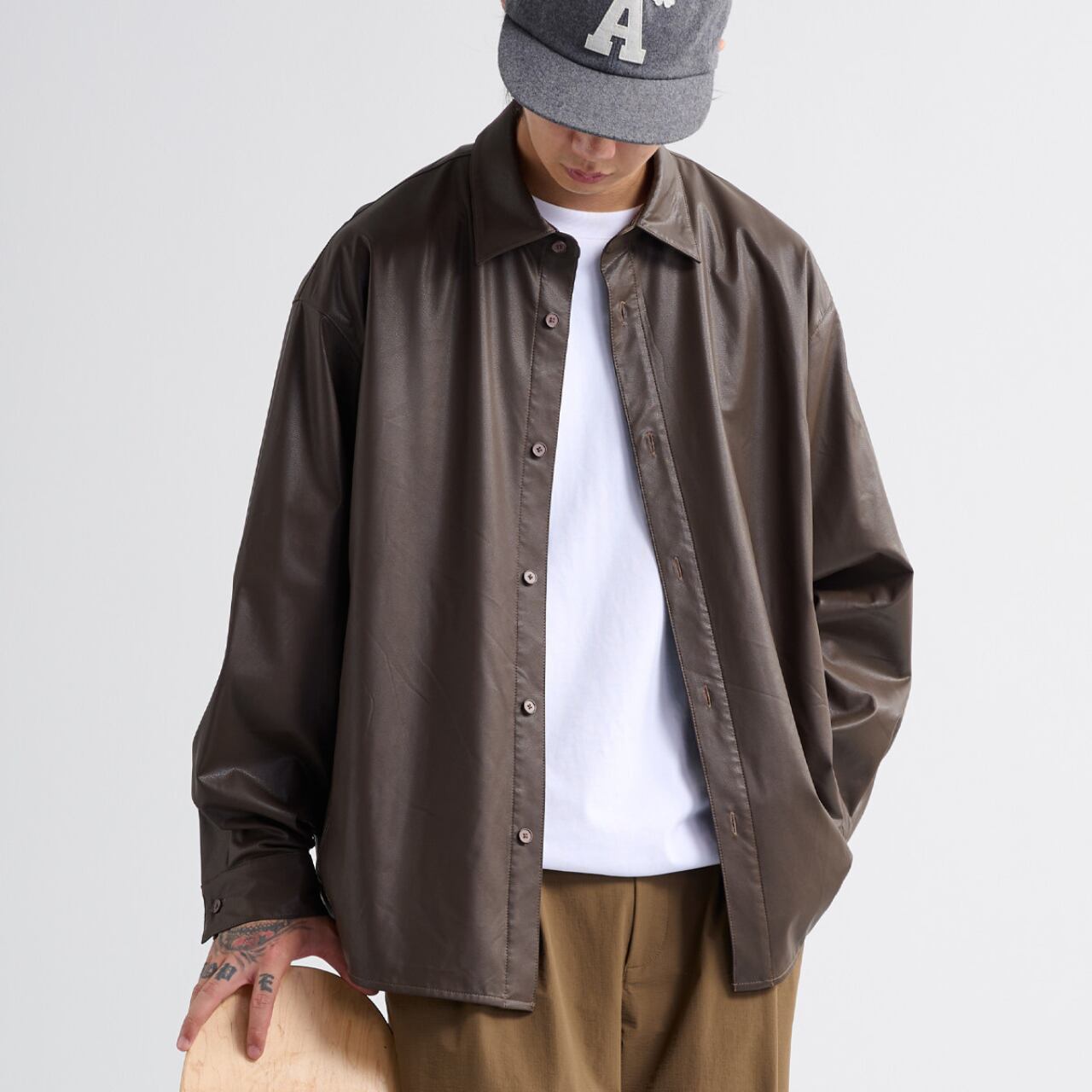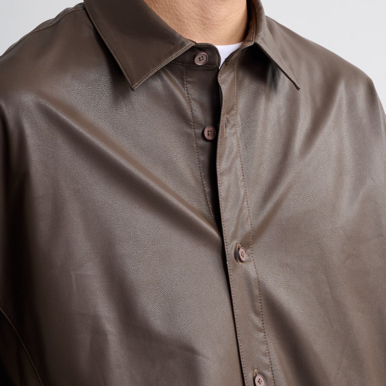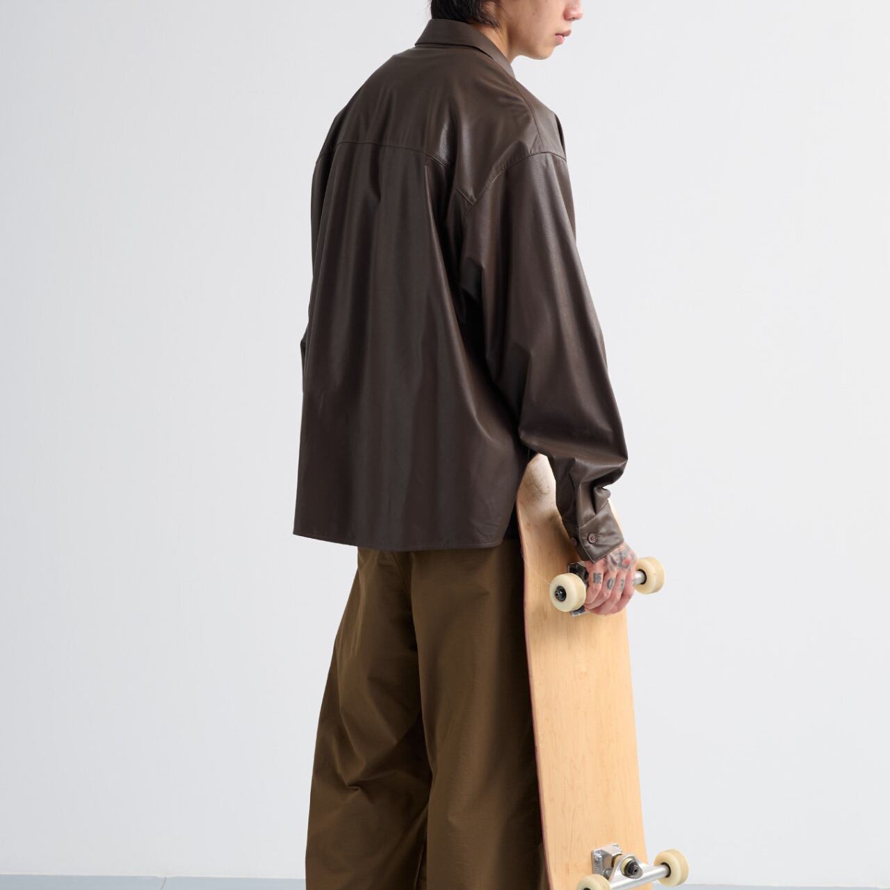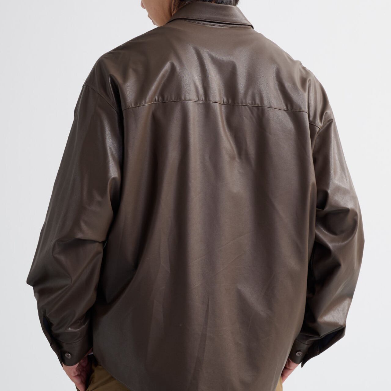 0.4mmのソフトPUレザーを使用した、軽さと存在感を両立するルーズシャツ。