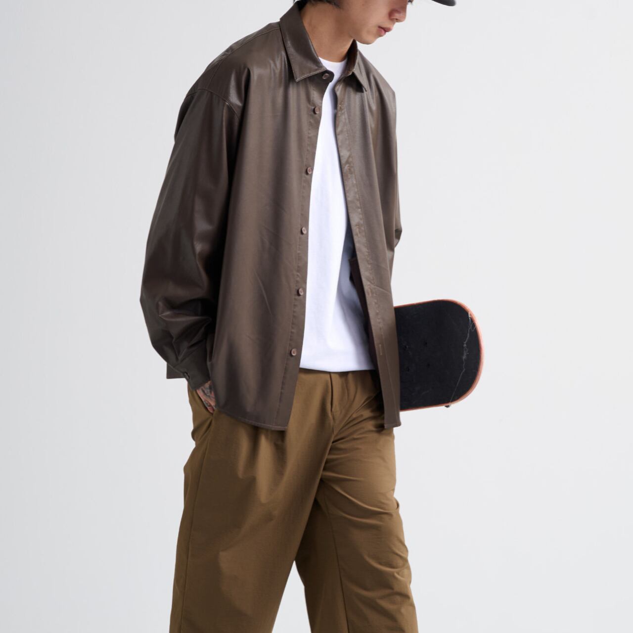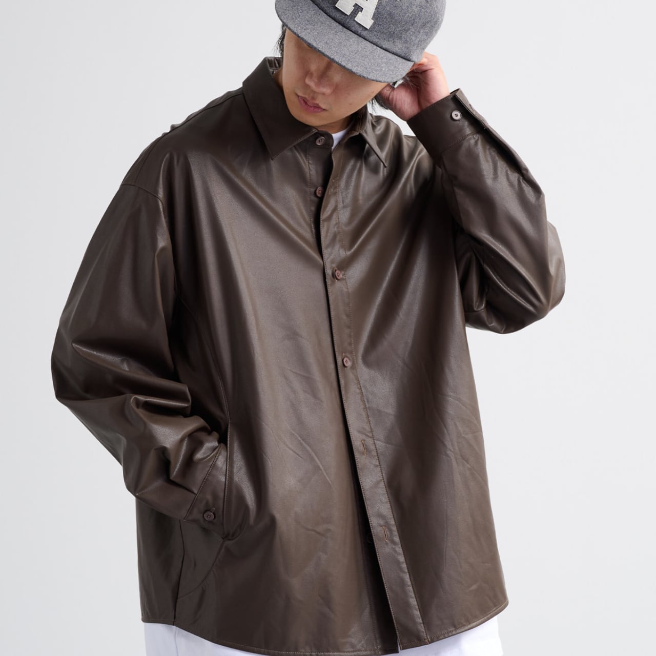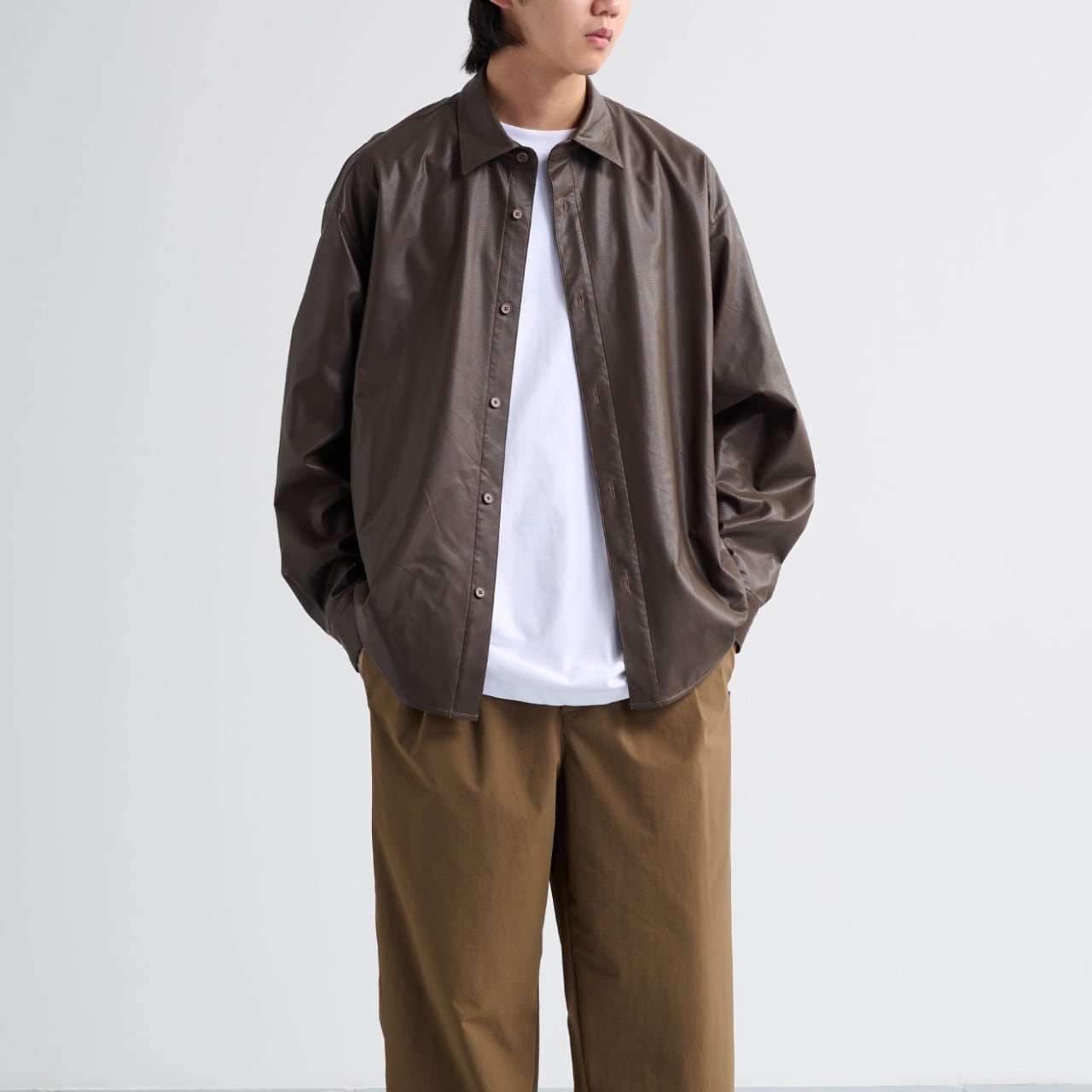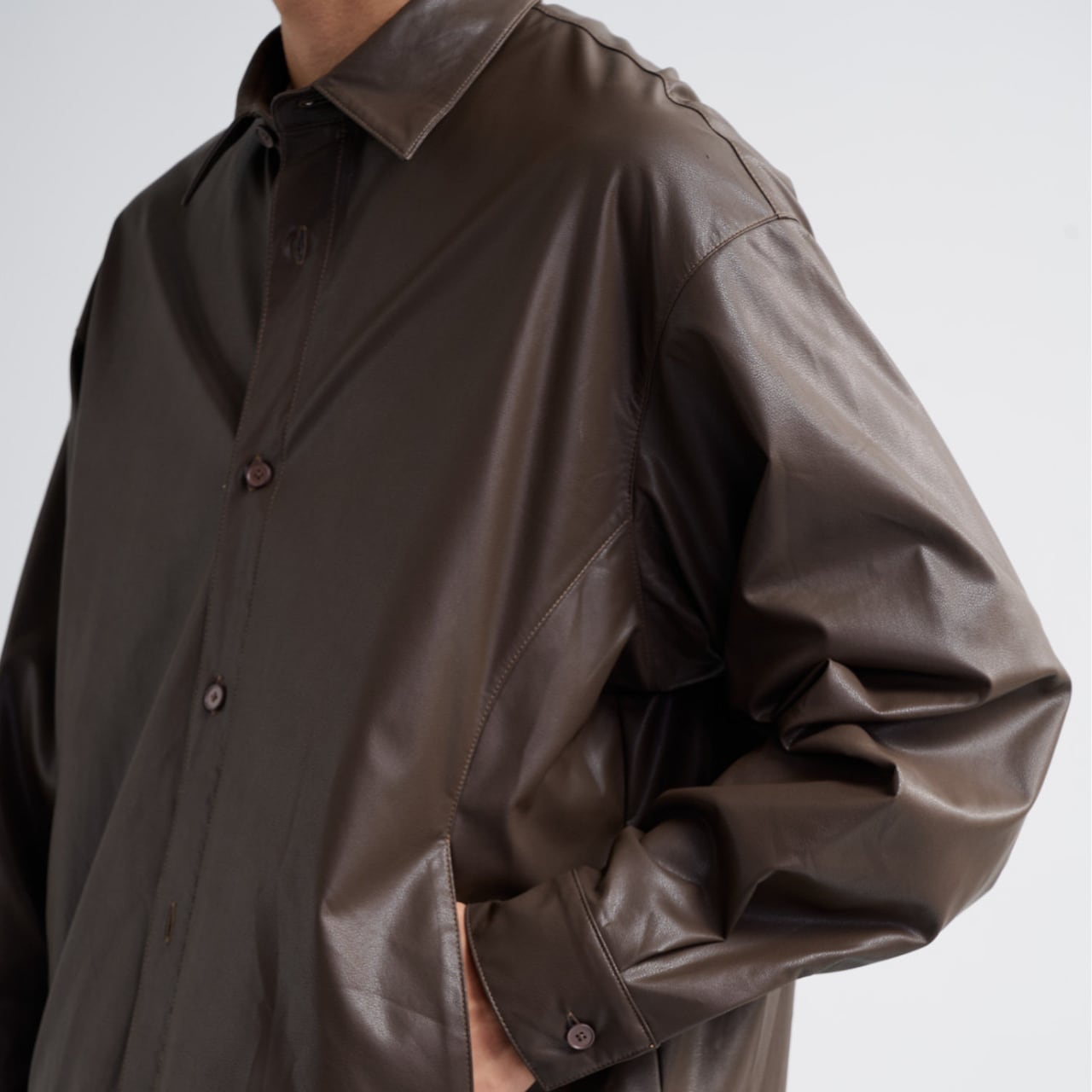 0.4mmのソフトPUレザーを使用した、軽さと存在感を両立するルーズシャツ。
