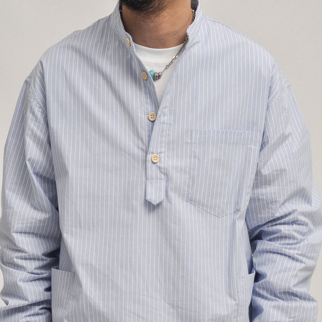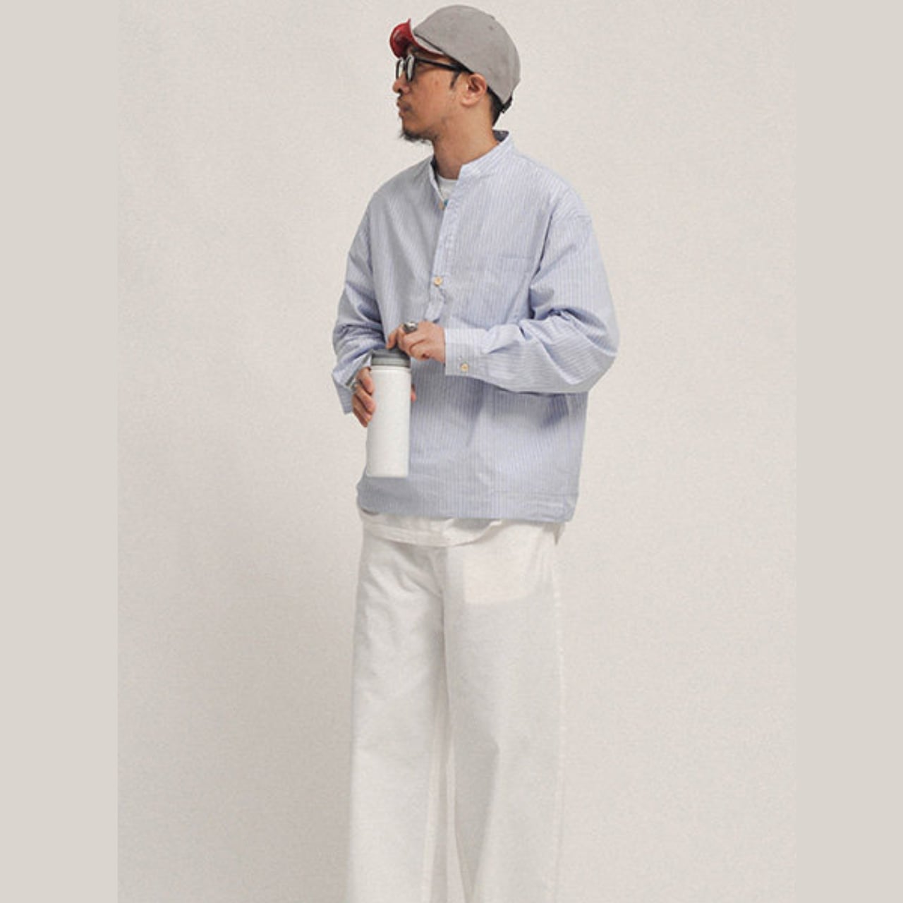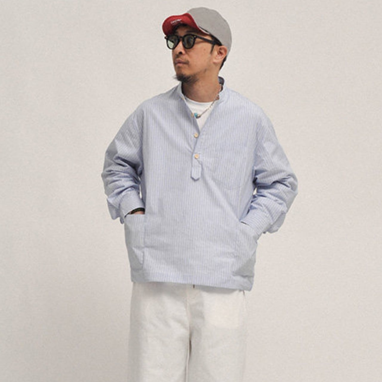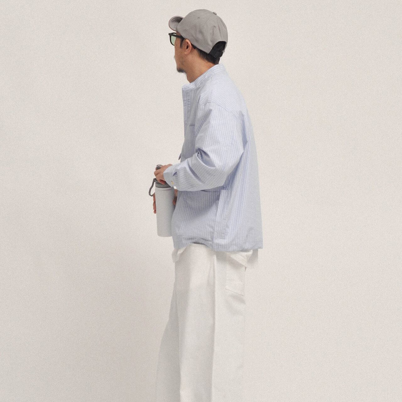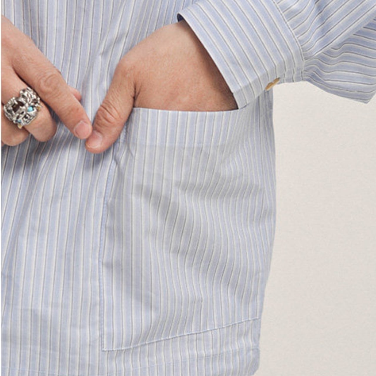 シンプルでありながら洗練された印象を与えるエアリーストライプコットンオーバーシャツ。コットン100%で、肌触りが良く、通気性も抜群。ライトブルーのストライプ柄が爽やかで、カジュアルにもフォーマルにも使える一枚です。オーバーサイズシルエットなので、リラックス感がありながらもスタイリッシュに着こなせます。春から夏にかけての必需品として、ワードローブに加えたくなるアイテムです。