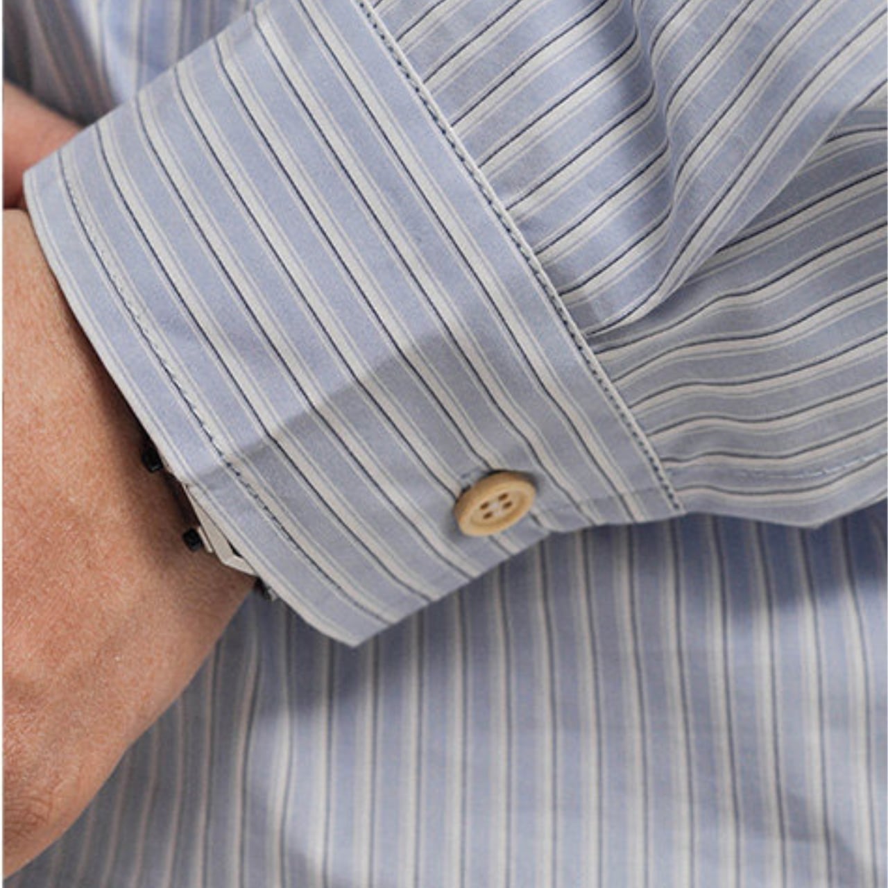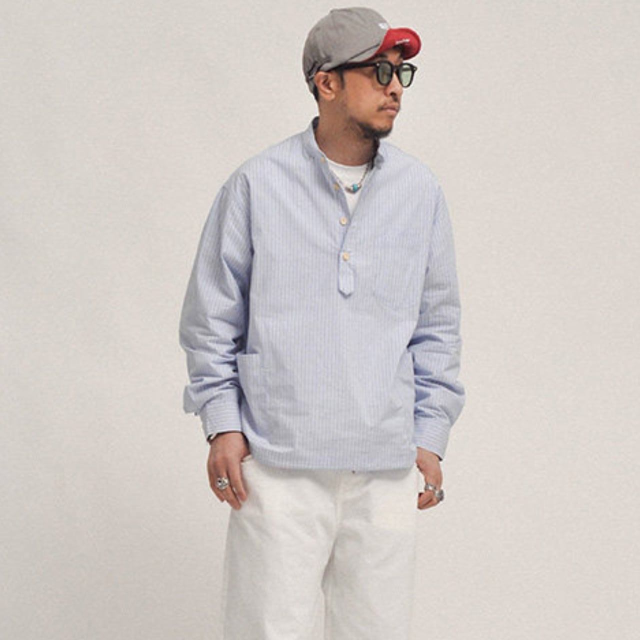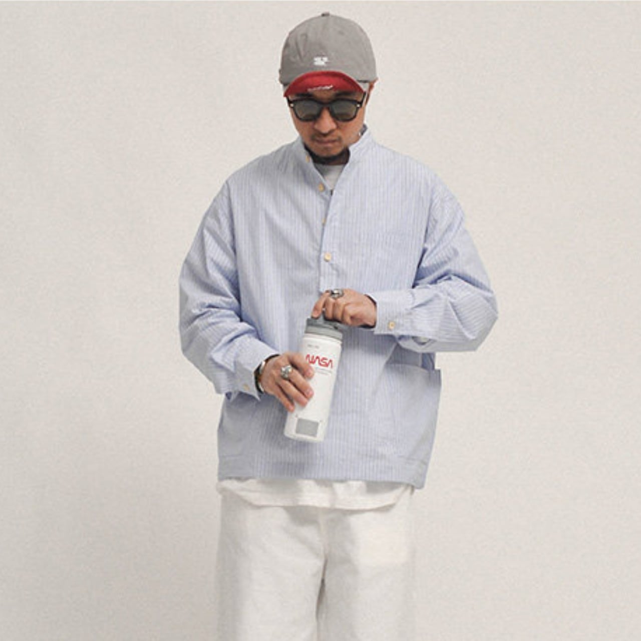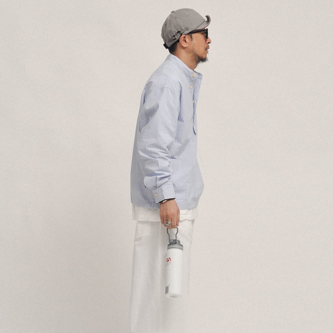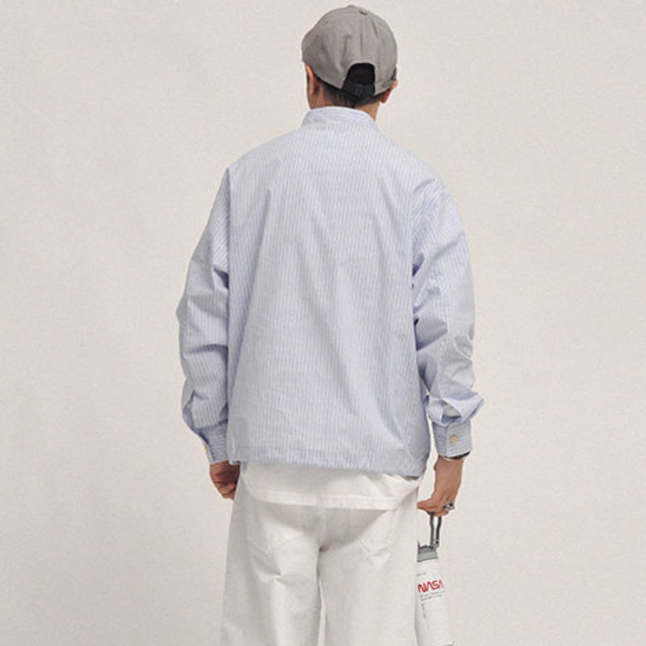 シンプルでありながら洗練された印象を与えるエアリーストライプコットンオーバーシャツ。コットン100%で、肌触りが良く、通気性も抜群。ライトブルーのストライプ柄が爽やかで、カジュアルにもフォーマルにも使える一枚です。オーバーサイズシルエットなので、リラックス感がありながらもスタイリッシュに着こなせます。春から夏にかけての必需品として、ワードローブに加えたくなるアイテムです。