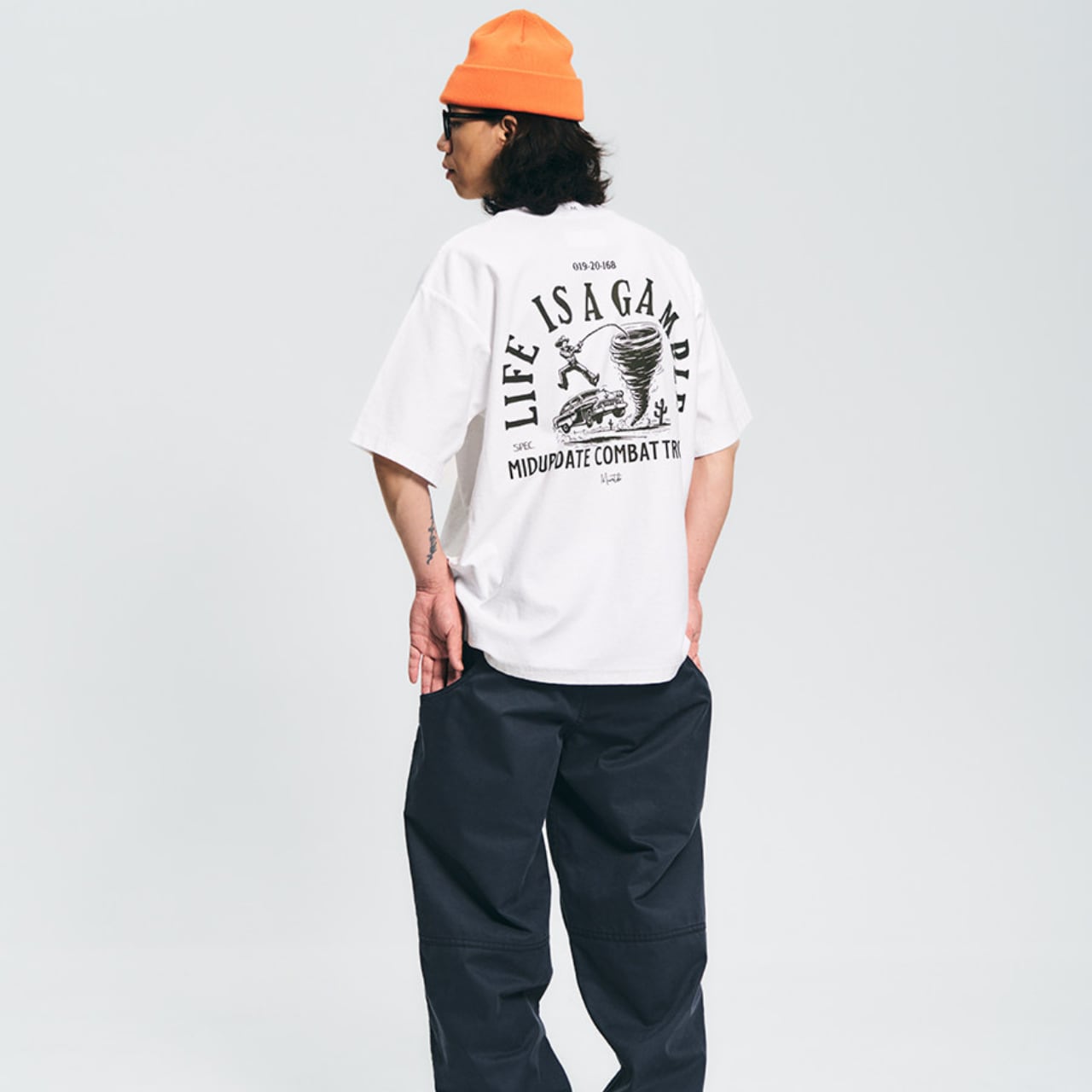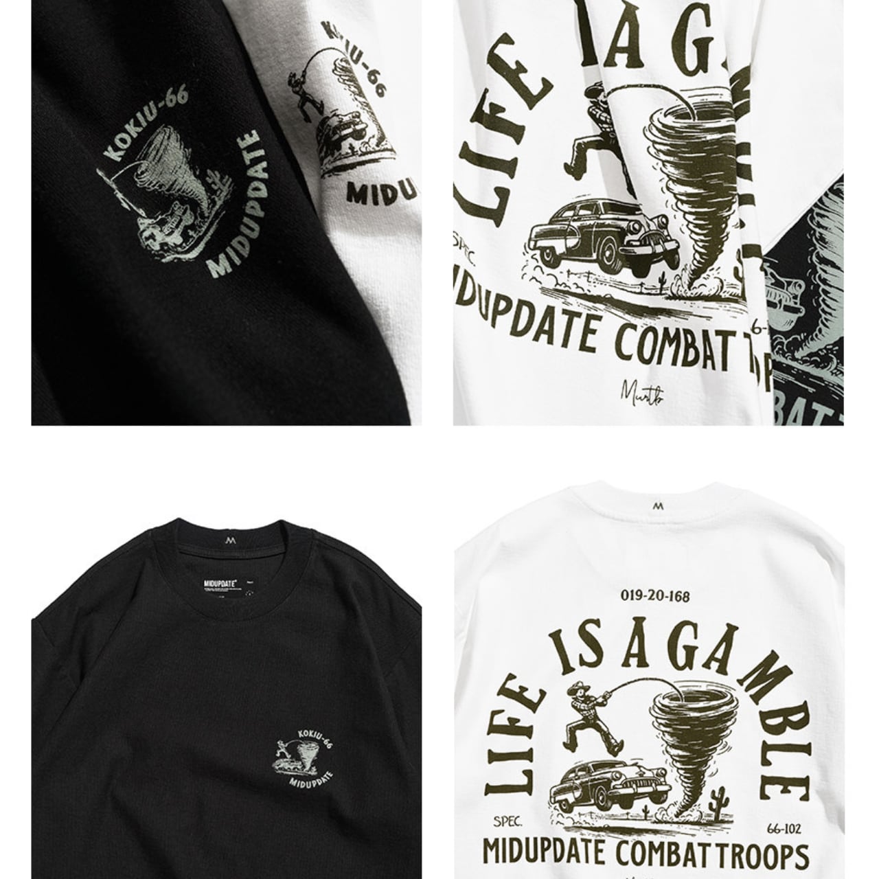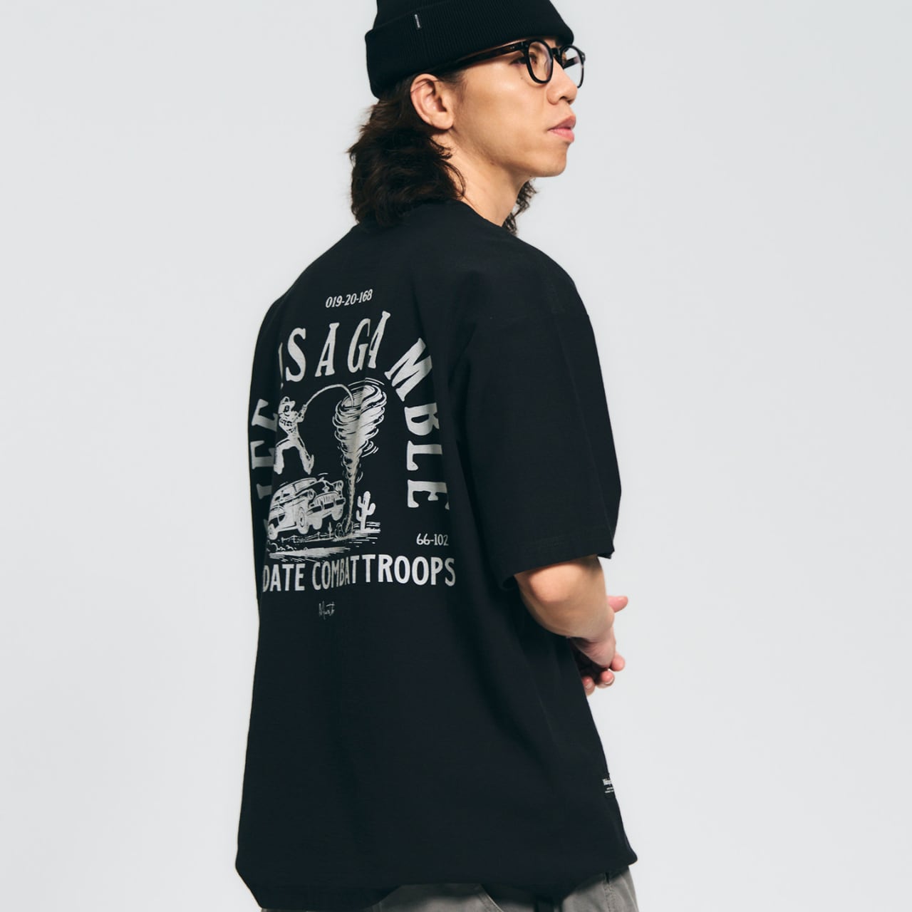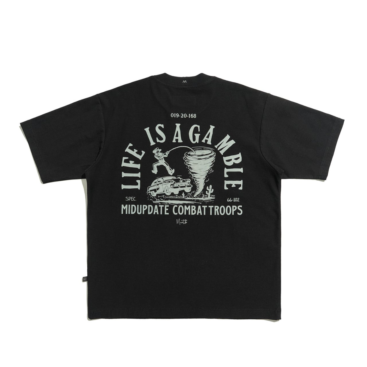 クラシックなウエスタンカルチャーを感じさせる、ヴィンテージグラフィックTシャツ。背面にはカウボーイ、車、竜巻、サボテンを組み合わせた大胆なグラフィックが配置され、「Life is a gamble」というメッセージが冒険心のある世界観を演出します。