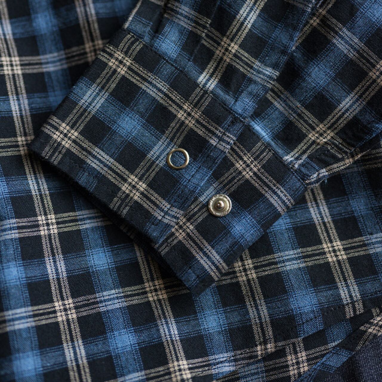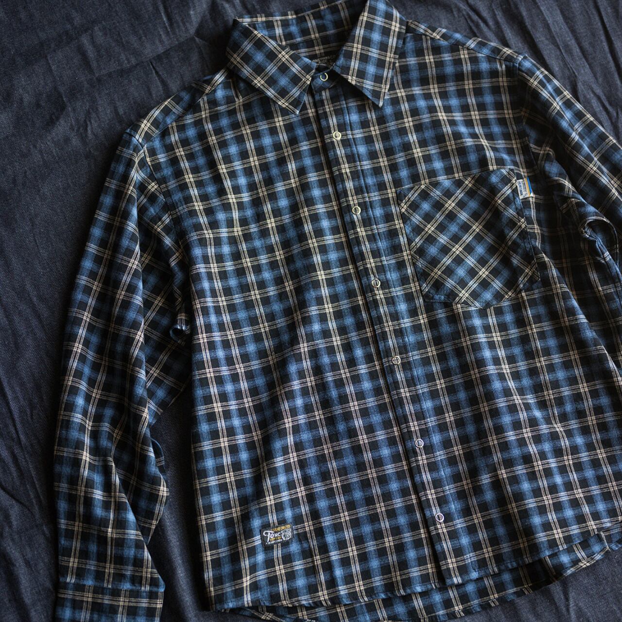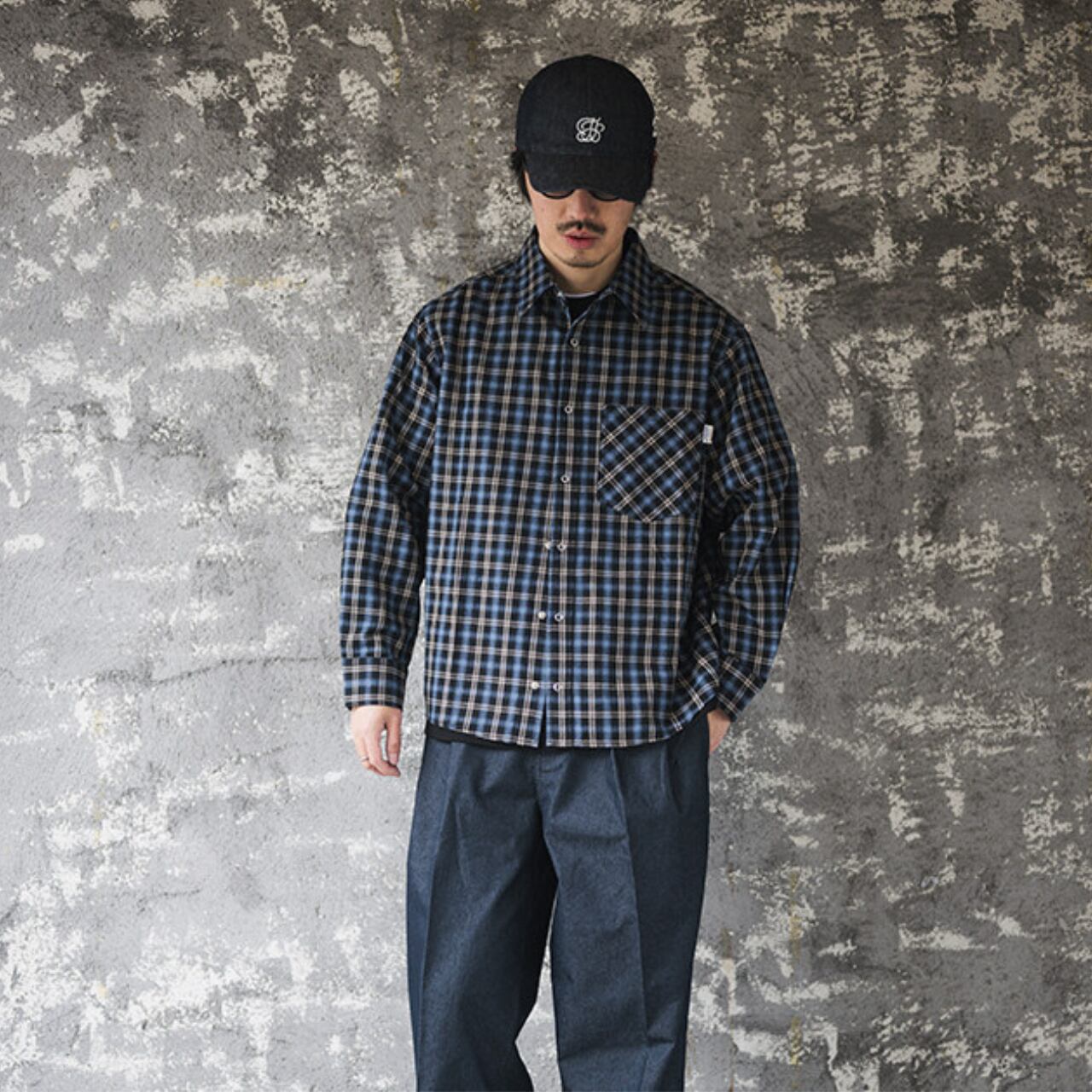 落ち着いたブラックをベースに、ブルーとベージュが自然に溶け込むグラデーションチェックが魅力のヴィンテージチェックシャツ。低彩度のカラーリングが大人っぽく、クラシックで奥行きのある表情を演出します。